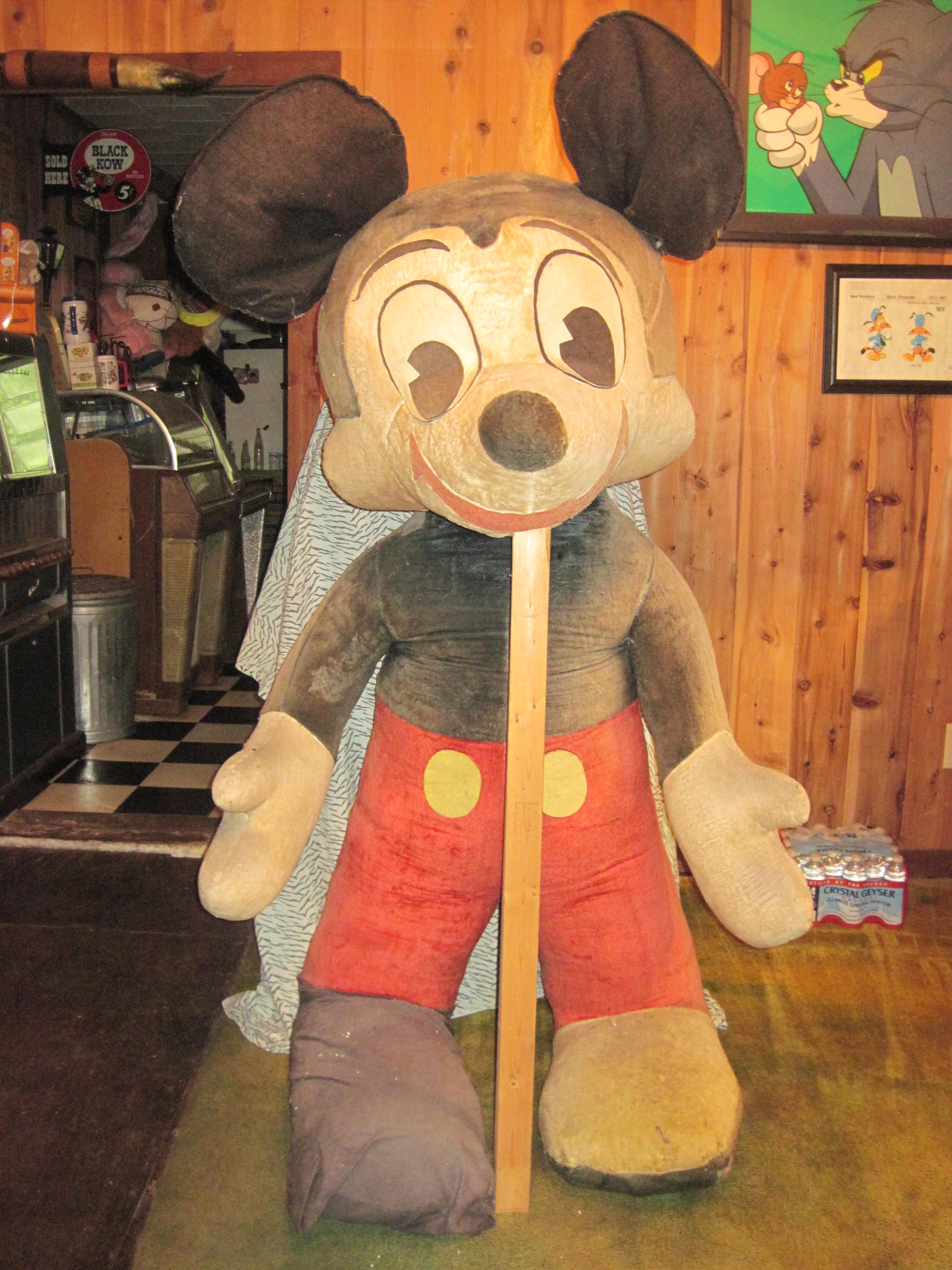 I bought this HUGE Mickey Mouse plush in the early 90's in Orlando in the Orlando Sentinel [newspaper] classified. He is 6 feet tall and heavy. He is stuffed with jute I believe? He is pie eyed (notch in the pupil) So that tells me it was made before 1940 or made to look that way. The stitching is irregular so that tells me it was had sewn/hand assembled. The head is droopy so I have a 2x4 propping it up. Any idea what the history on this is?