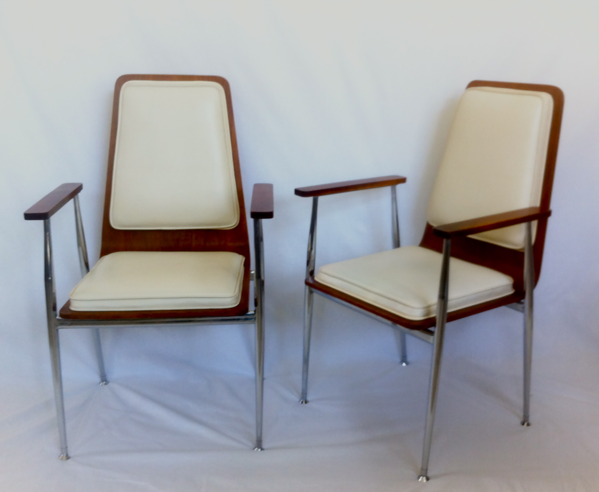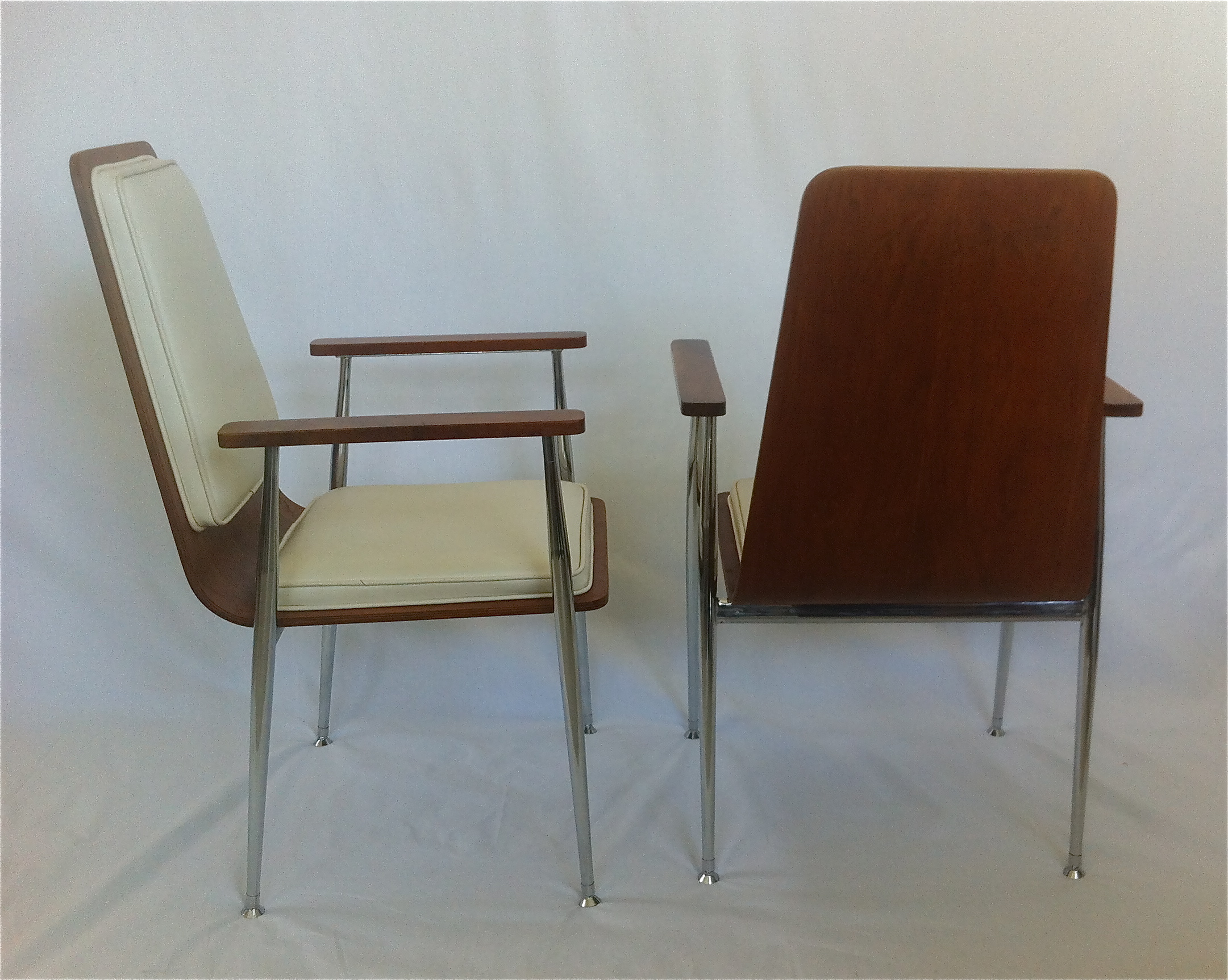 These two 1950’s bent plywood chairs have the original ivory vinyl upholstery. The frame is chromed steel, the legs are round and tapered. The arms are wood attached to the steel frame.