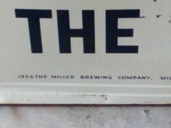 6'x8' porcelain Miller high life beer sign dated 1956. Good color, some rust. On a wood frame.