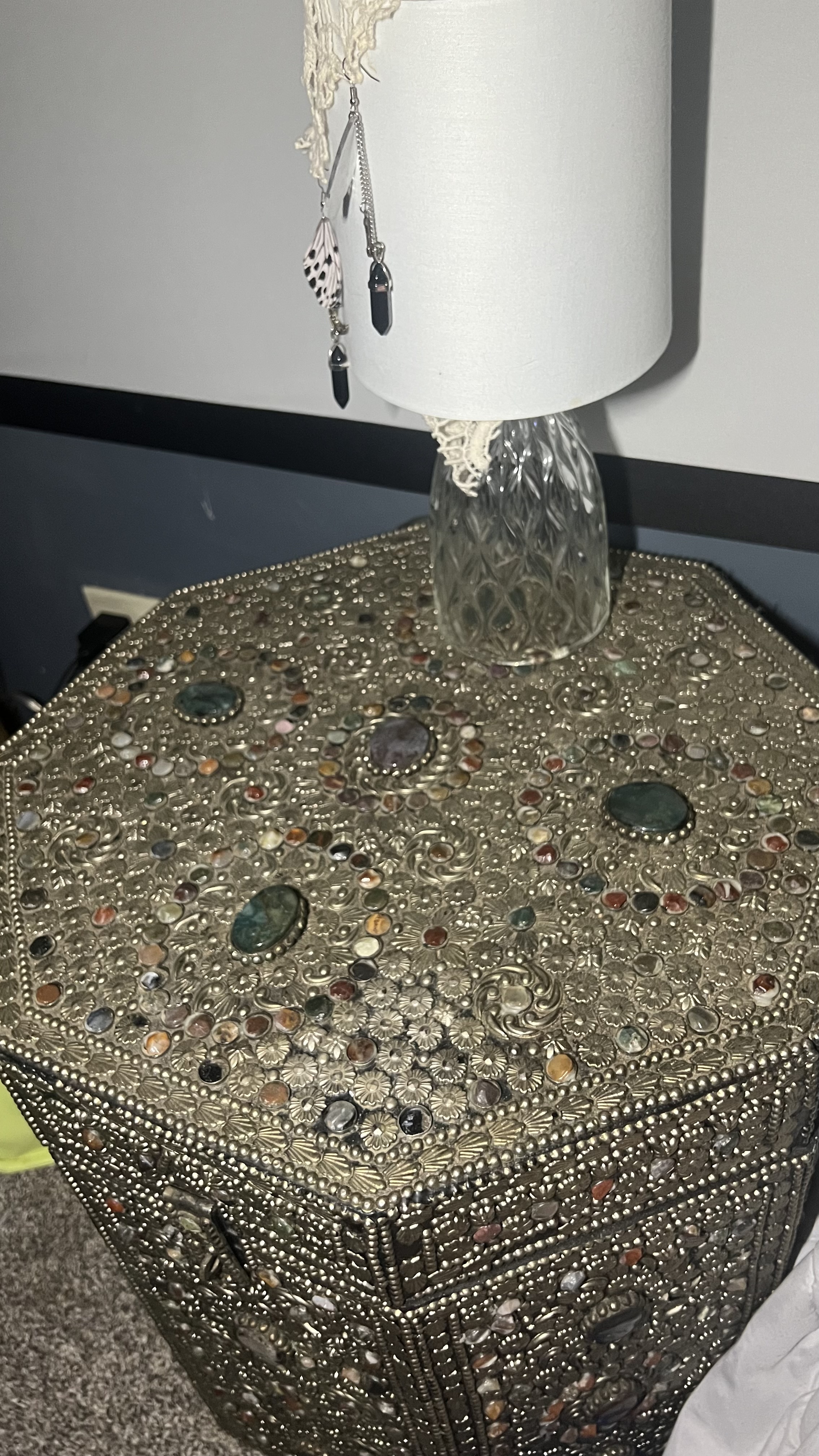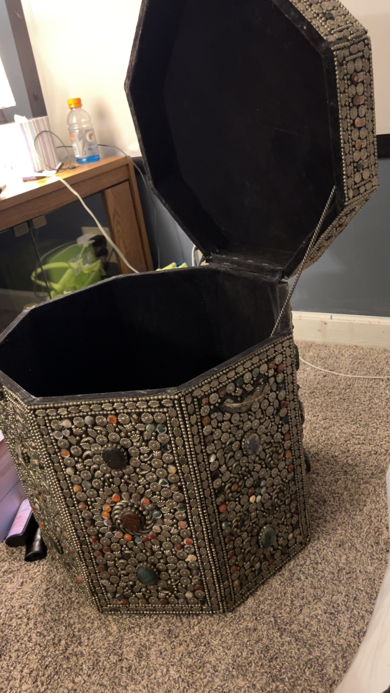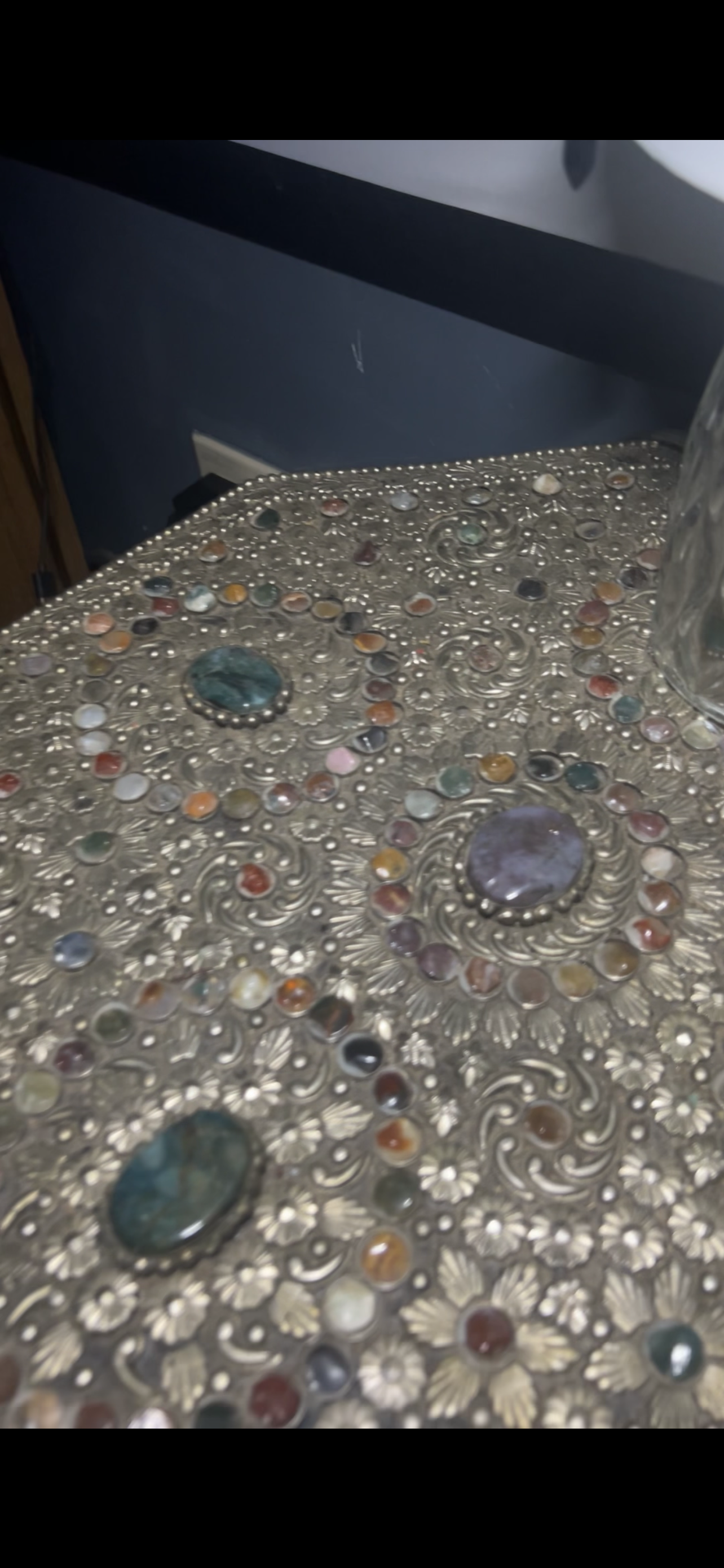 Vintage Moroccan Gemstone Inlaid Dowry Trunk. Made by Unknown (made in India). Dating to 20th century. Materials: Wood, silver/pewter filigree, semi-precious gemstones. Estimated value: $200 – $300. Condition: Good. Stable market for vintage decorative items with moderate demand.