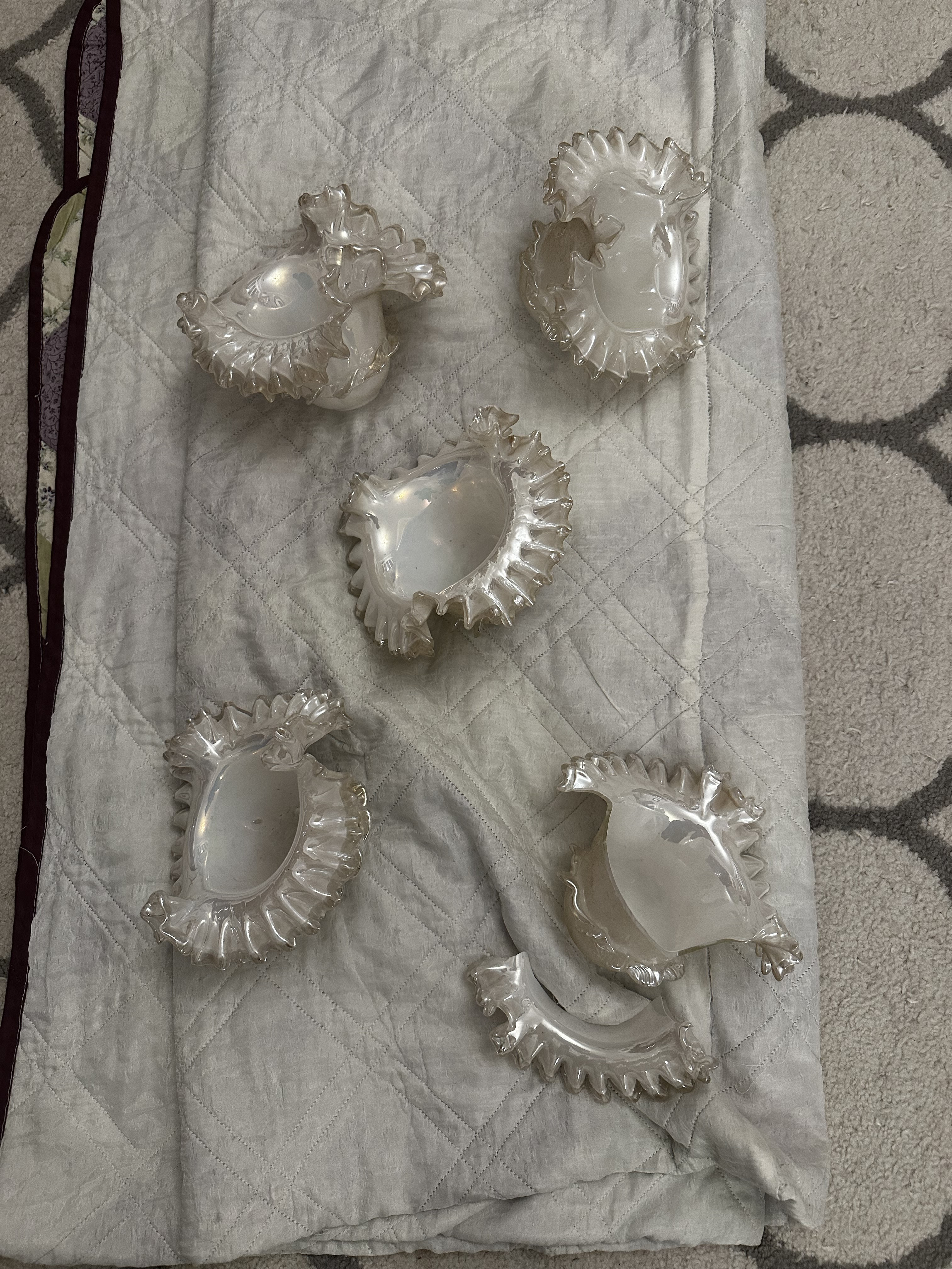 The chandelier is incomplete, missing at least one flower. This affects its value and collectibility, as complete sets are more desirable.