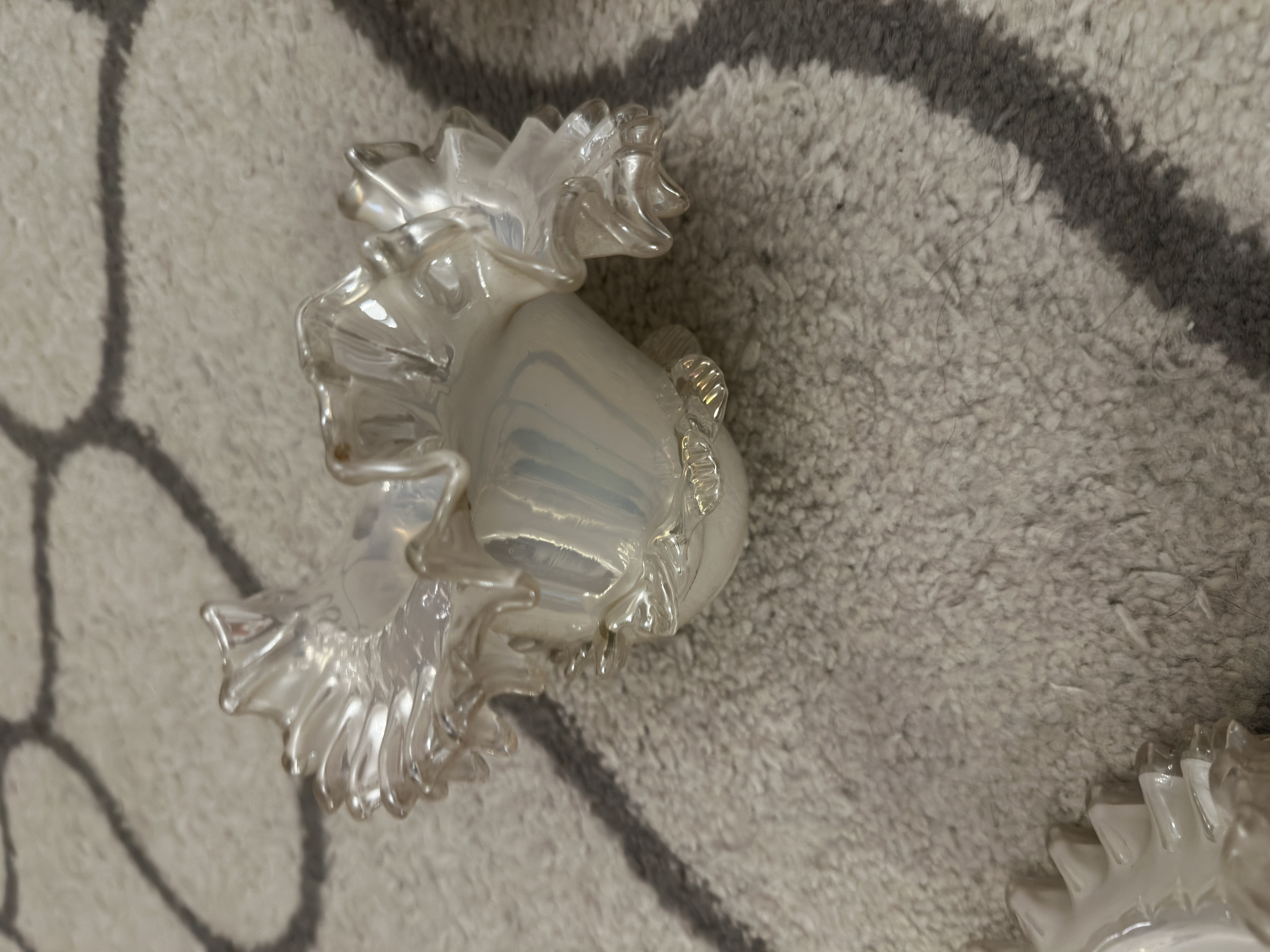 Description: This vintage Murano glass chandelier features eight arms adorned with delicate glass flowers. The chandelier is primarily white with iridescent qualities, showcasing the craftsmanship typical of Murano glass. One of the glass flowers is broken, and the chandelier requires cleaning due to dust accumulation.