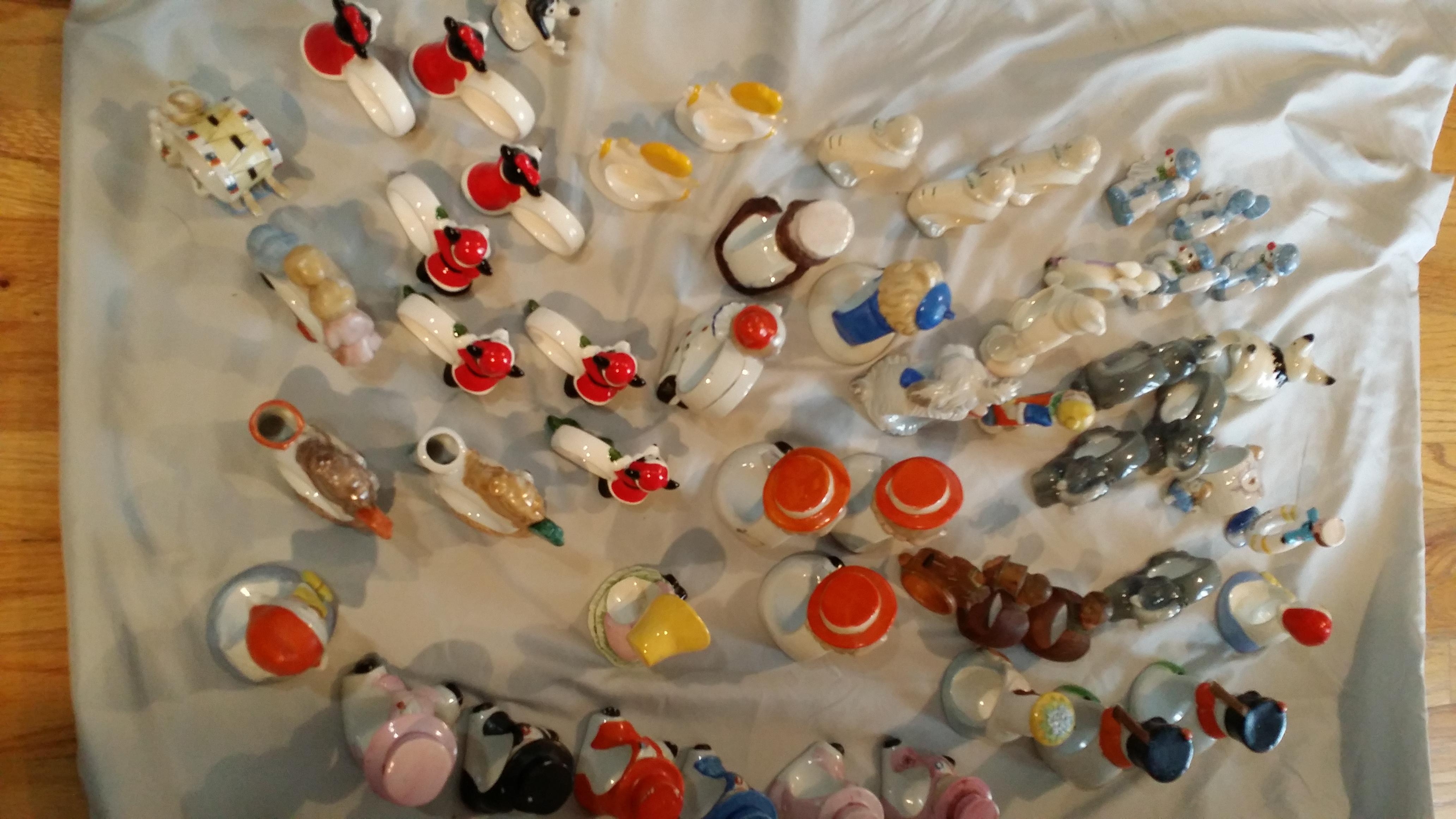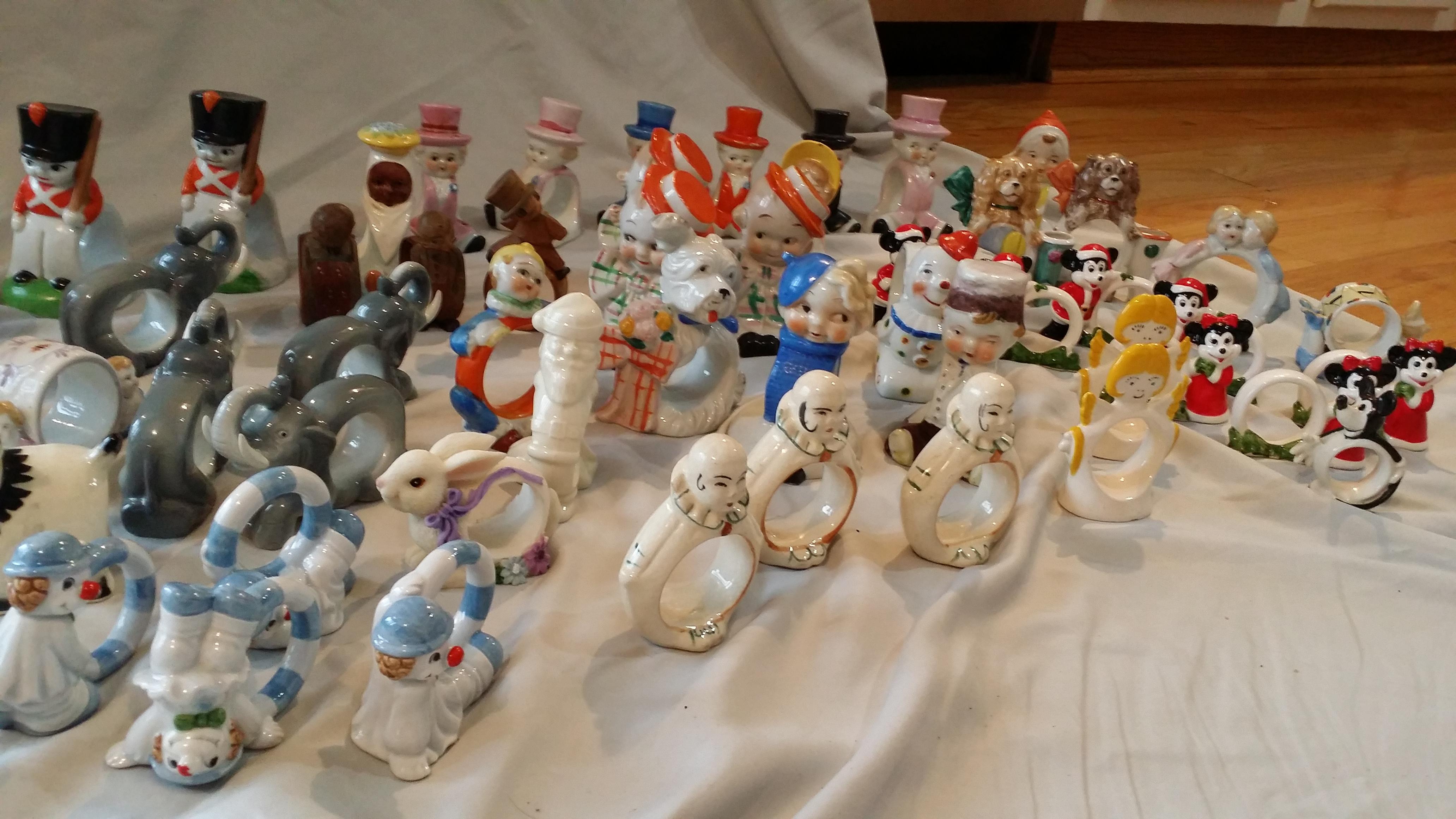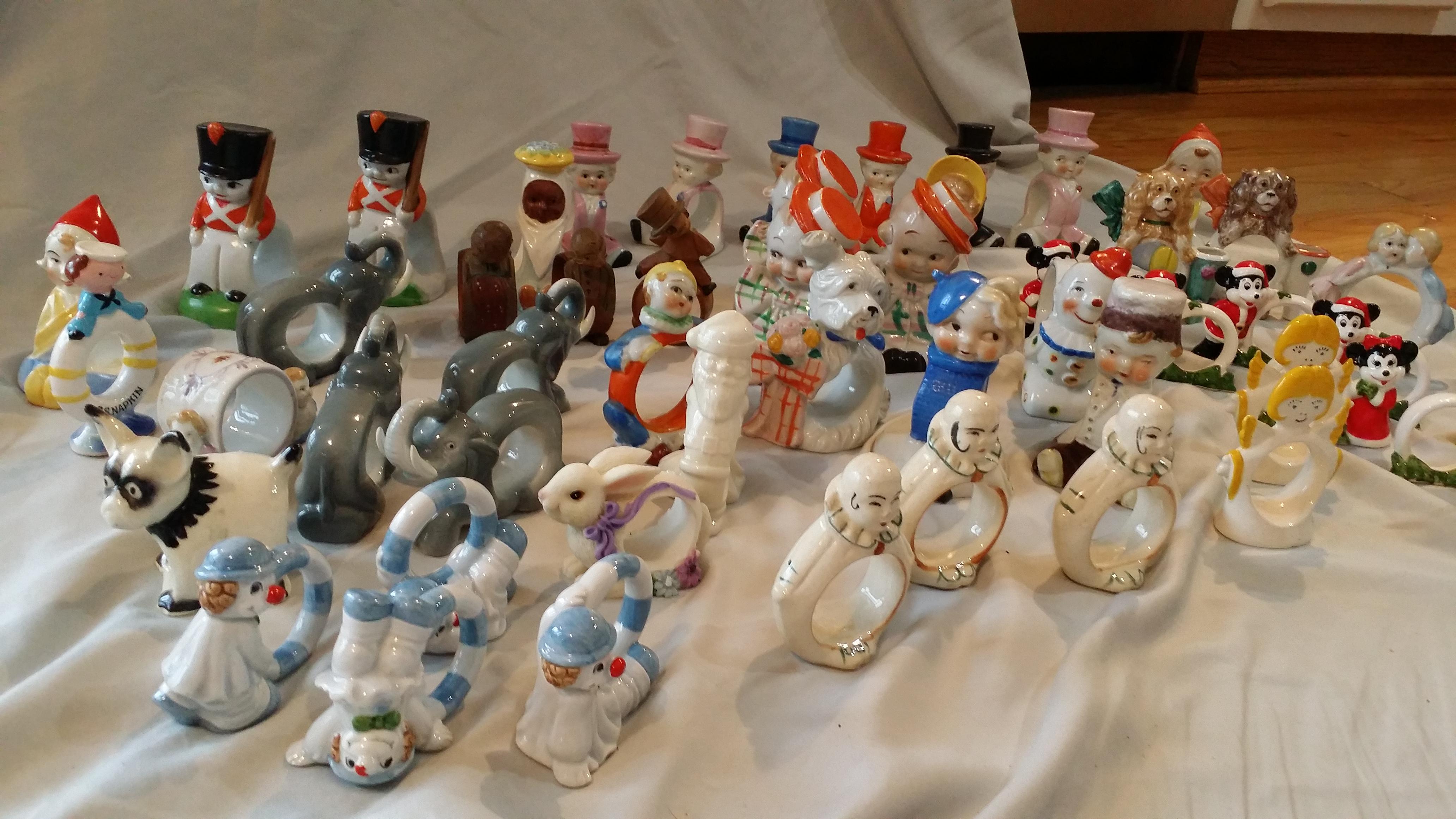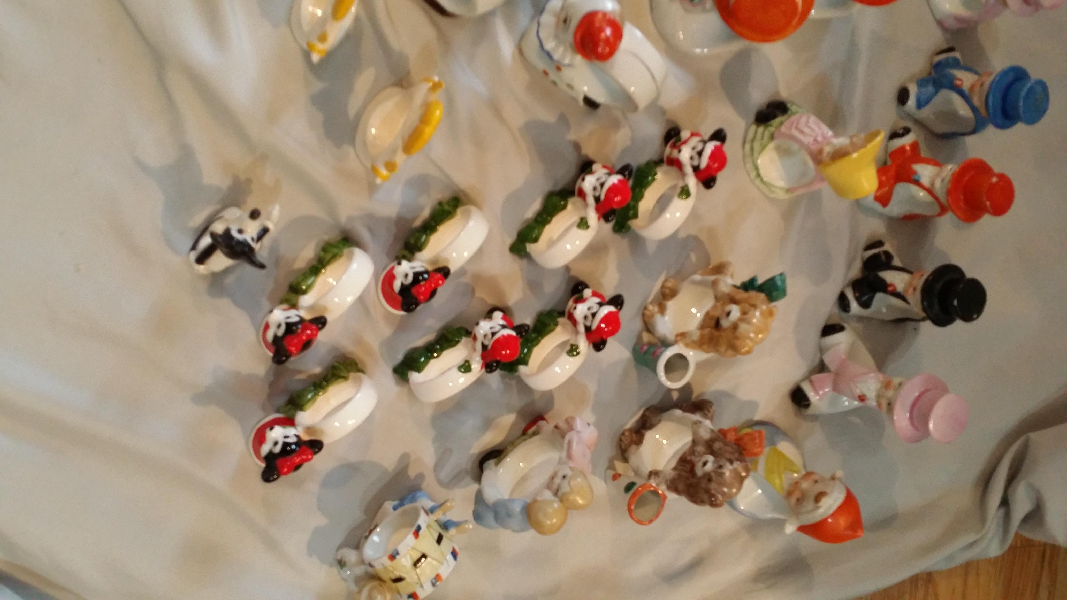 Variety of napkin ring holders mostly made in Japan. Fitz and Floyd clown Napkin ring holds all in great condition.