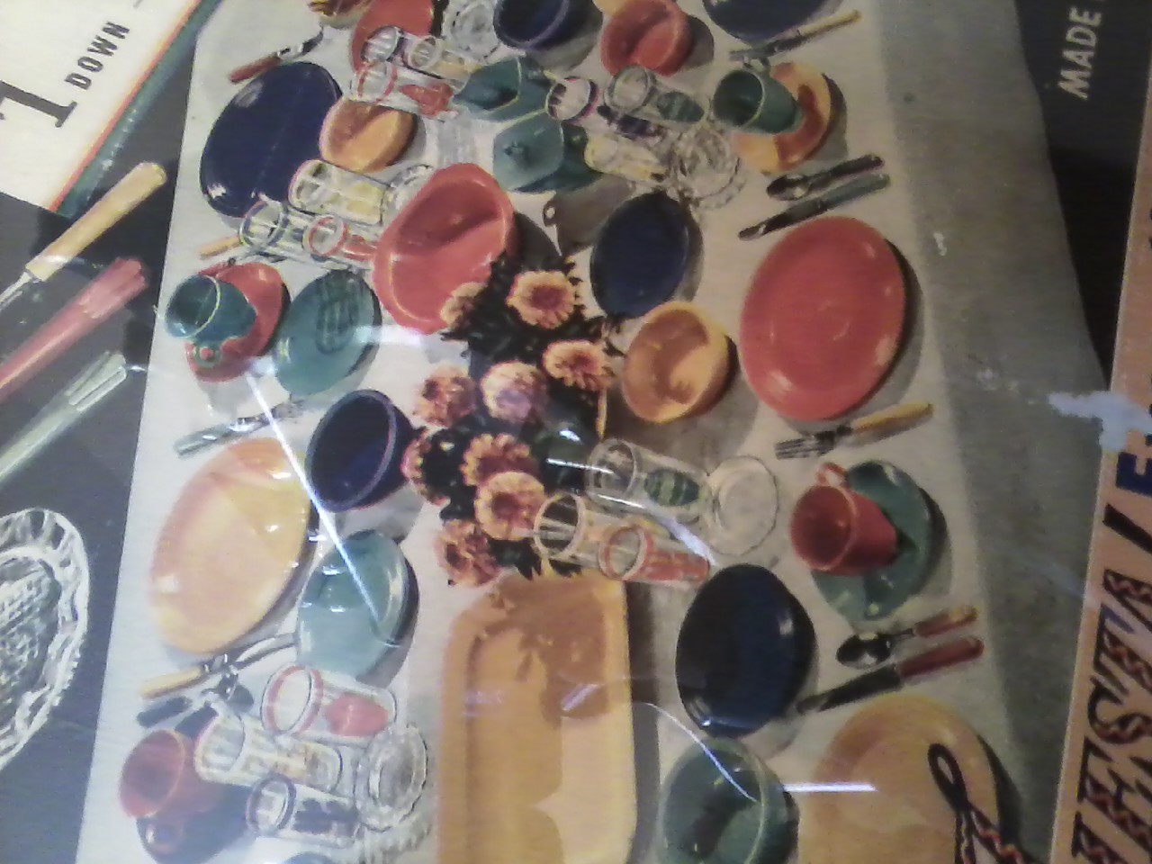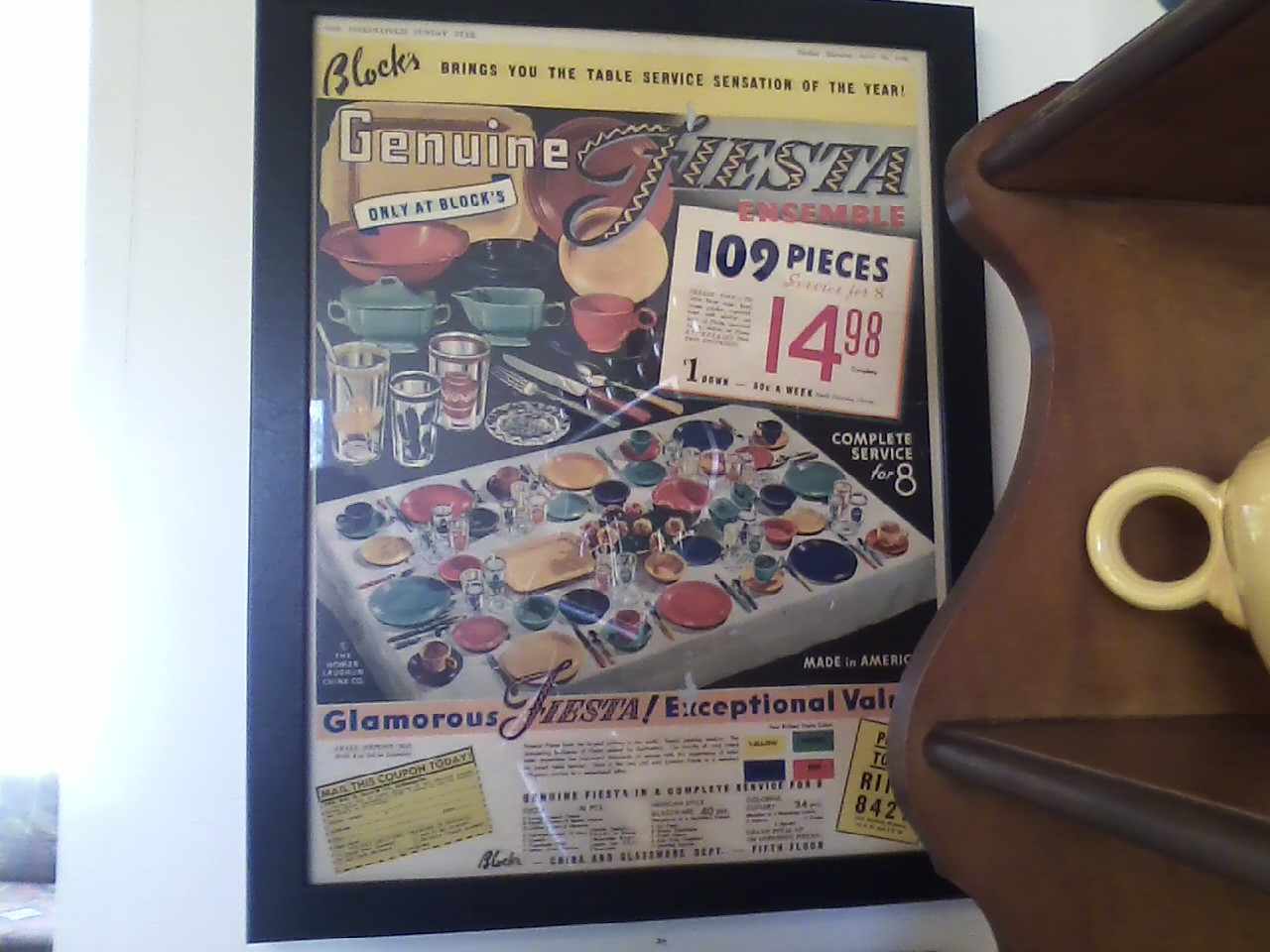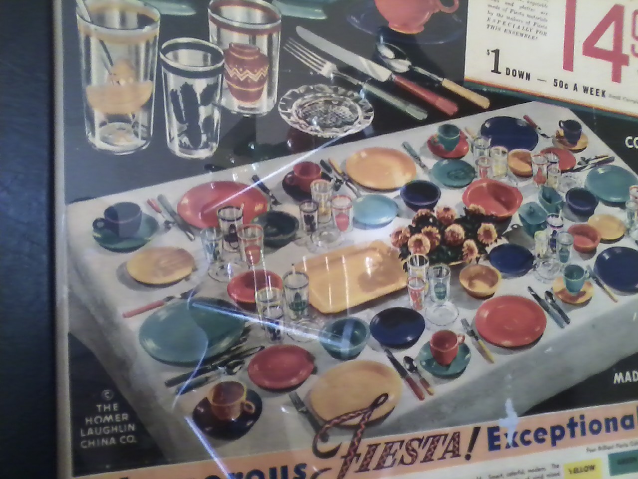 ware promotional offer made by Block's Department Store, featuring a 109 pc. tableware service for 8 which sold for $14.95. It's in great shape with bright, sharp colors, but has 2 small flaws: as it had been stored folded for decades, some kind of little critter must have nibbled at one of the folded creases, with the result that two small holes appear when the page is unfolded, one near the top, one toward the bottom. I've had this framed with non-acidic backing, so the holes, which are about 1"x 1/8" in size appear slightly lighter in color than the surrounding area. I have taken photos, which have some reflection, but again, this item has no other flaws except the ones I described above; it is over 7 decades old and is beautiful! I understand these are rare, and would like to get some idea of it's value, as we might want to add it to a group of other vintage items we plan to insure. I tried researching online and only came up with a reprint auction on ebay. Thanks!
