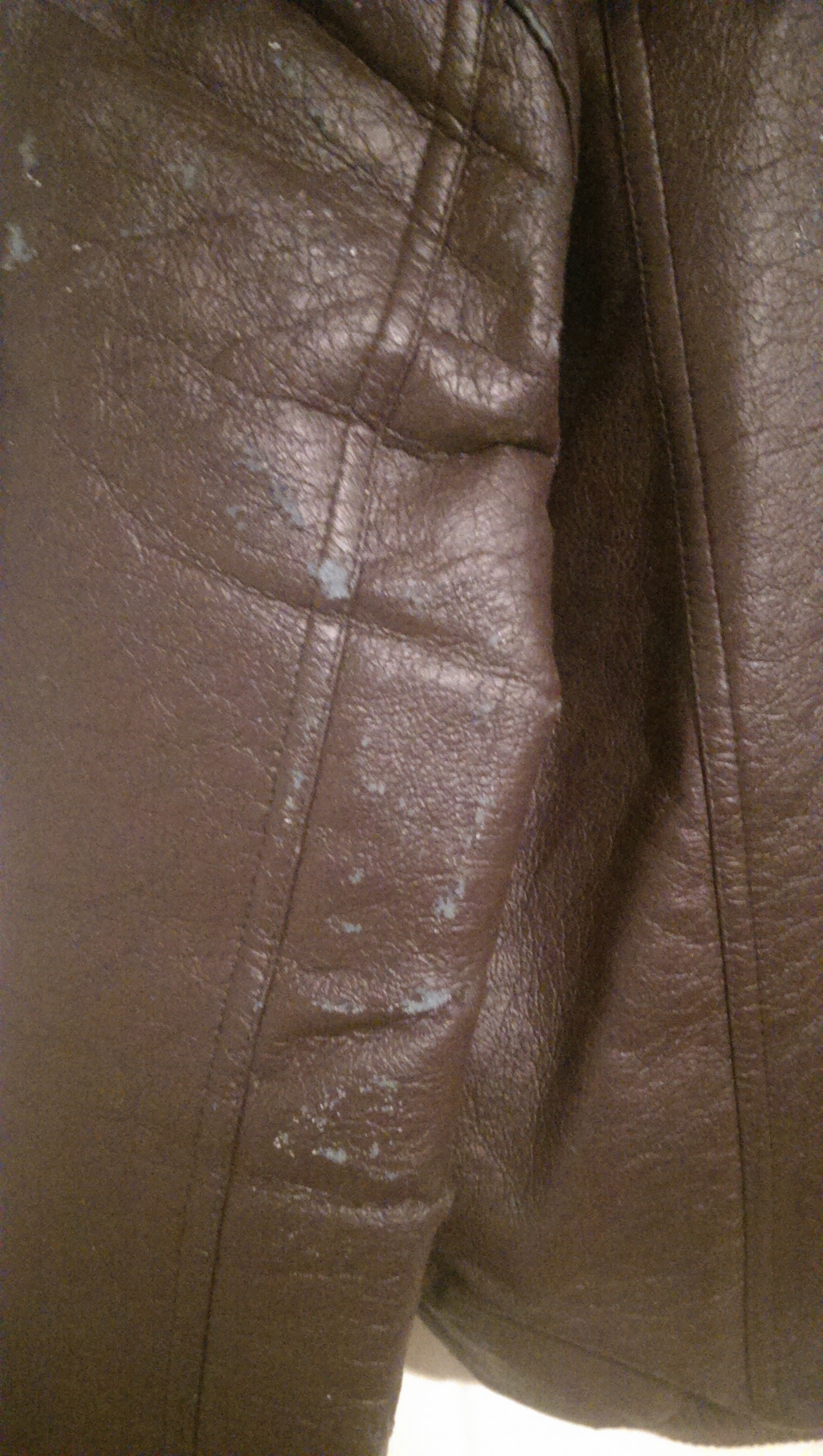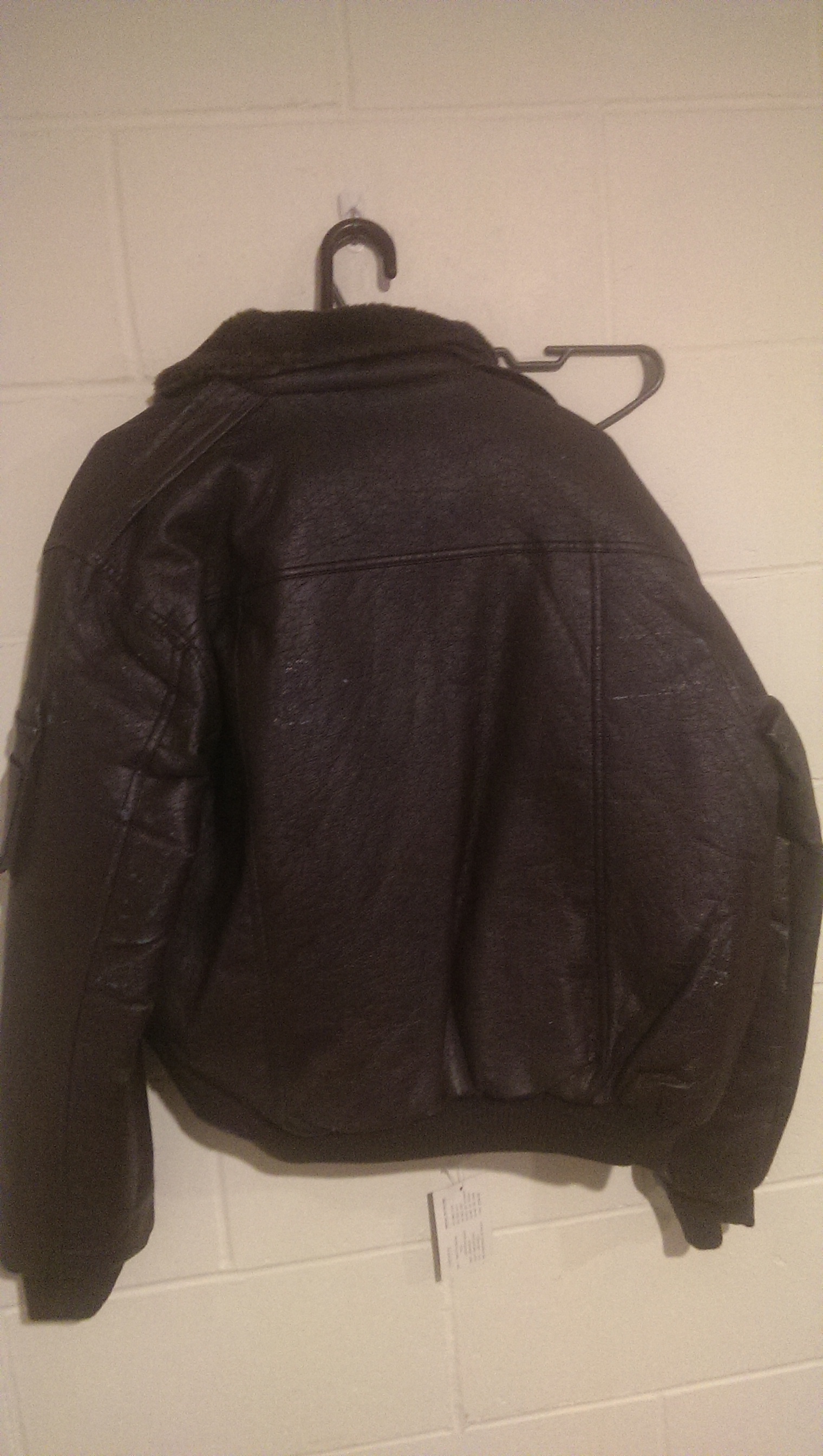 Landed this gem at a thrift shop... Goodyear Swingster Bomber coat with the tags still on the zipper! Thing was in *PERFECT* shape....until I got ahold of it. (Painted my enclosed trailer on Friday, then Saturday afternoon I hung this on the coat rack in there...well, it stuck. You can see a few spots on the back where the vinyly-pleather stayed on my wall.)