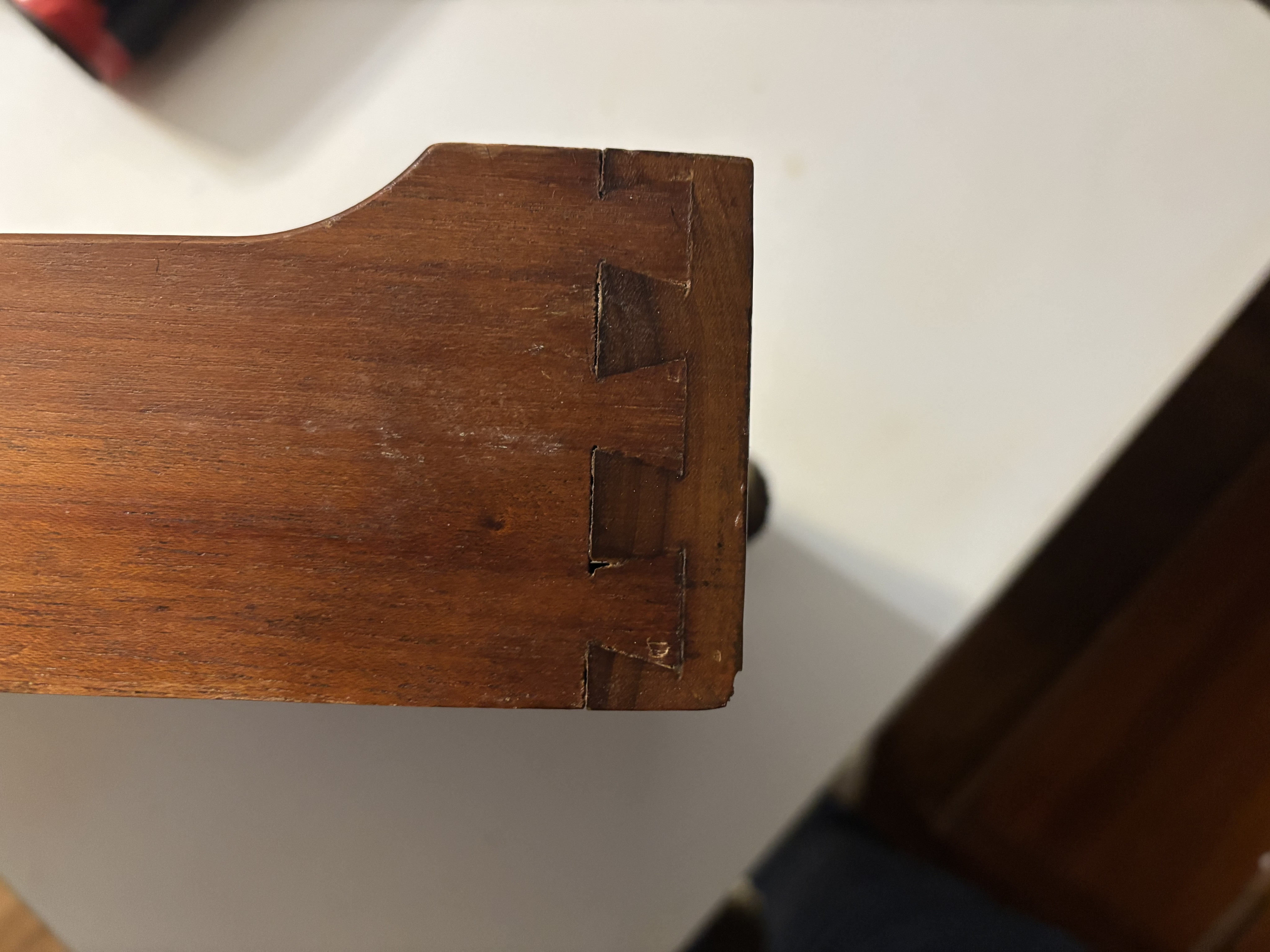 Look for the signature on the underside of the drawer as a potential authentication marker. The dovetail joints are also a sign of quality craftsmanship. If the signature is legible, professional authentication may be recommended to confirm the maker and age.