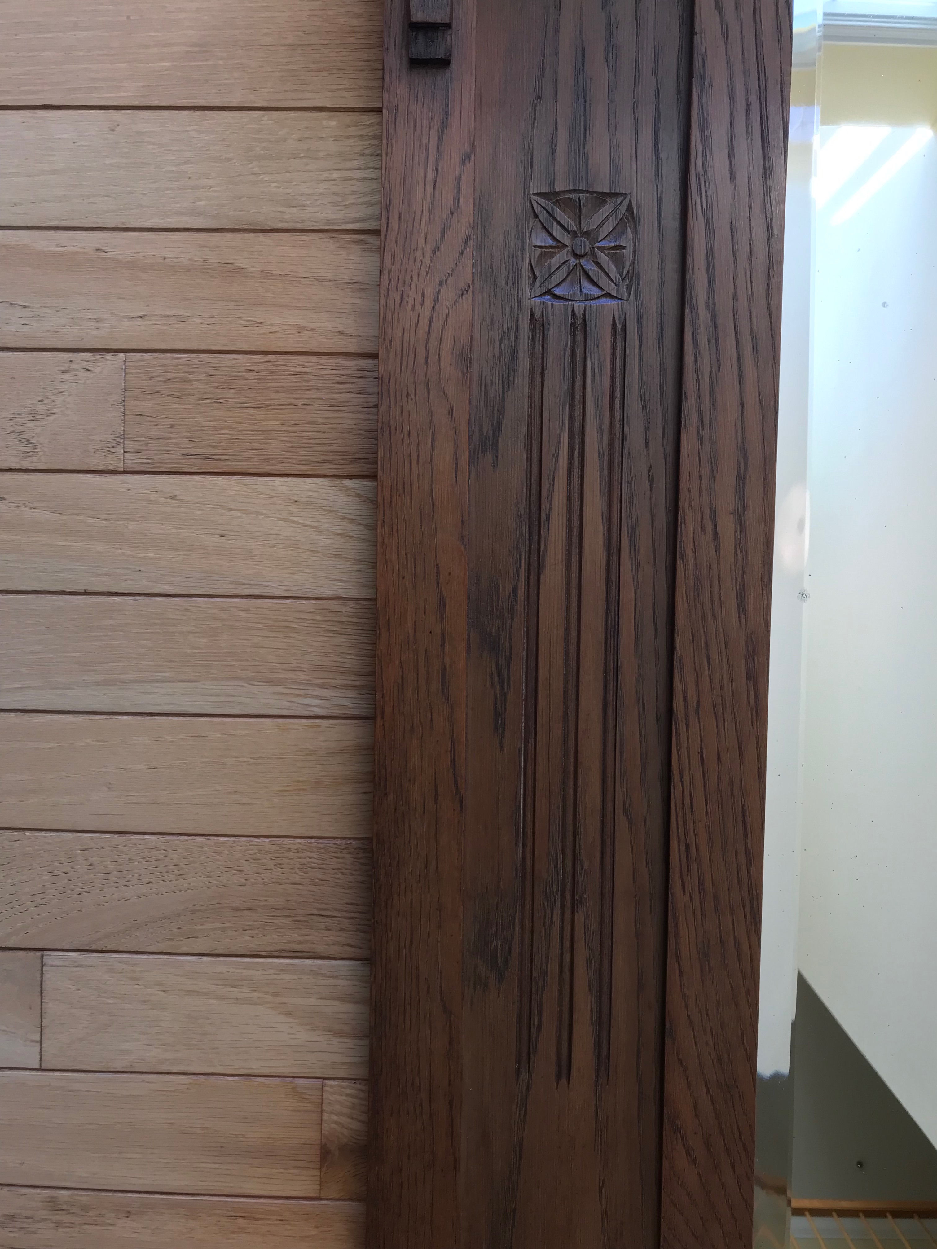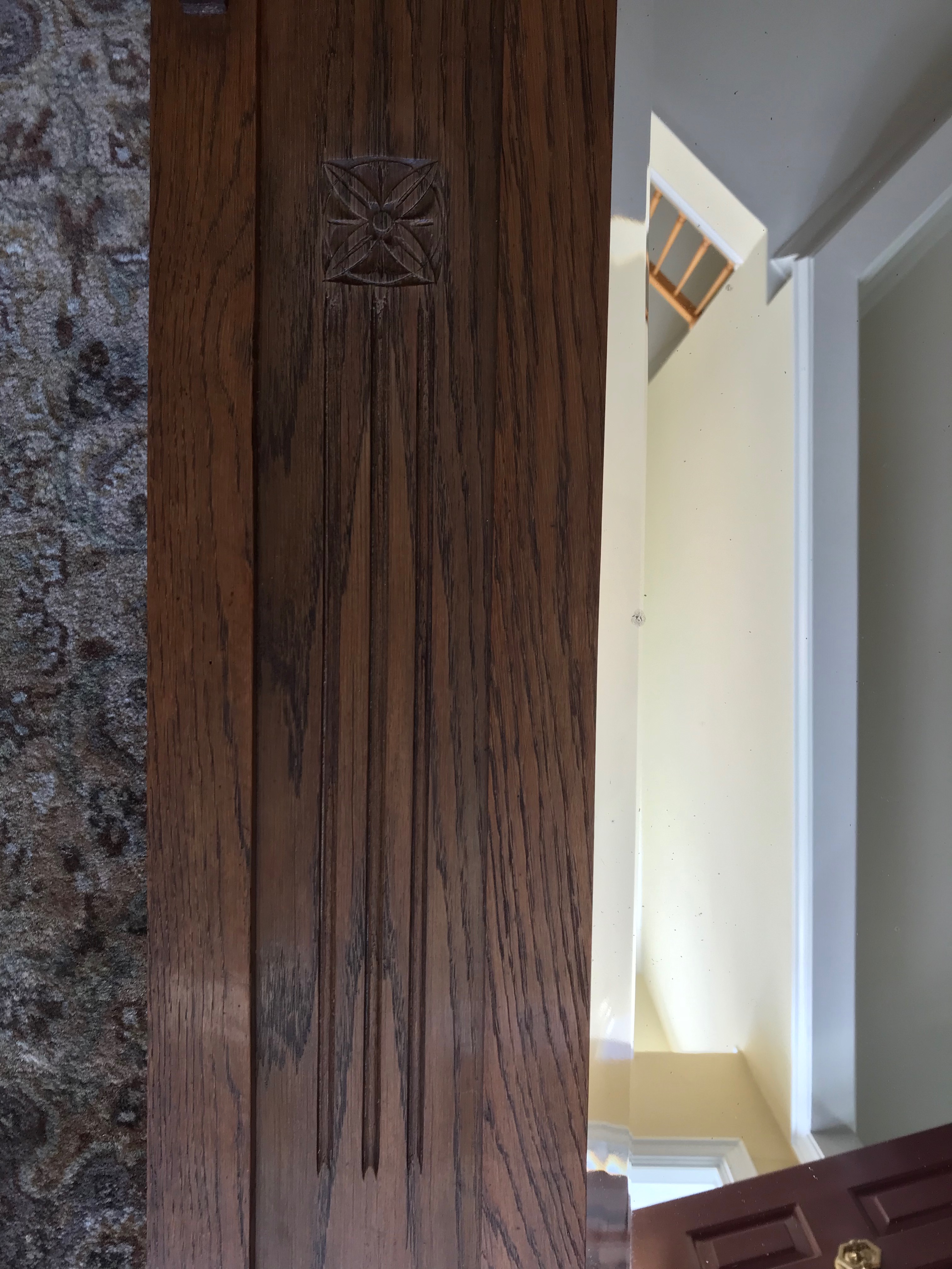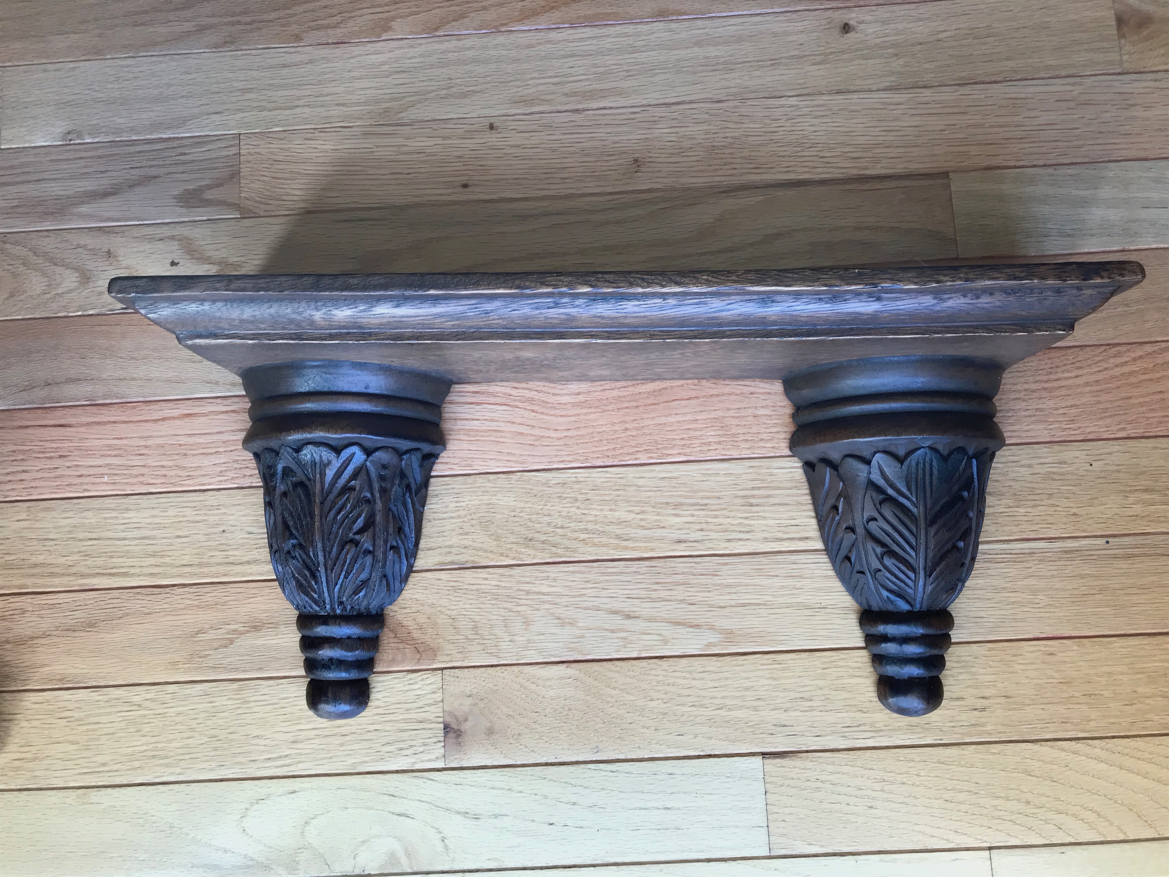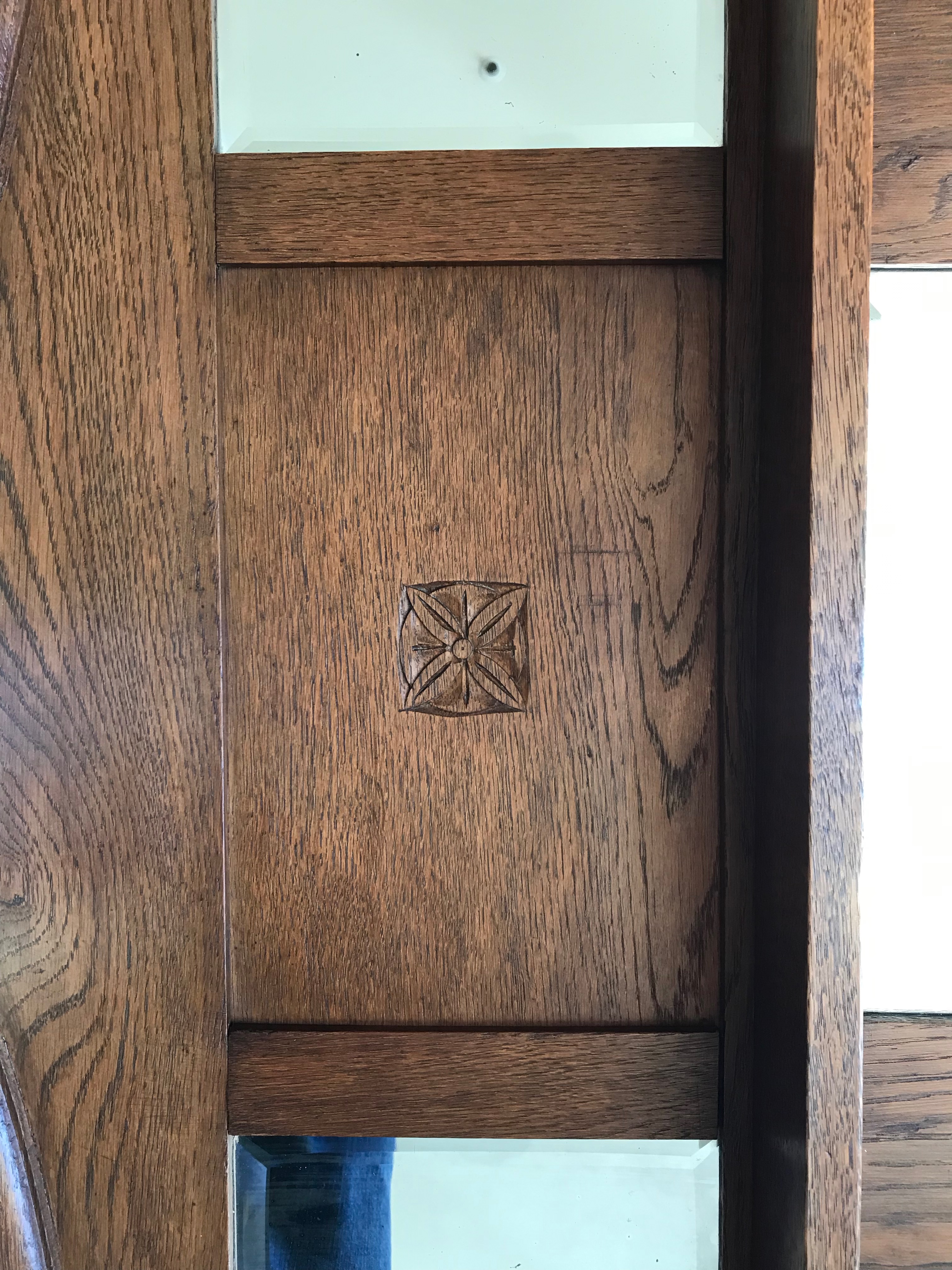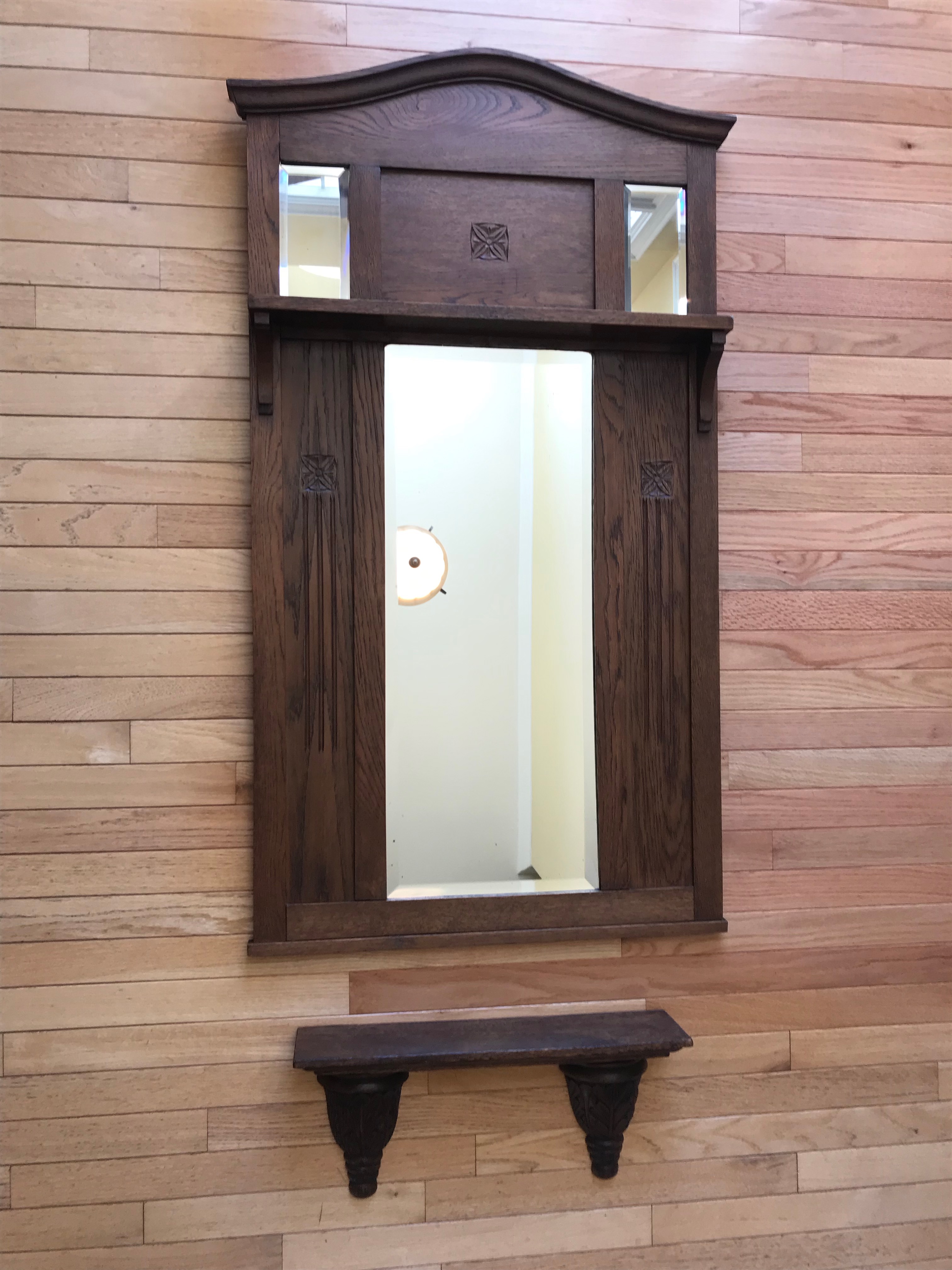 Entryway or hallway oak mirror. Three beveled mirrors, three carved florets & other decorative carvings. Curved top. Notice connecting pieces/keys on both sides of top. Shelf below may / may not have been part of an original set.