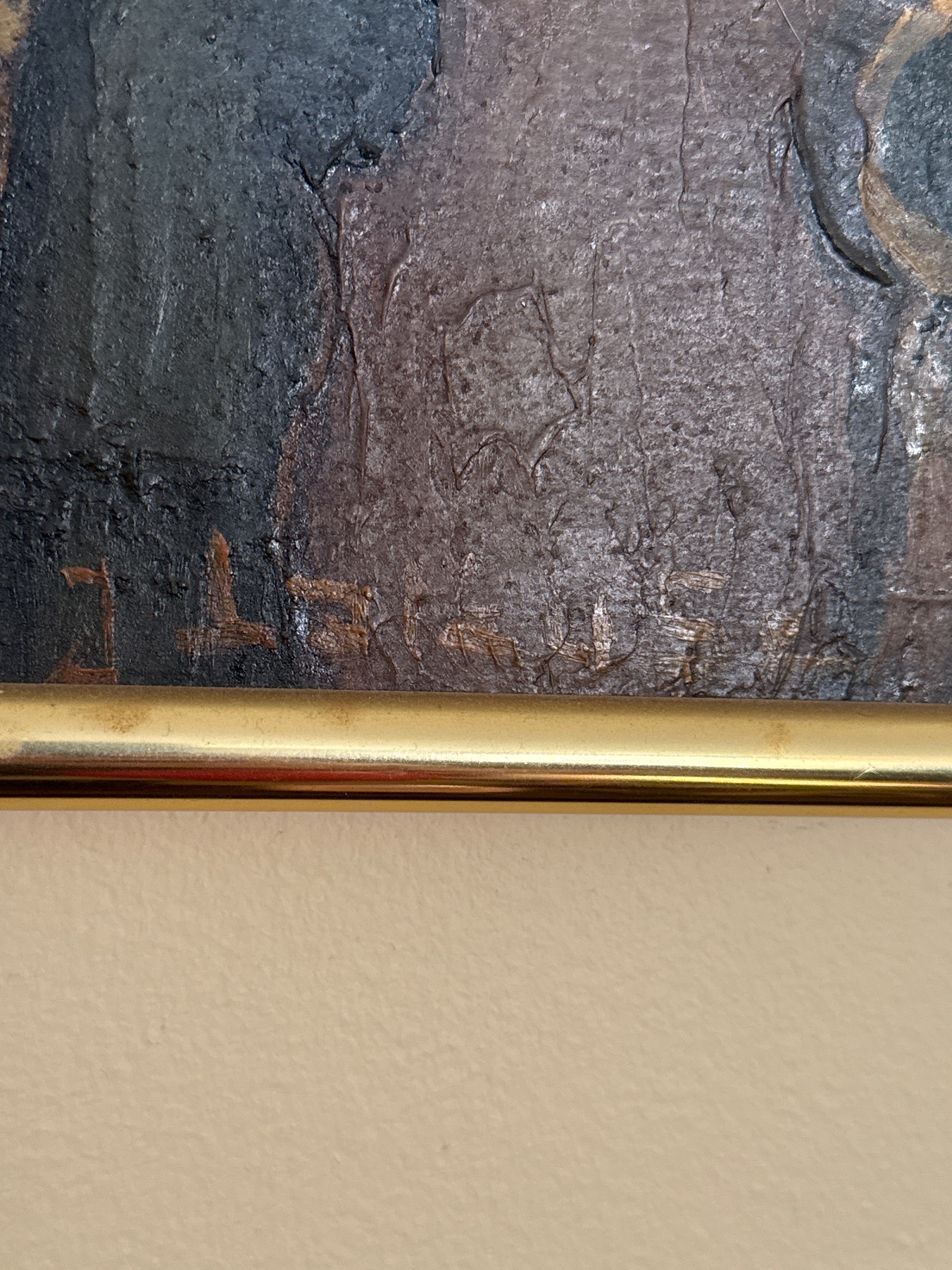 Condition Assessment: The painting is in fair condition, with some signs of wear consistent with age. There are minor scratches on the surface and some areas of paint loss, particularly in the darker sections of the canvas. The frame shows slight wear, with a few scuffs and scratches, but remains structurally sound.