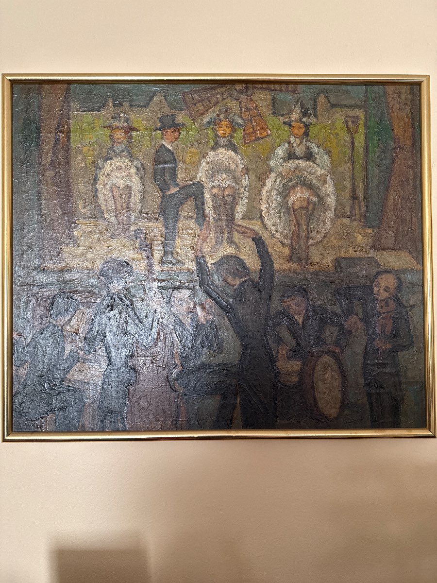 Interesting Facts: The painting's depiction of performers may evoke nostalgia for the golden age of theater and music. The vibrant colors and lively scene can serve as a conversation starter, reflecting the cultural trends of the time. Additionally, the signature may provide clues to the artist's identity, which could further enhance the painting's value if researched.