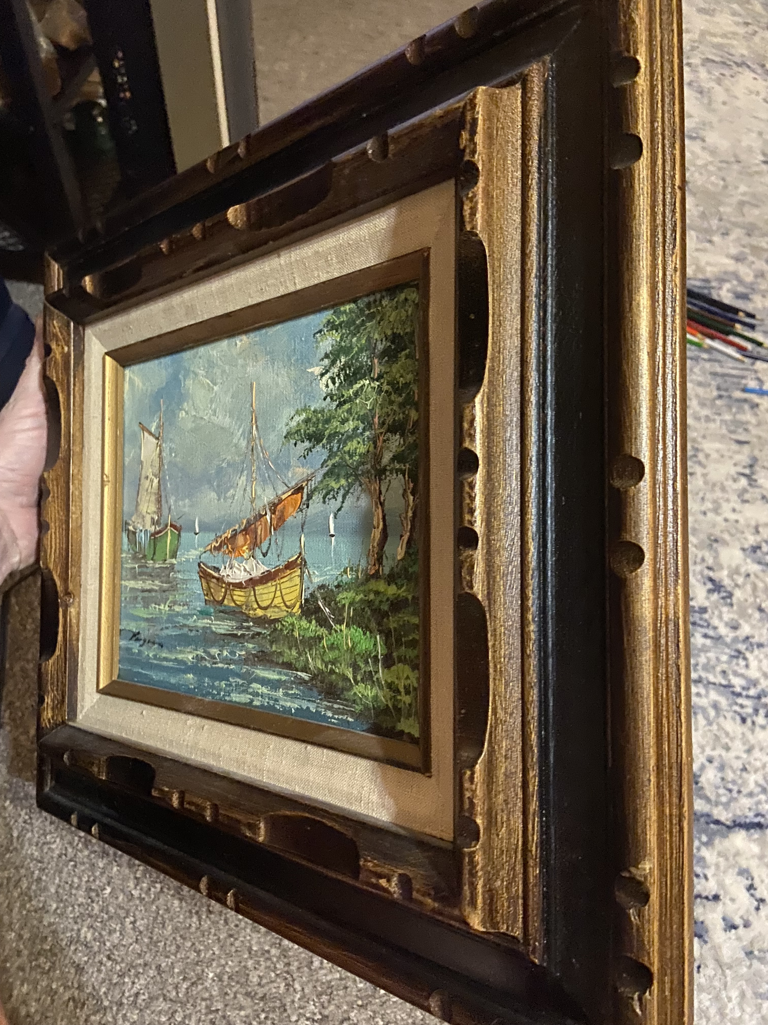 Physical Description: This vintage oil painting features a coastal scene with sailboats in a bay. The artwork is framed in a high-quality, carved wood frame with a linen liner and gold accents. The overall dimensions, including the frame, are approximately 18" × 15". The medium used is oil on canvas, and the painting is signed by the artist in the lower corner.