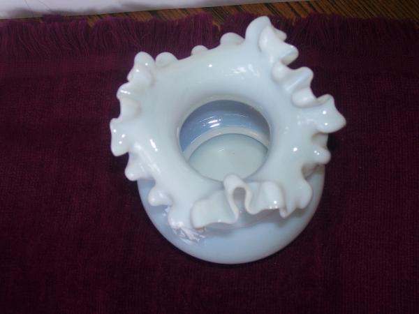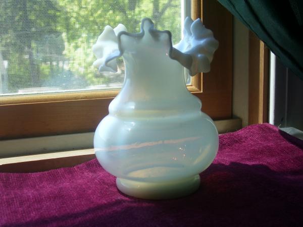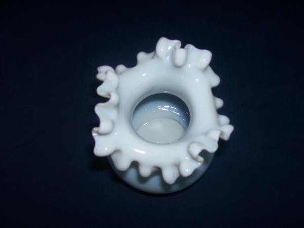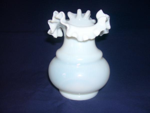 This vase is a blown all white opalescent vase with double ruffles at the top. There are no maker marks or signature. There are no chips, cracks or any other damage to the piece. There are tiny bubbles in the glass noticeable in the bulbous portion of the vase.