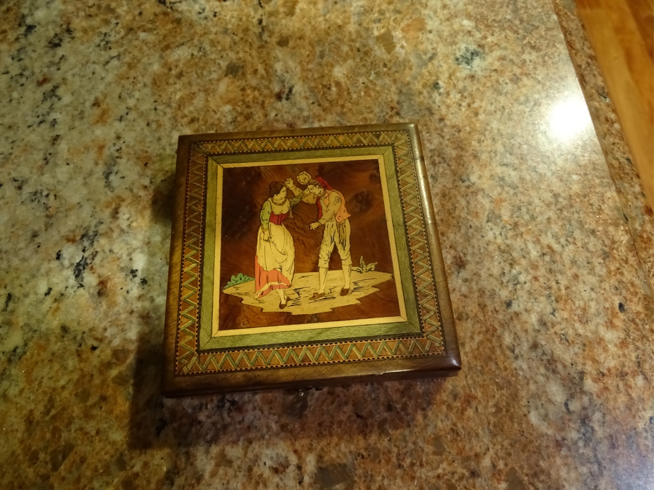 4.25 " square wooden box that opens with 15 small squares with numbers on them and one blank space. Appears to be a slide puzzle. The front of the box has either an engraved or painted picture of a man and woman dancing. They appear to be from colonial age??