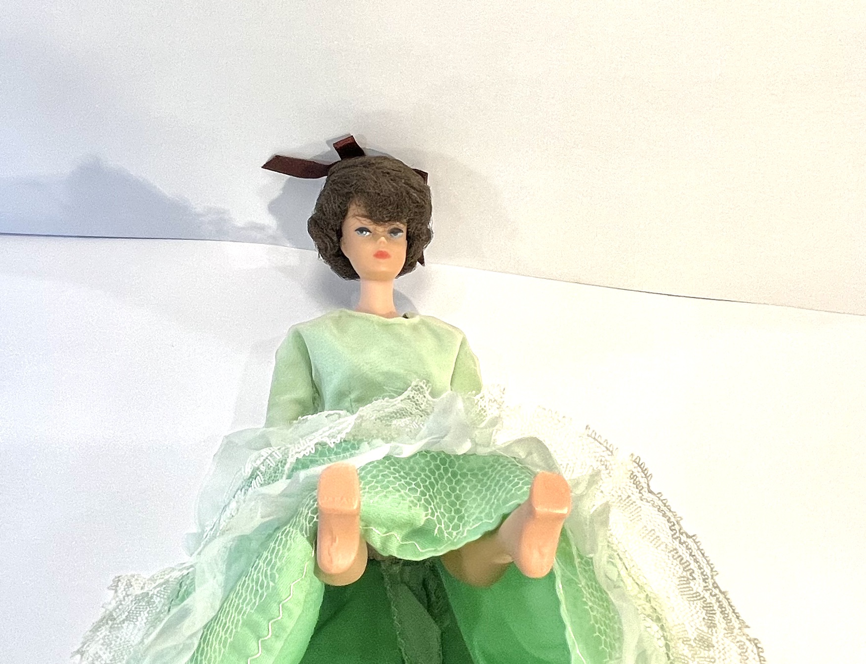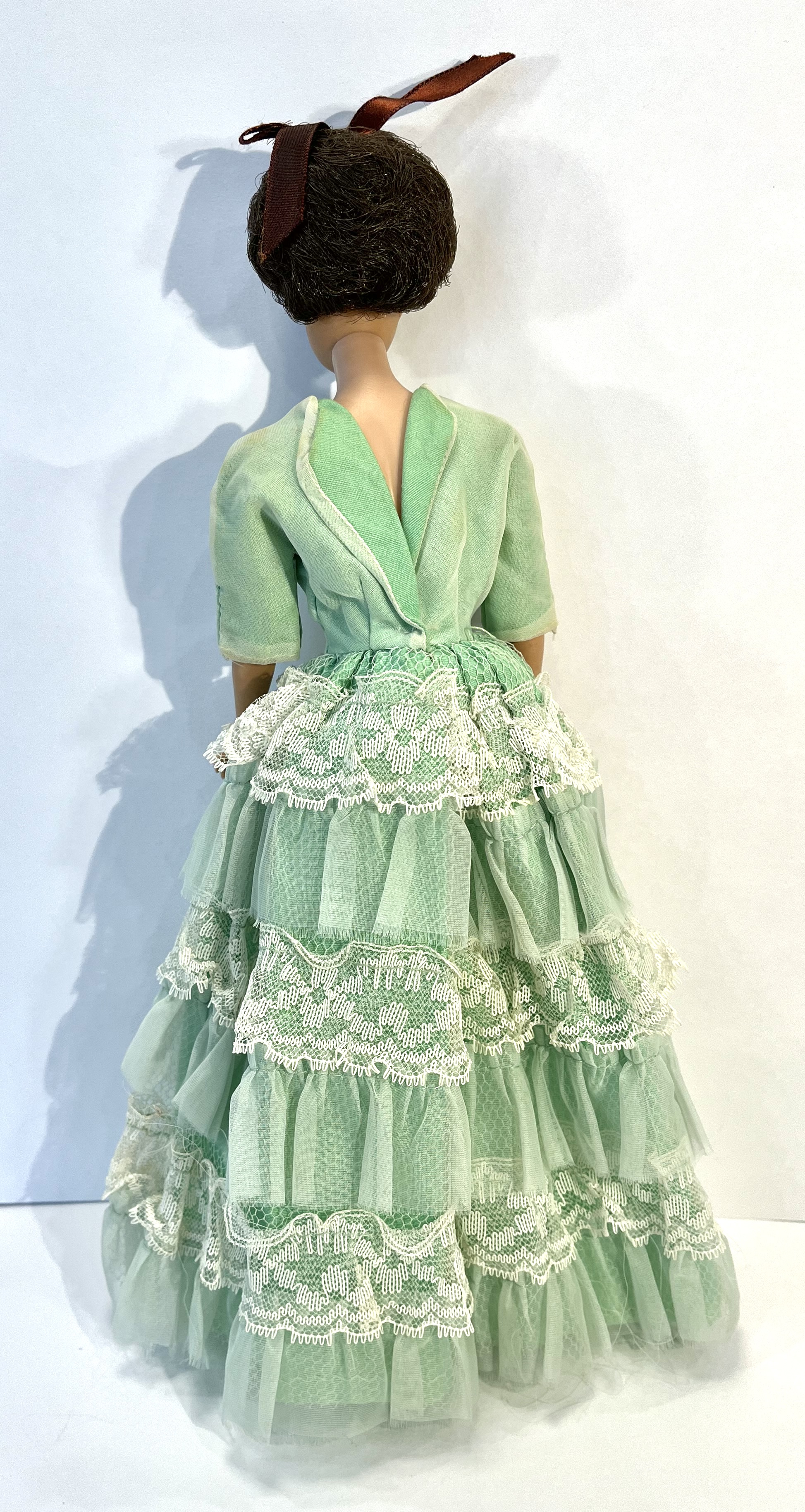 !962 Raven Bubblecut Barbie doll in excellent condition wearing a hand sewn Southern Belle gown with a crocheted navy blue shall with panties but no shoes.