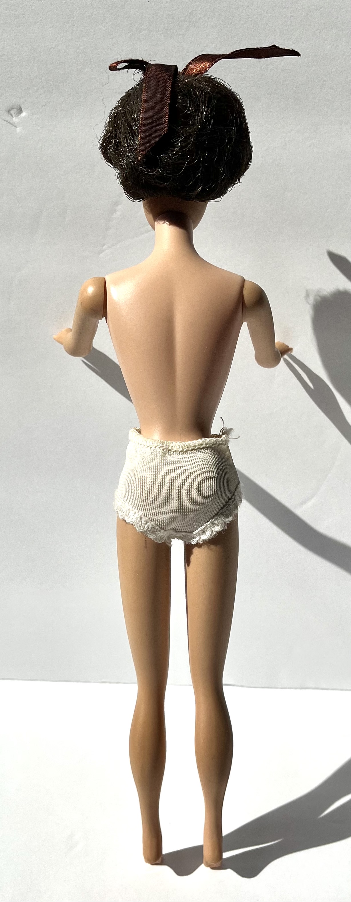 Physical Description: This 1962 Black Raven Bubblecut Barbie stands at 11.5 inches tall. She is made of plastic and is dressed in a hand-sewn Southern Belle gown featuring a crocheted navy blue shawl. The gown is complemented by a pair of white panties, but she is missing her shoes. The doll is marked "Midge-1962-Barbie-1958-By-Mattel, Inc.-Patented. Japan" on the right foot, indicating her production origin.