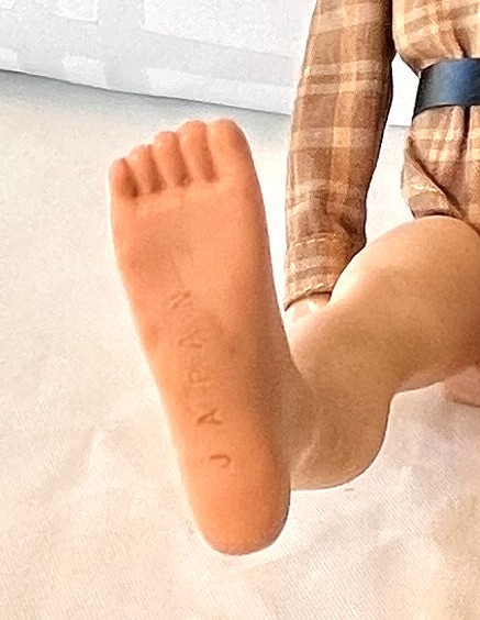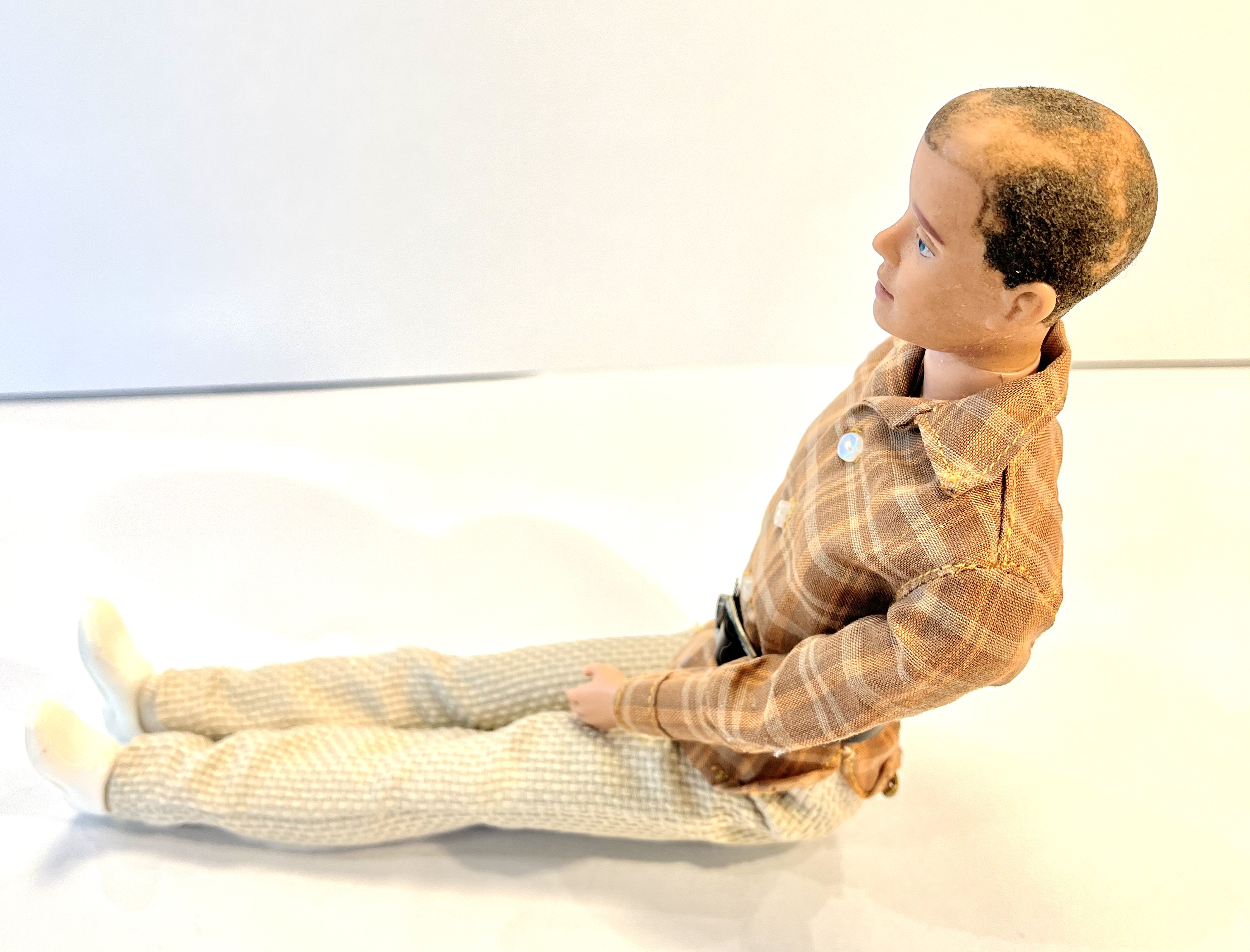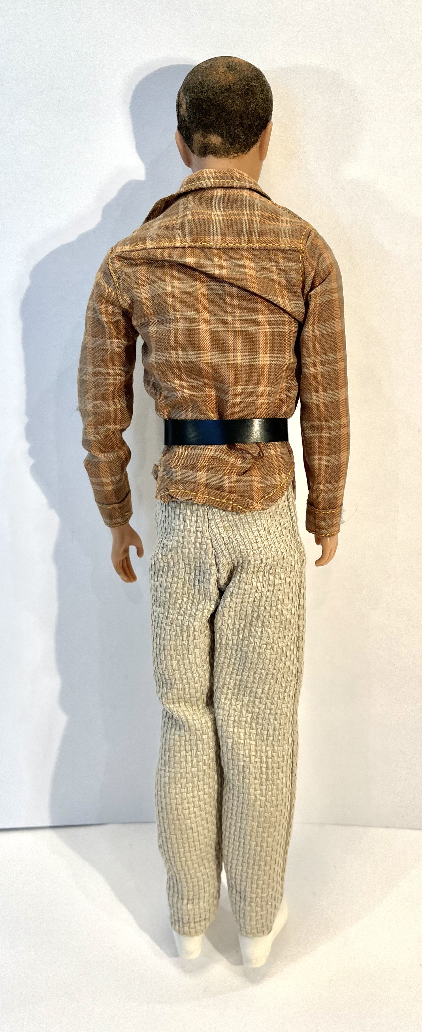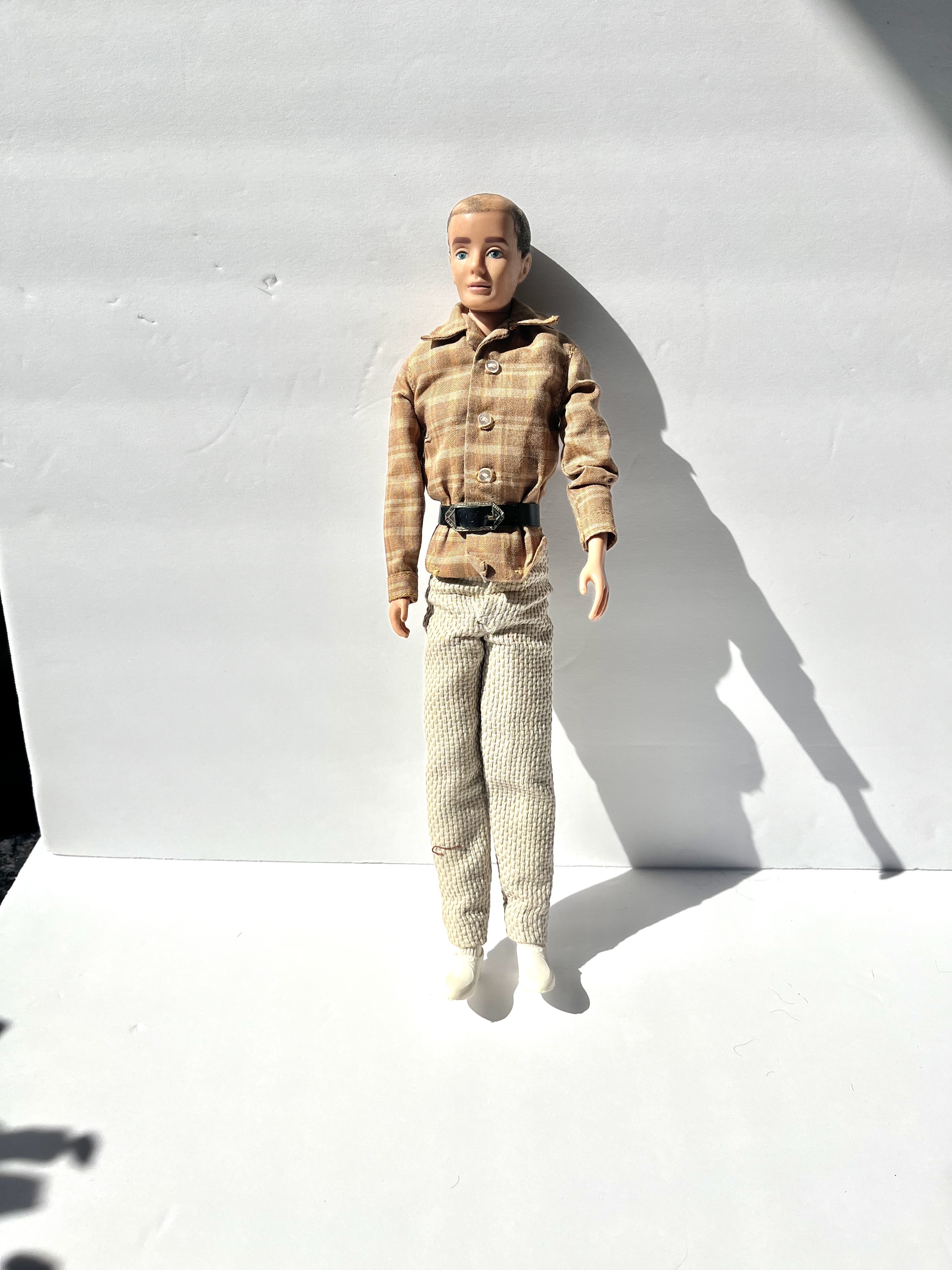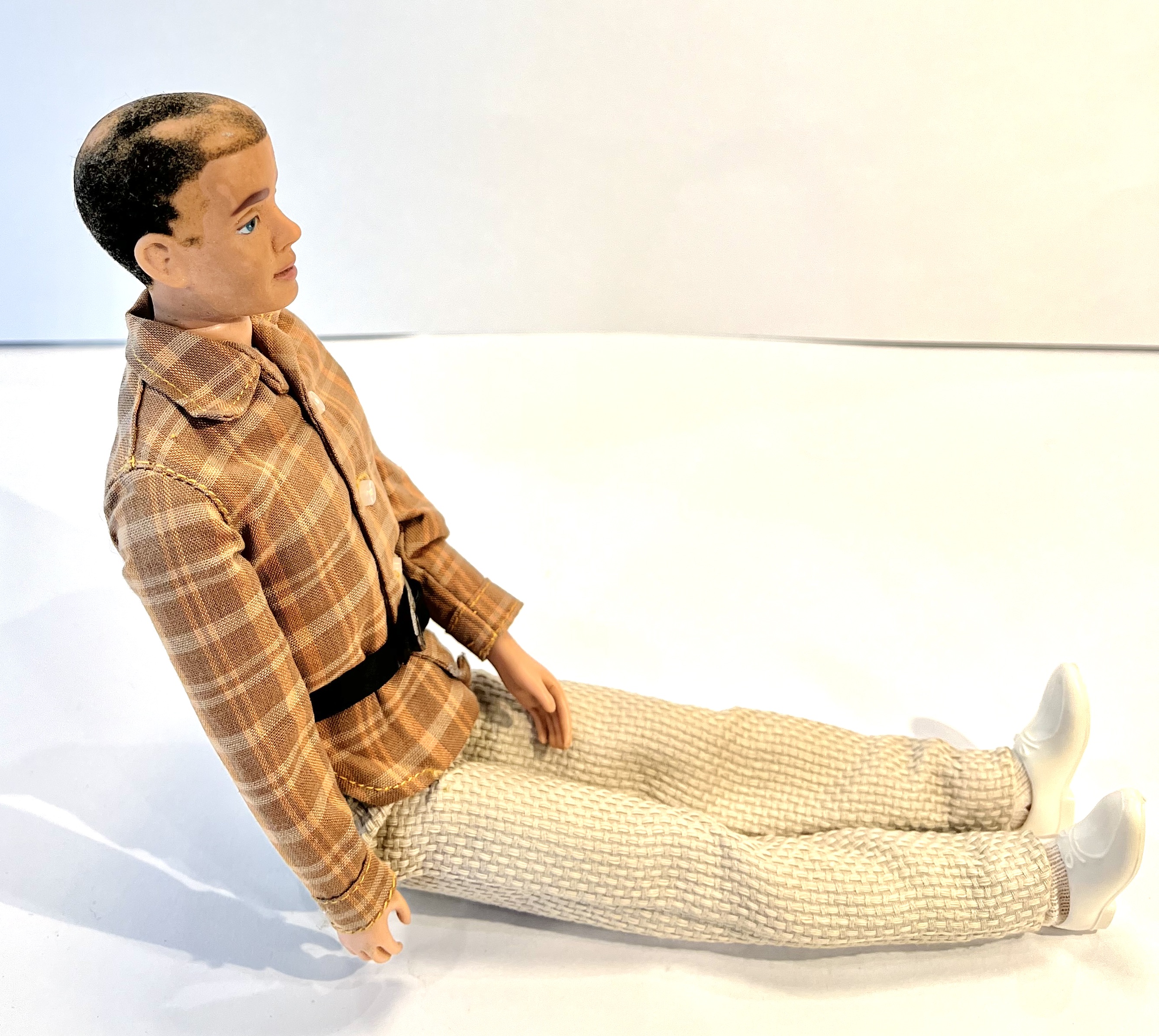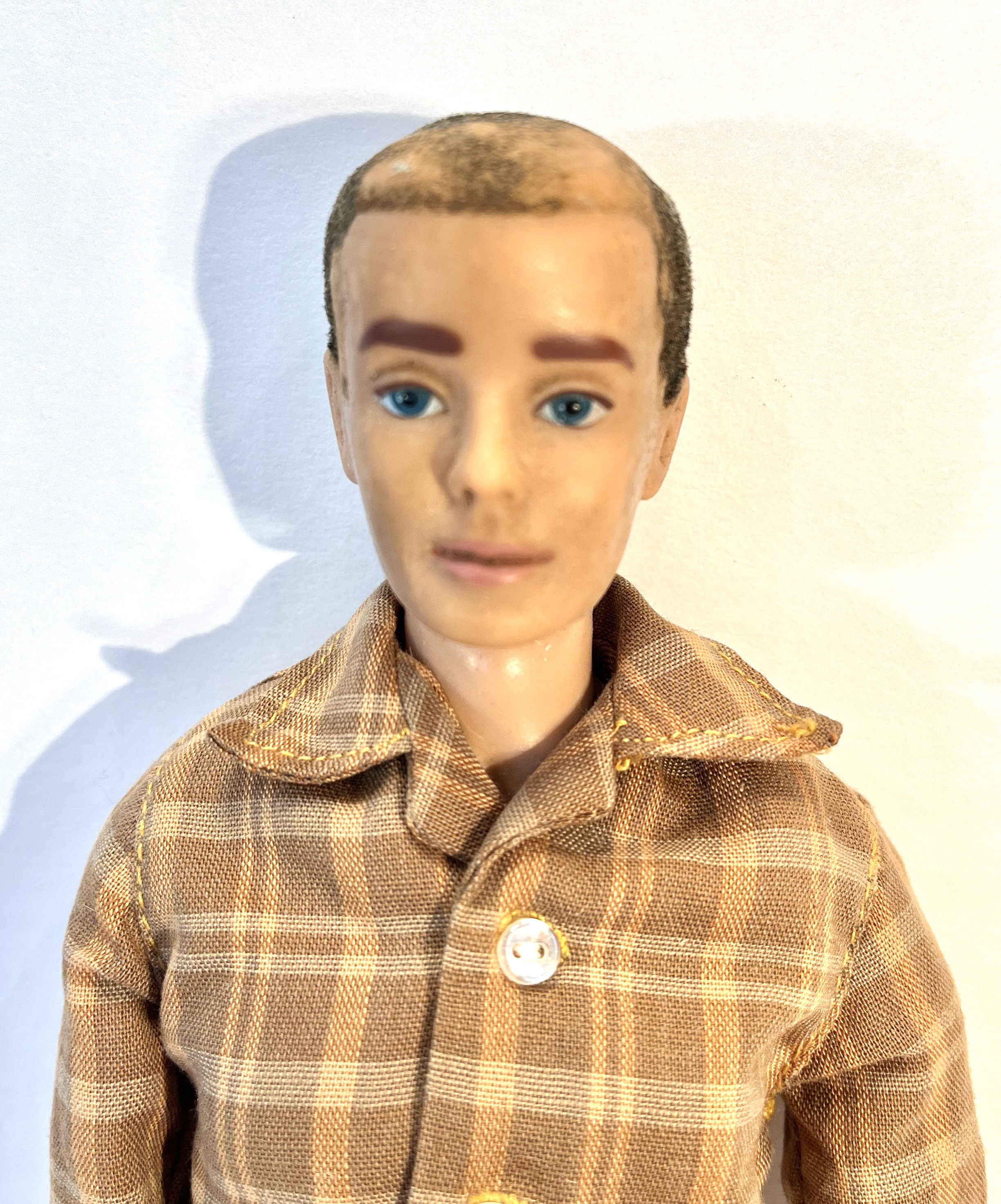 My grandmother (born in 1898) collected Barbie dolls in the 1960's. This doll adorns a plaid shirt, black belt, light beige trousers, white sport socks, white shoes and warm vest. She made all the clothes except the socks, shoes and belt. He bends at the hips and shoulders as the legs and arms are straight. He's in very good condition except that his hair is coming off in places and his right arm dislocates but reattaches easily. See photos.