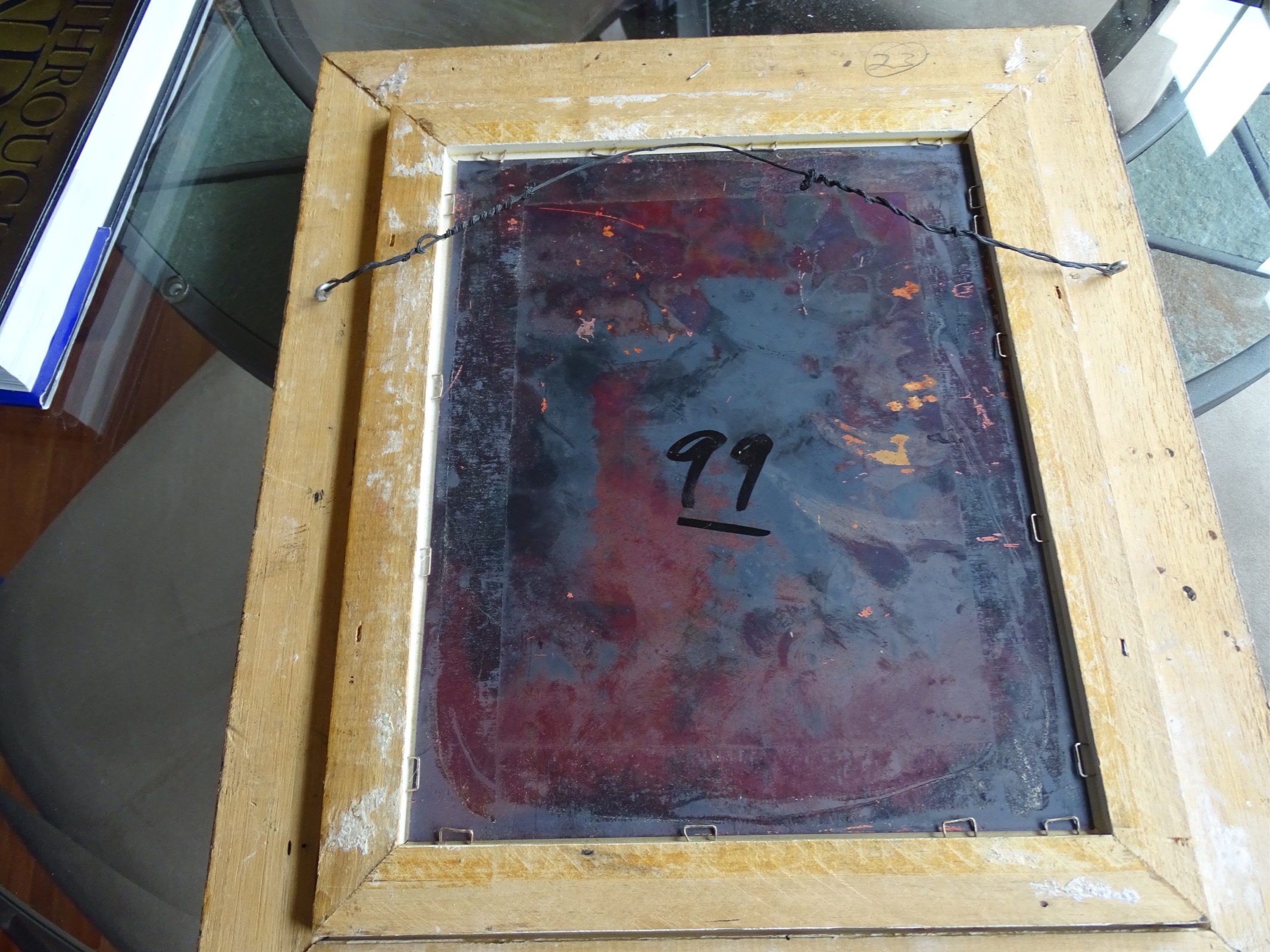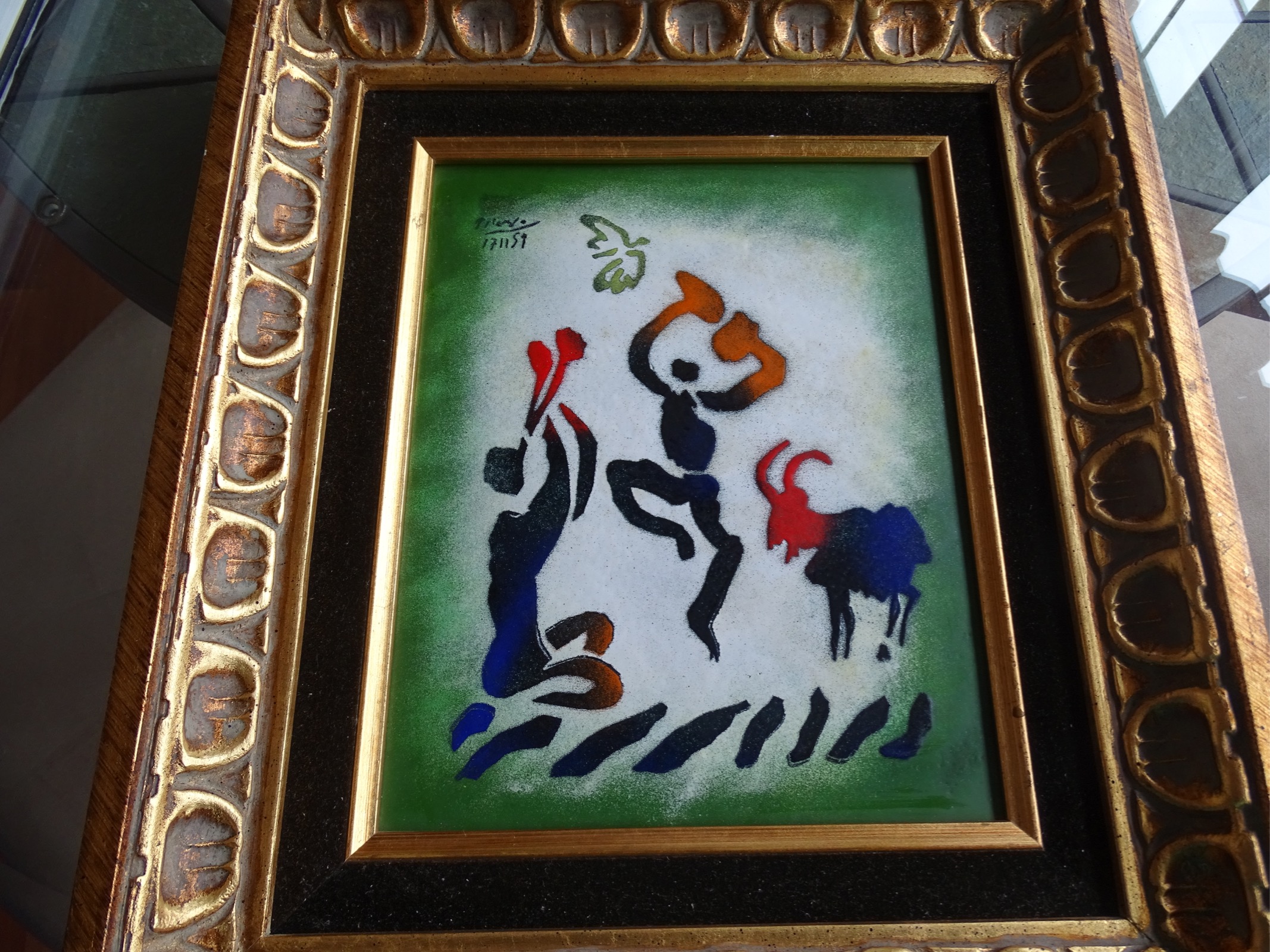 An enamel painting on Copper that is named Goat Dance. It is painted on copper and framed in a thick wooden frame.