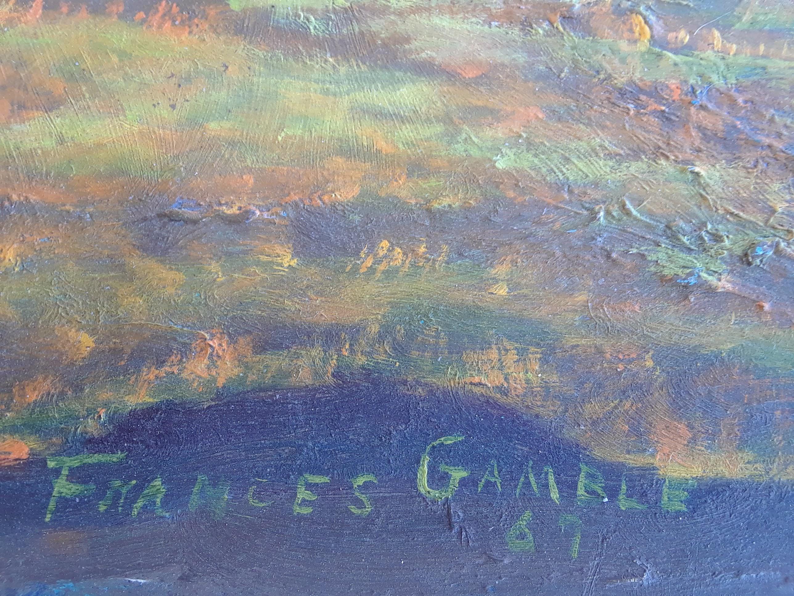 Vintage painting size 15x25 , oil on masonite, piece has no title but in good condition. The painting is signed and dated, the artist is Frances Gamble and dated 1967. I need some information on this artist.