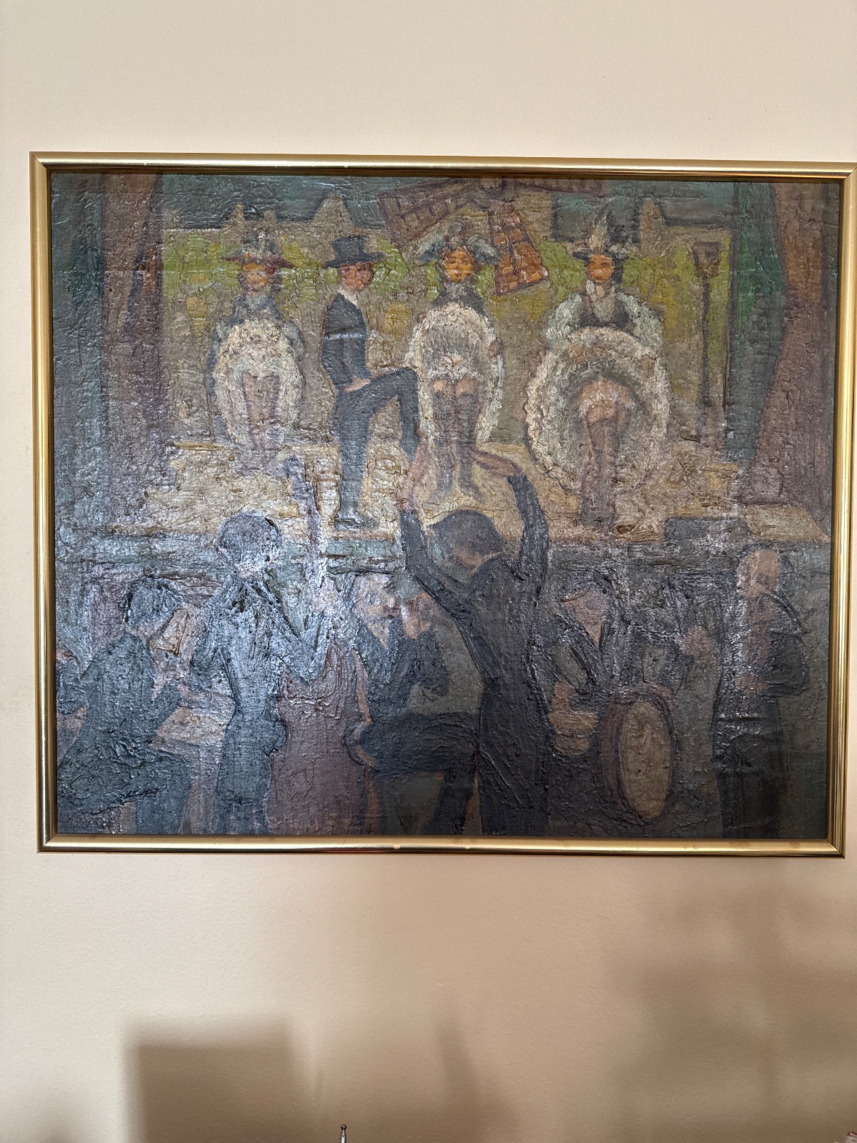 Physical Description: This vintage painting features a lively performance scene, likely depicting a theatrical or musical event. The medium appears to be oil on canvas, with a textured surface that adds depth to the figures and background. The dimensions of the painting are approximately 36 inches wide by 24 inches tall. The artwork is framed in a simple gold-tone frame, which complements the colors of the painting. A faint signature is visible in the lower right corner, though it is somewhat obscured.