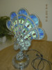 Peacock lamp base is gold, with stained glass shade. Three peacock heads have eyes that are syellow-gold beads.