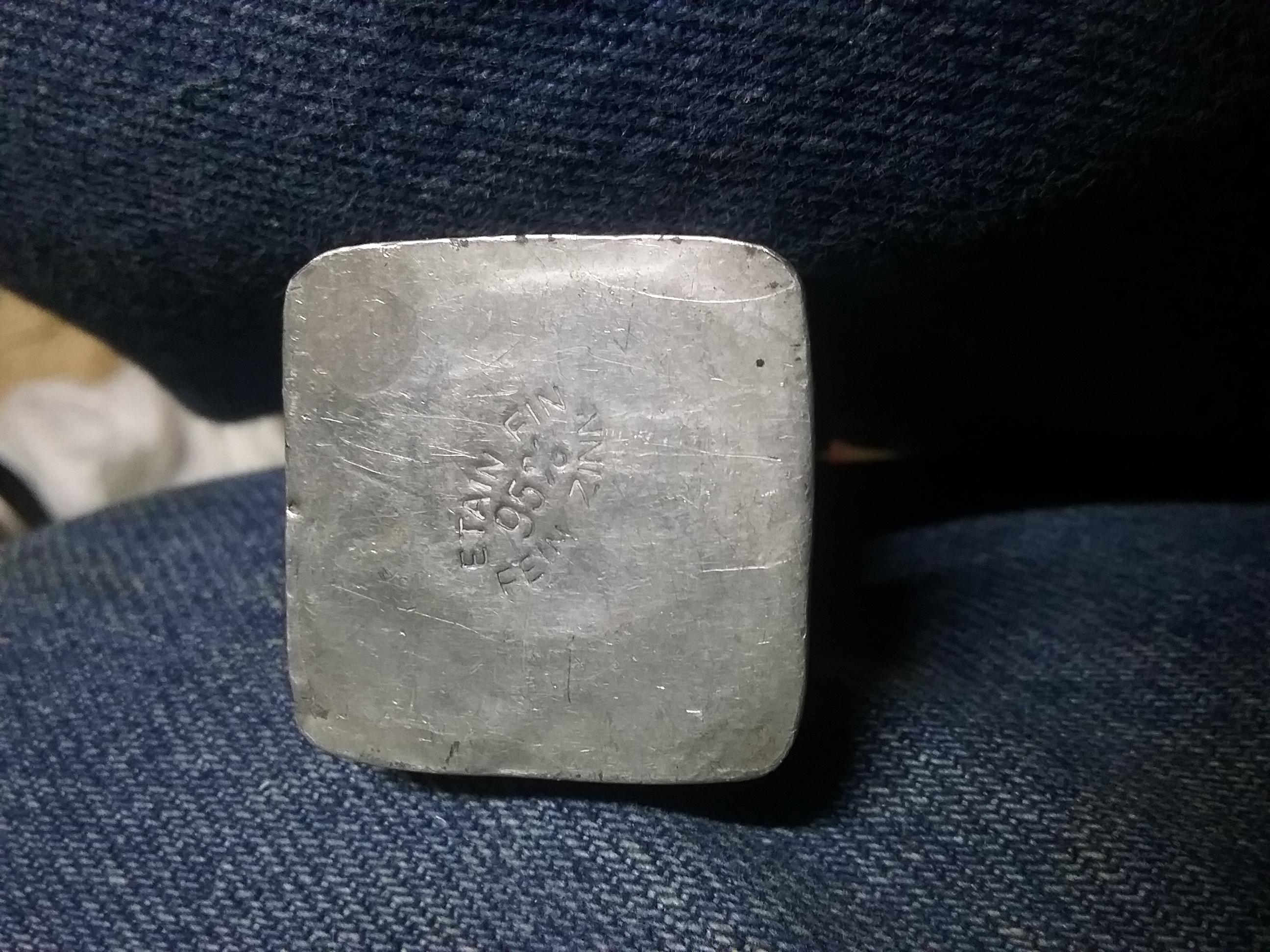 It's marked etain fin 95% fein zinn on bottom, about 2" to 2 1/4" tall about 1" wide, cap unscrews