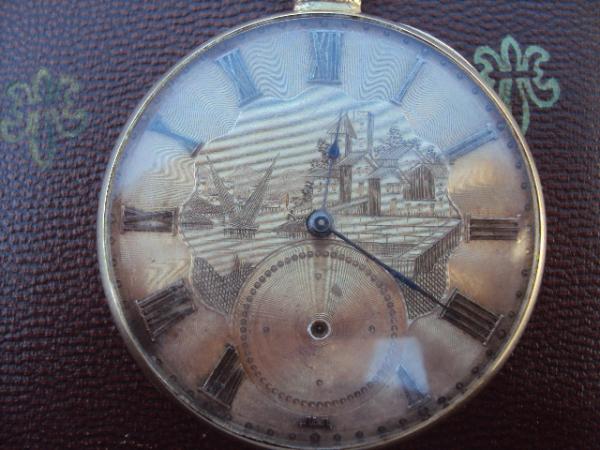 On the face of the watch, there is a picture of a "village or some houses". On the inside of the first back cover it says "343" and a small engraving. I was told this was a service mark. On the other side of this, it has some fancy engraving and then the two small holes and "gears" where you would wind it or set it. They key is also with this watch. It again says the number 343 and detached lever. It also says 13 Jewels. I can not see any marks on the works at all.