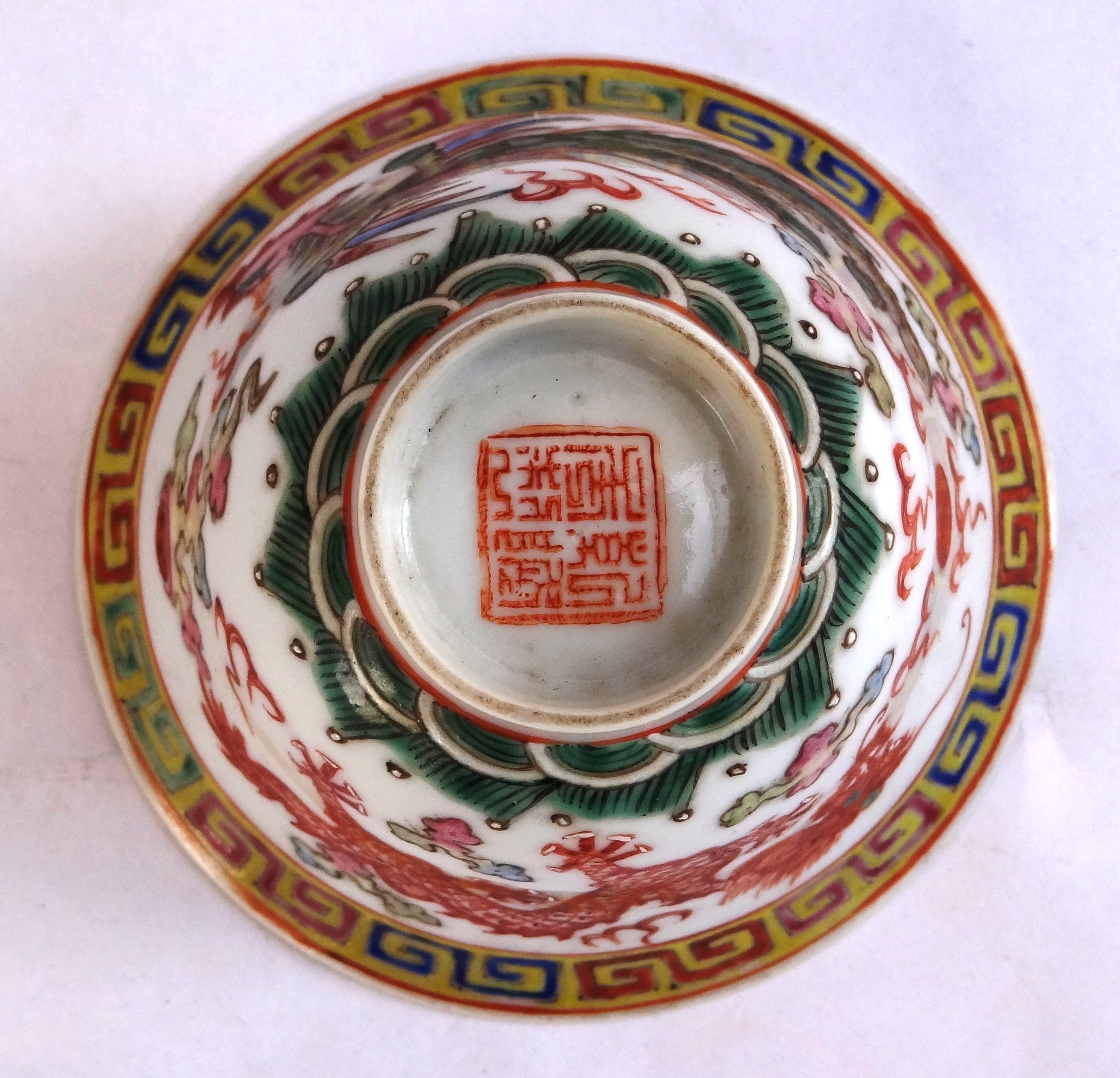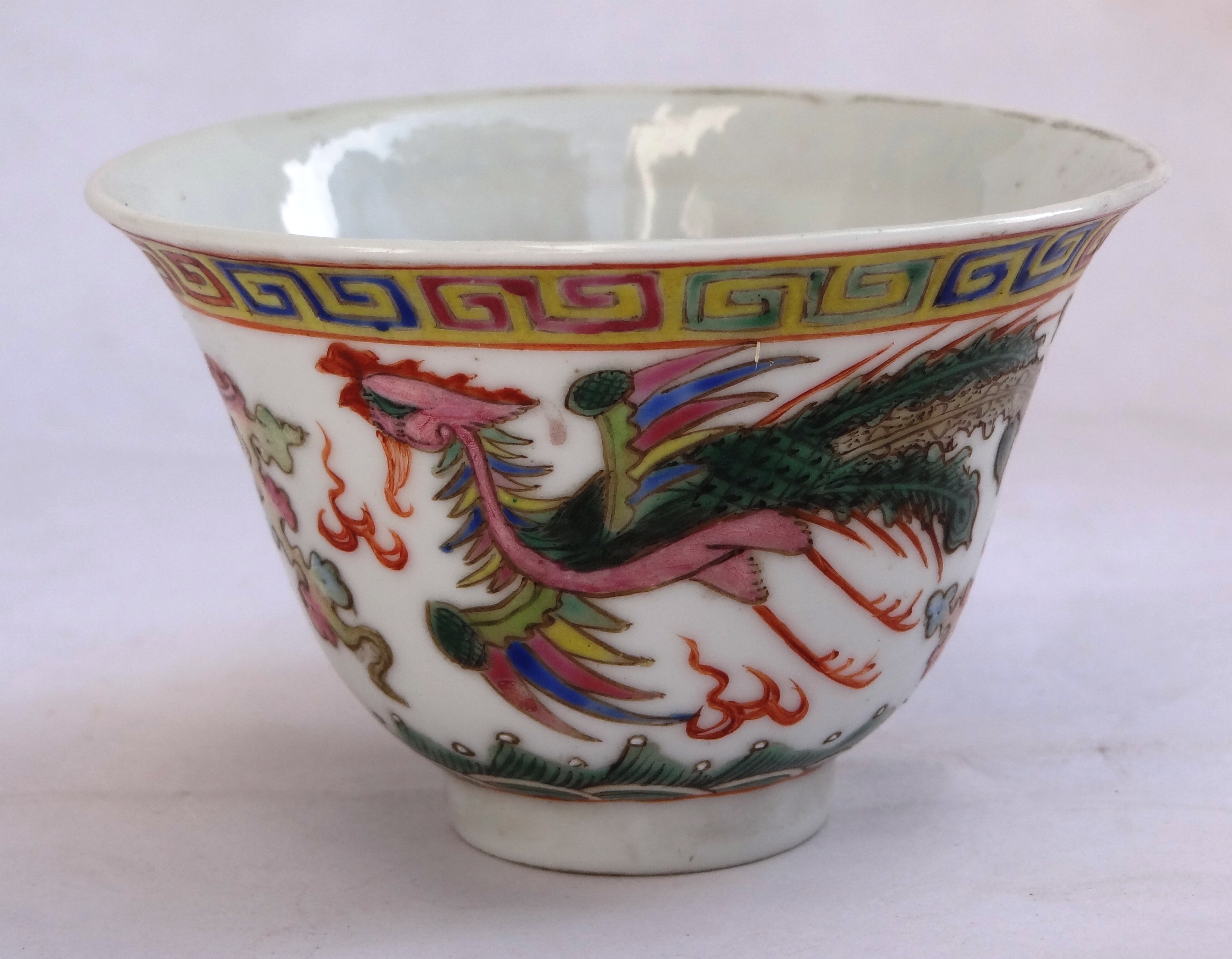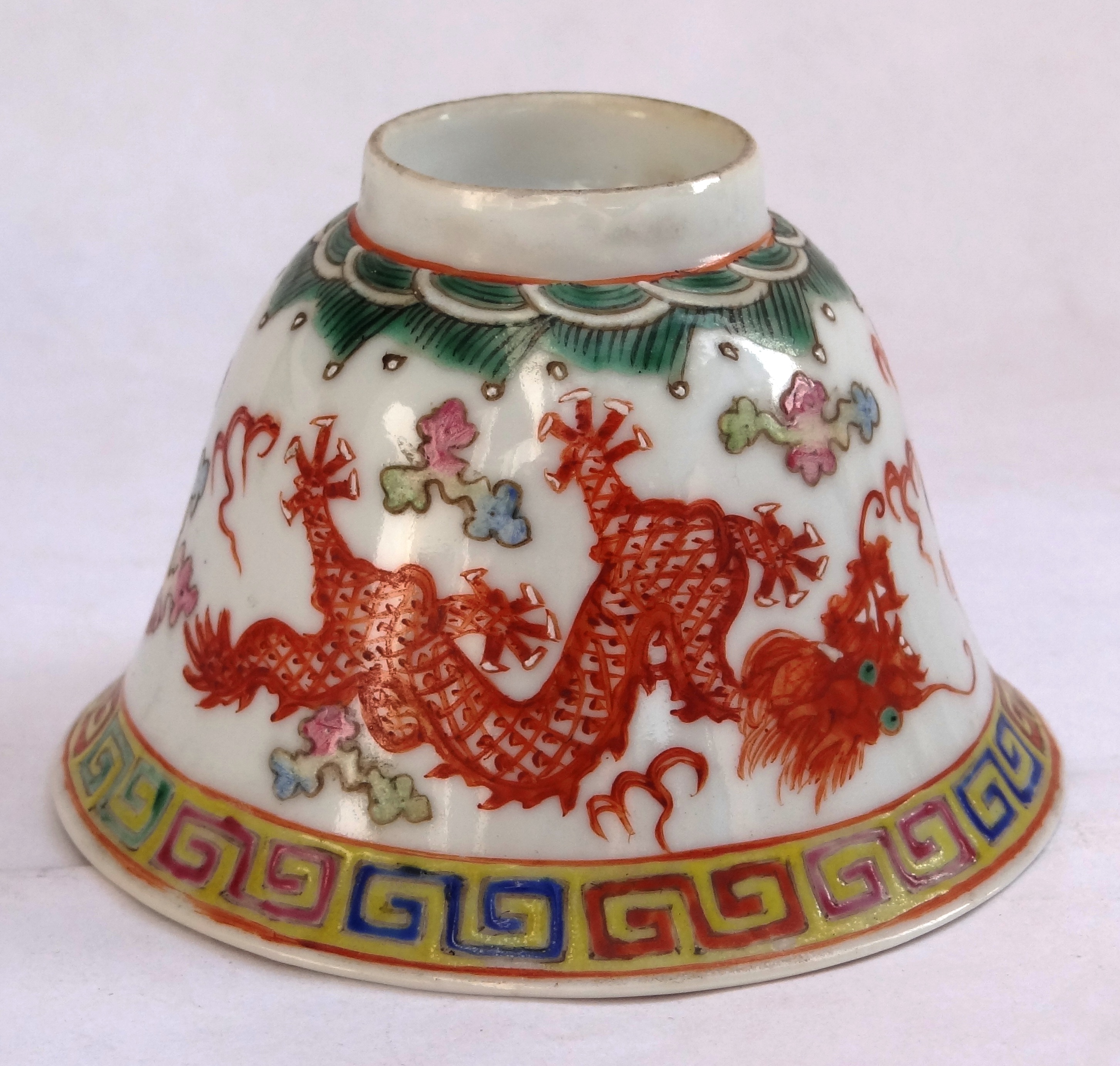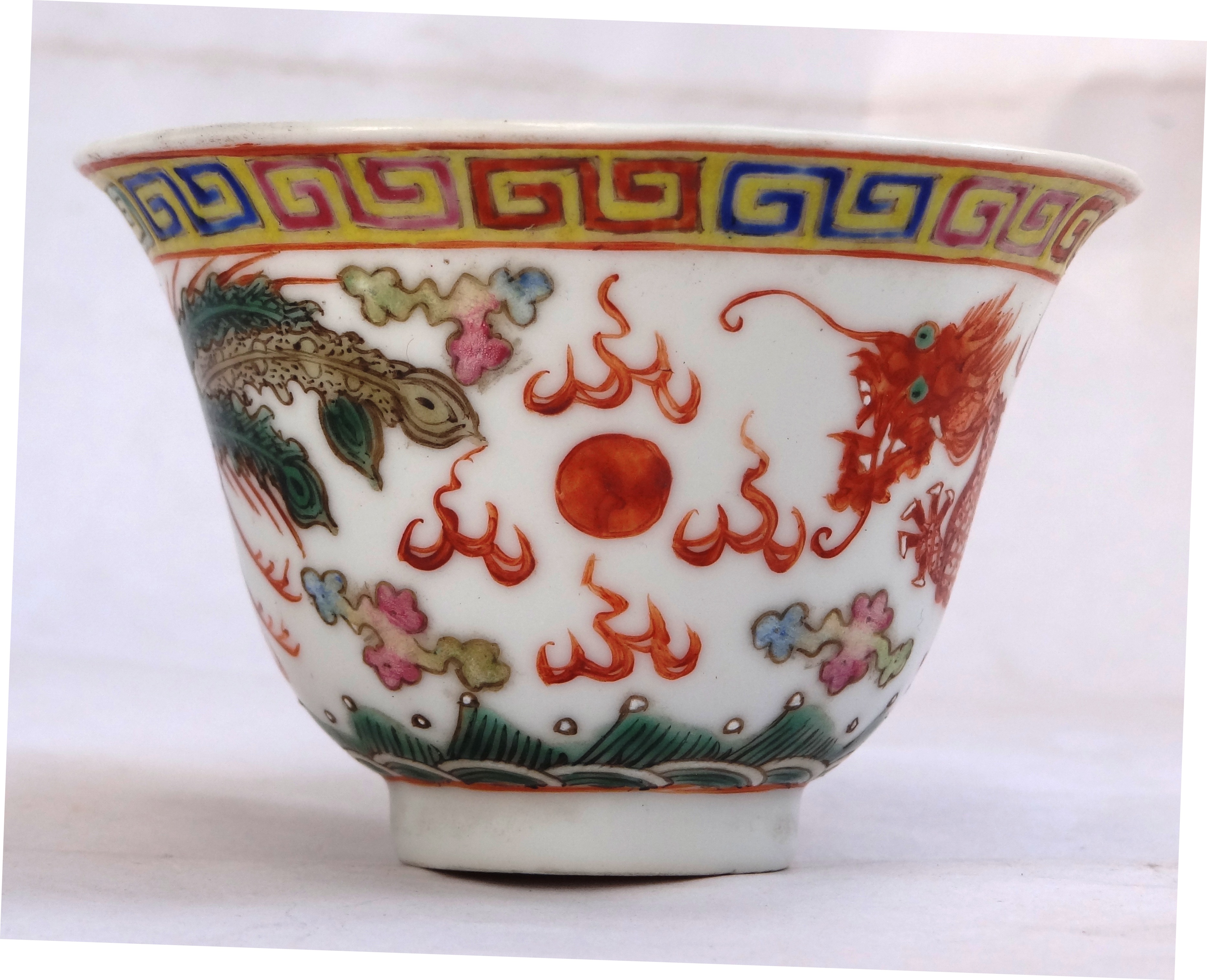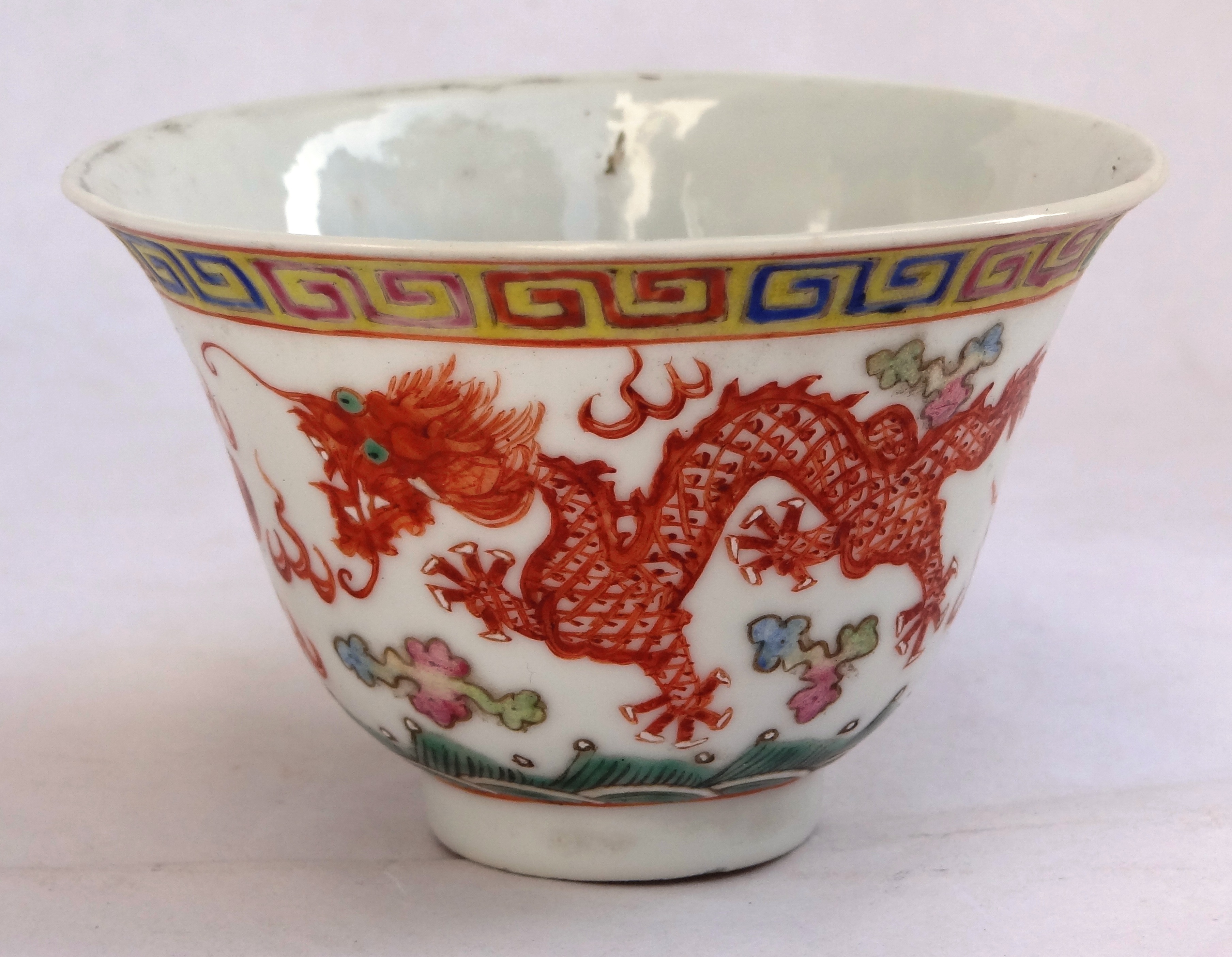 Chinese Dragonware cup, i think they are common. Also, it doesn't look that old. The Seal Script Chinese Mark on the bottom tells that it was factory made. Maybe worth $10-25 ish?