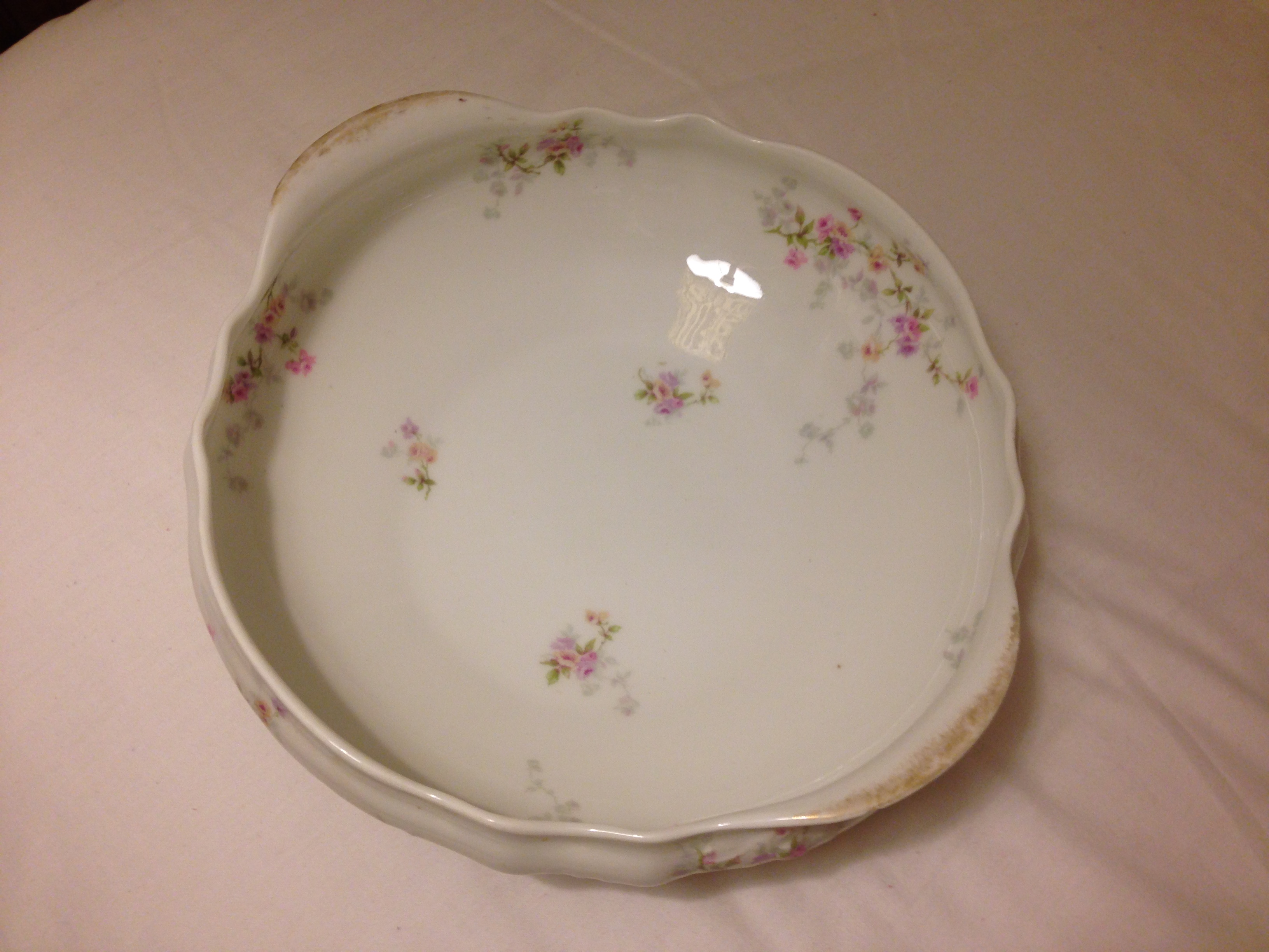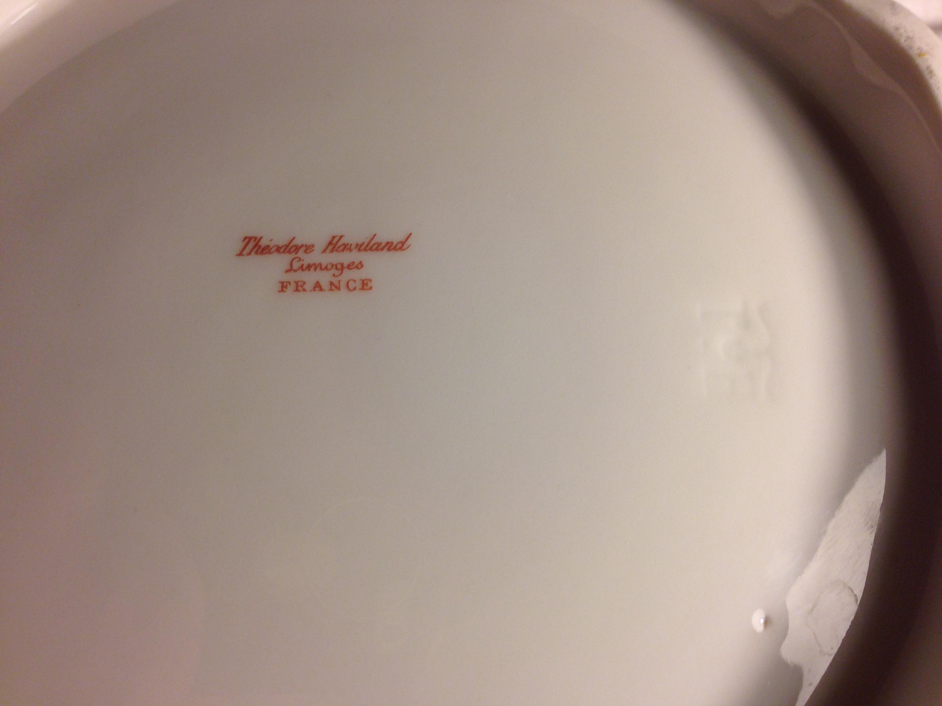 I inherrited a large vintage bowl and I would like to find out its value and any information about it. The Bowl is marked at the bottom with red ink "Theodore Haviland Limoges France" . It is hand painted with a pastel floral design of pink, purple and beige flowers. I have done the light test on the porcelain and it shines directly through, I can see the shadows of my fingers as I wave them behind it. On the bottom of the bowl the initals of Theodore Haviland (T.H.) are etched into the porcelain and glazed over.