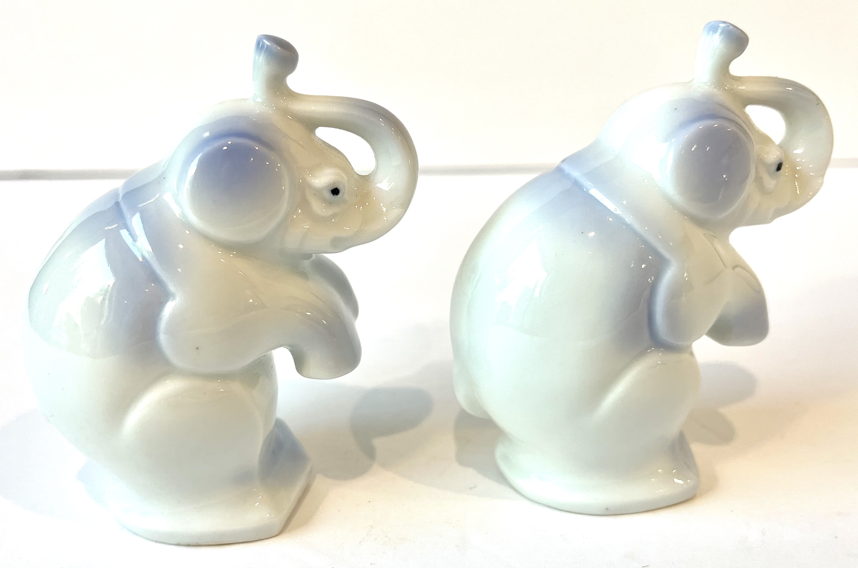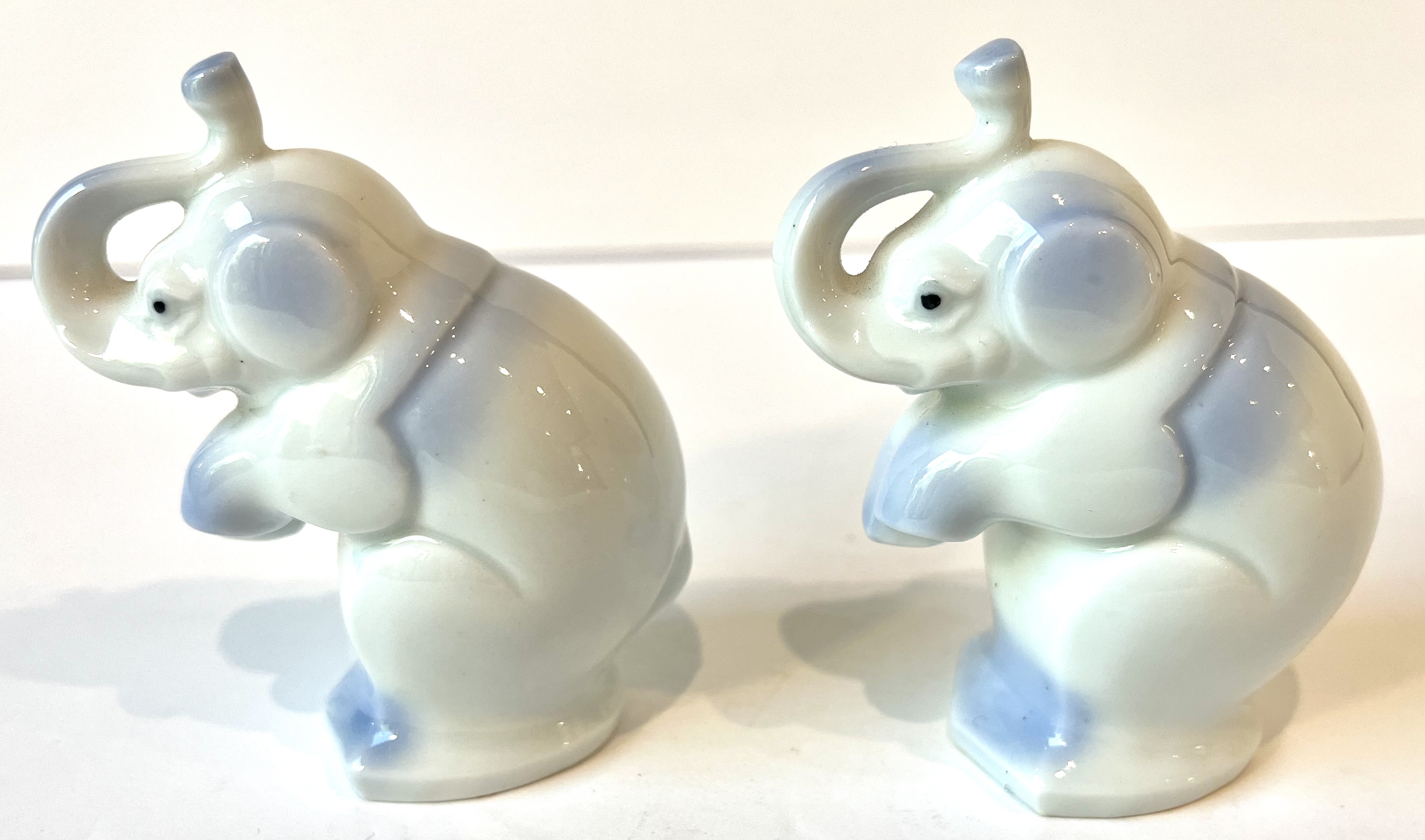 These vintage porcelain salt and pepper shakers feature a charming novelty design of trumpeting elephants in light blue and gray colors. Made in Japan in the 1920-1949 time period, the set includes two working shakers with original cork stoppers. The whimsical animal shape and small size make them a fun and unique addition to any kitchen or collection. These collectible pieces are perfect for all occasions and add a playful touch to meal times.