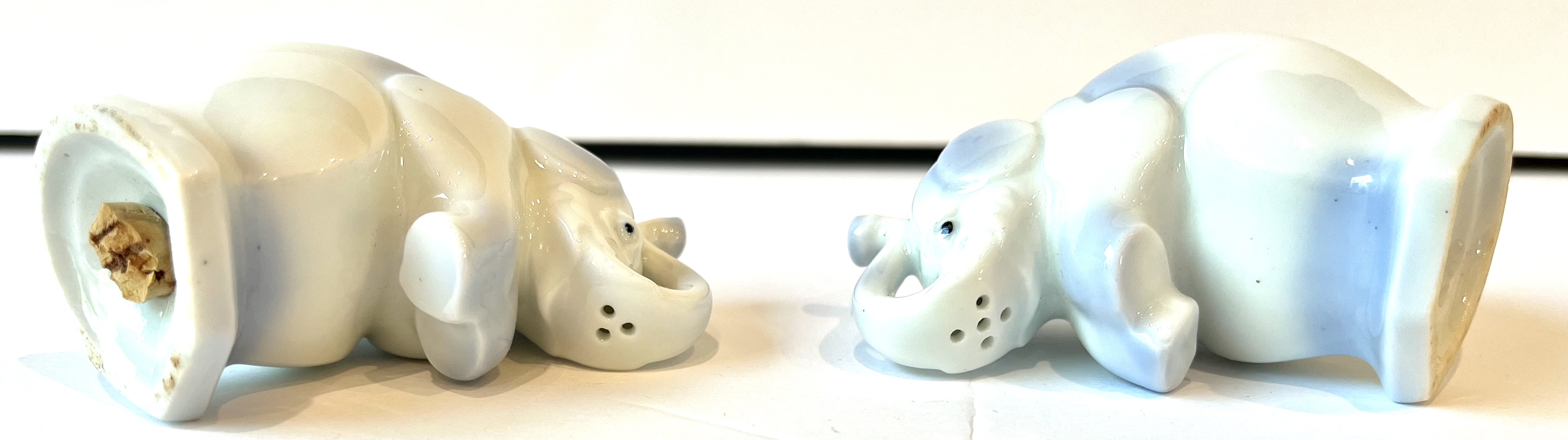 The original porcelain shakers and cork stoppers remain in tact with no areas of damage. The unusual salt and pepper openings are located under their trunks.