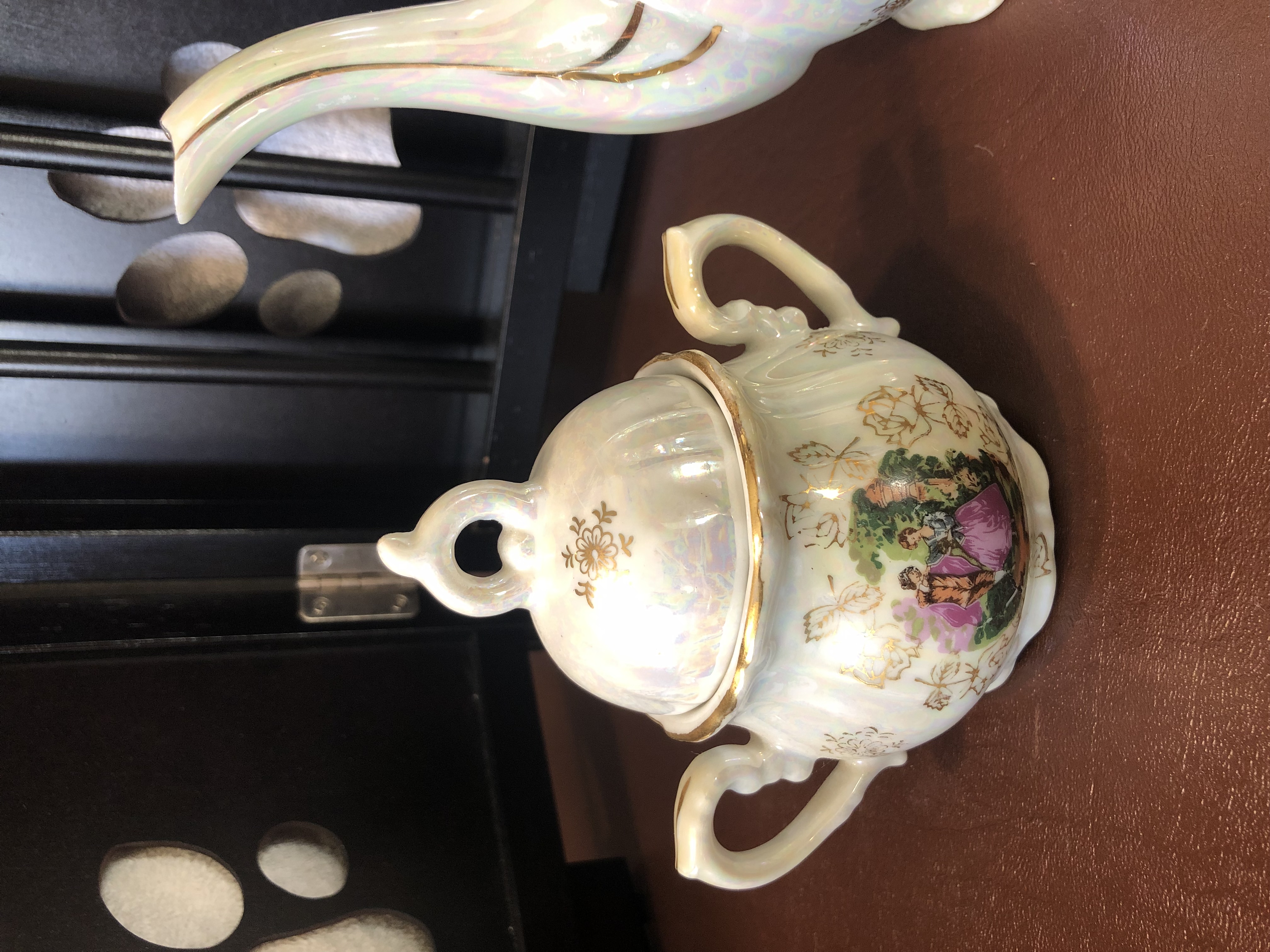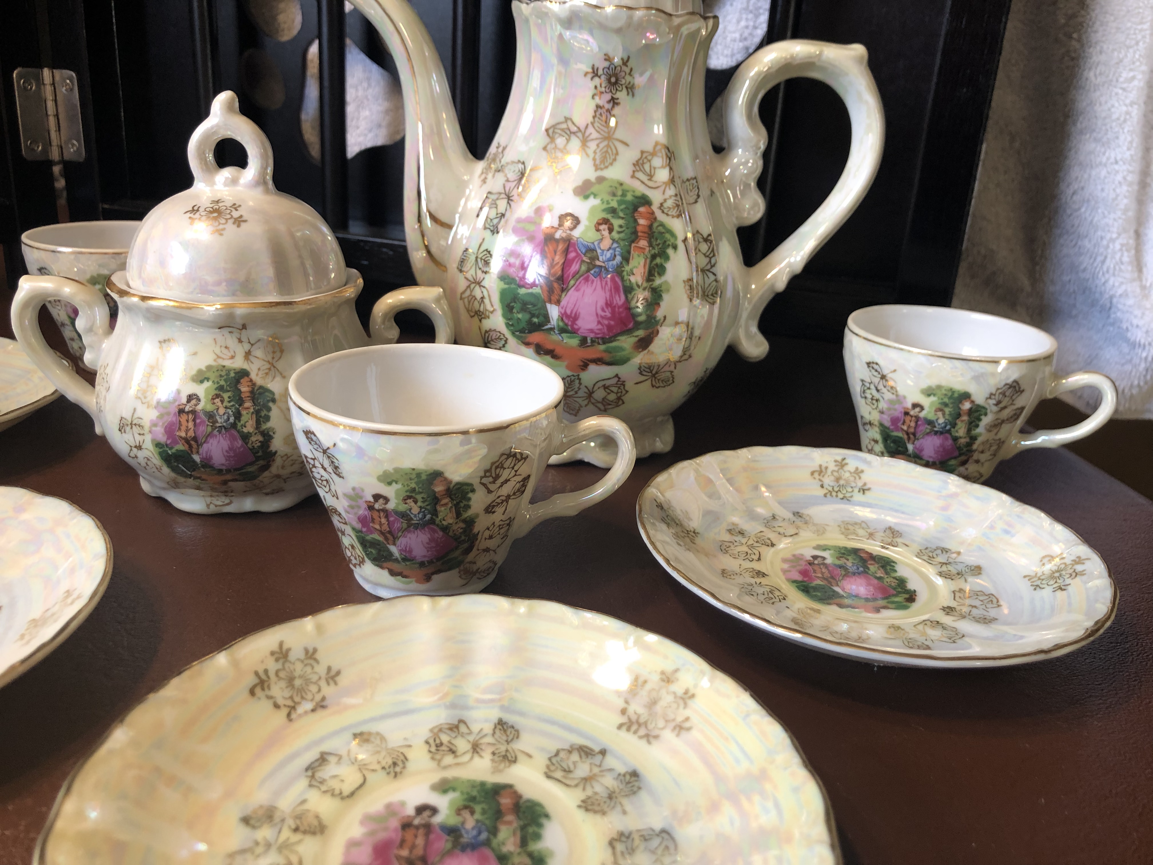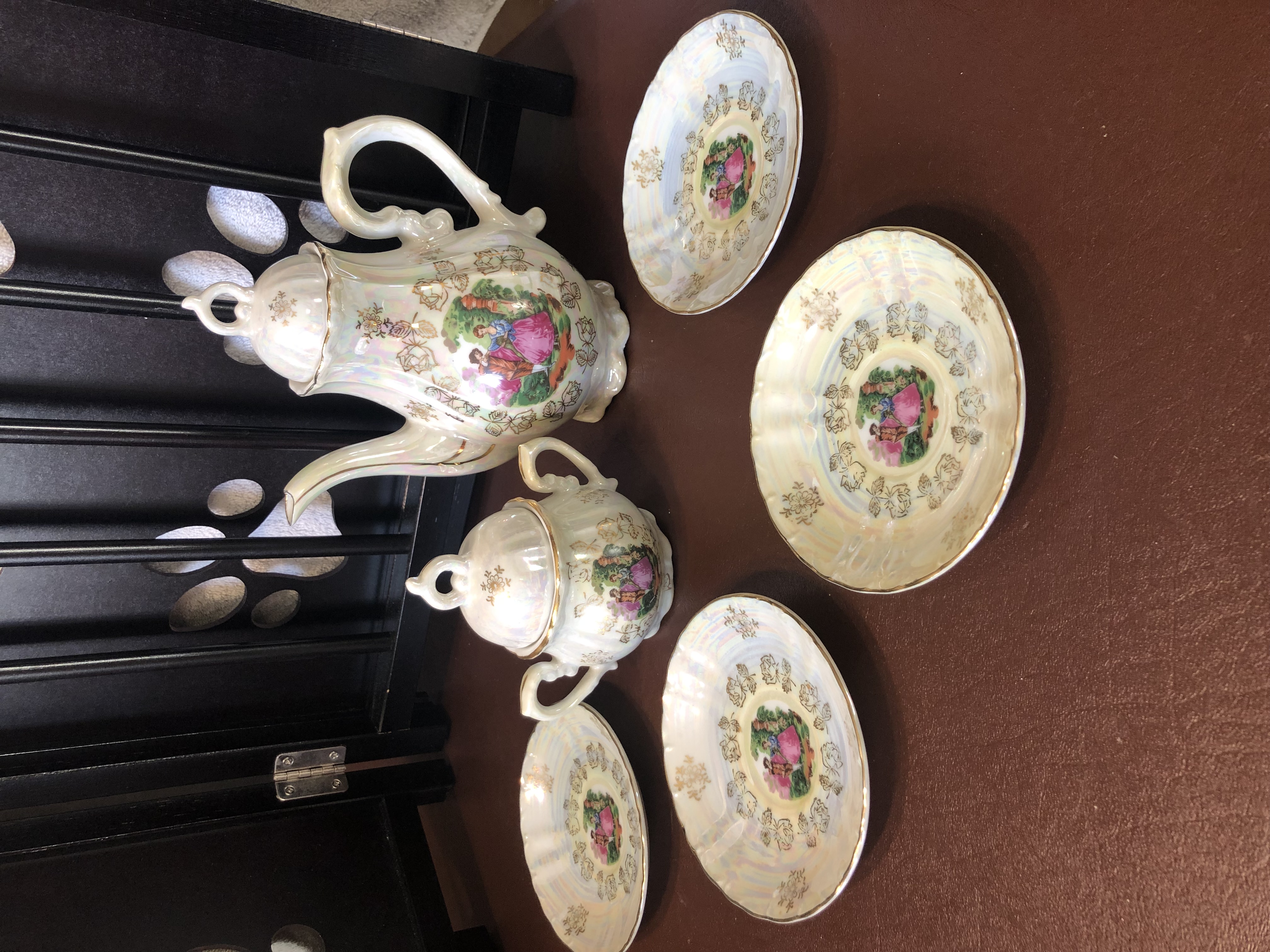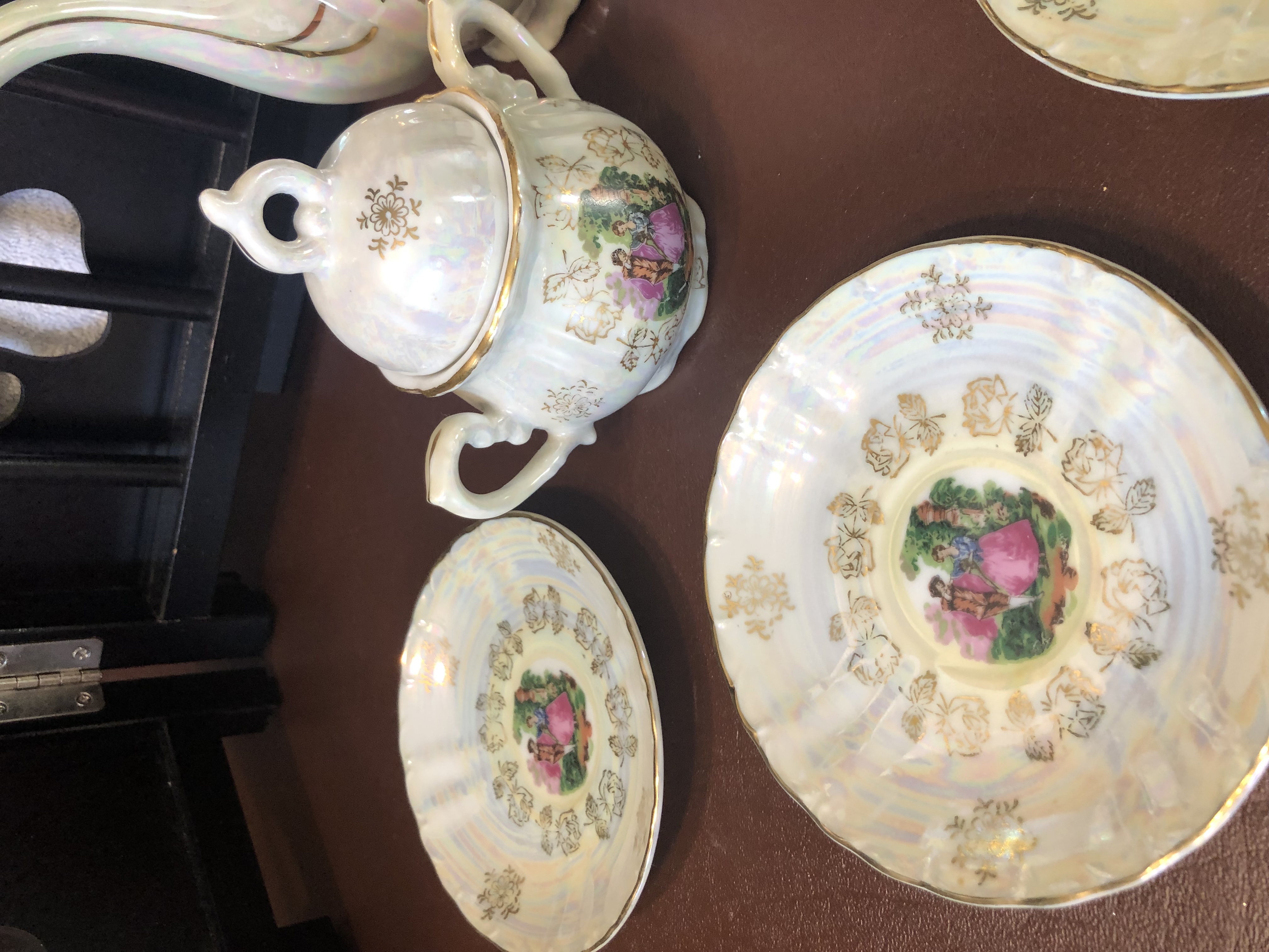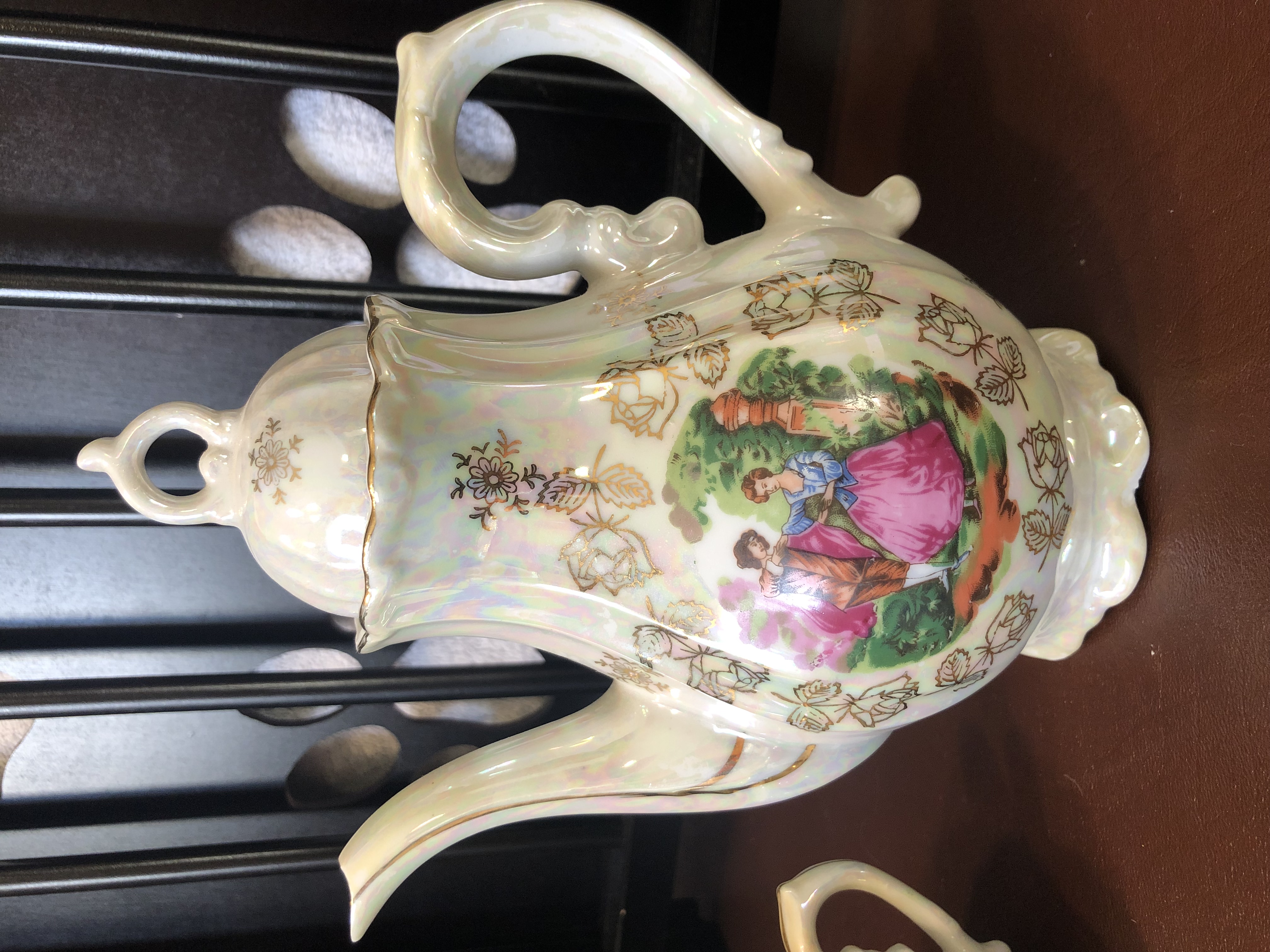 Vintage Porcelain Tea Set made in Japan. Has an almost mother of pearl reflection, has a turn of the century photo with hand paint gold plating Roses. The Tea Pot has a music box that you wind up at the bottom and it does still work, however the (3) anchor hinges are a bit rusty, the crank and stop pin are not. It is very beautiful set. I only have the Tea Pot, Sugar Bowel, 6 tea cups and 4 saucer plates.