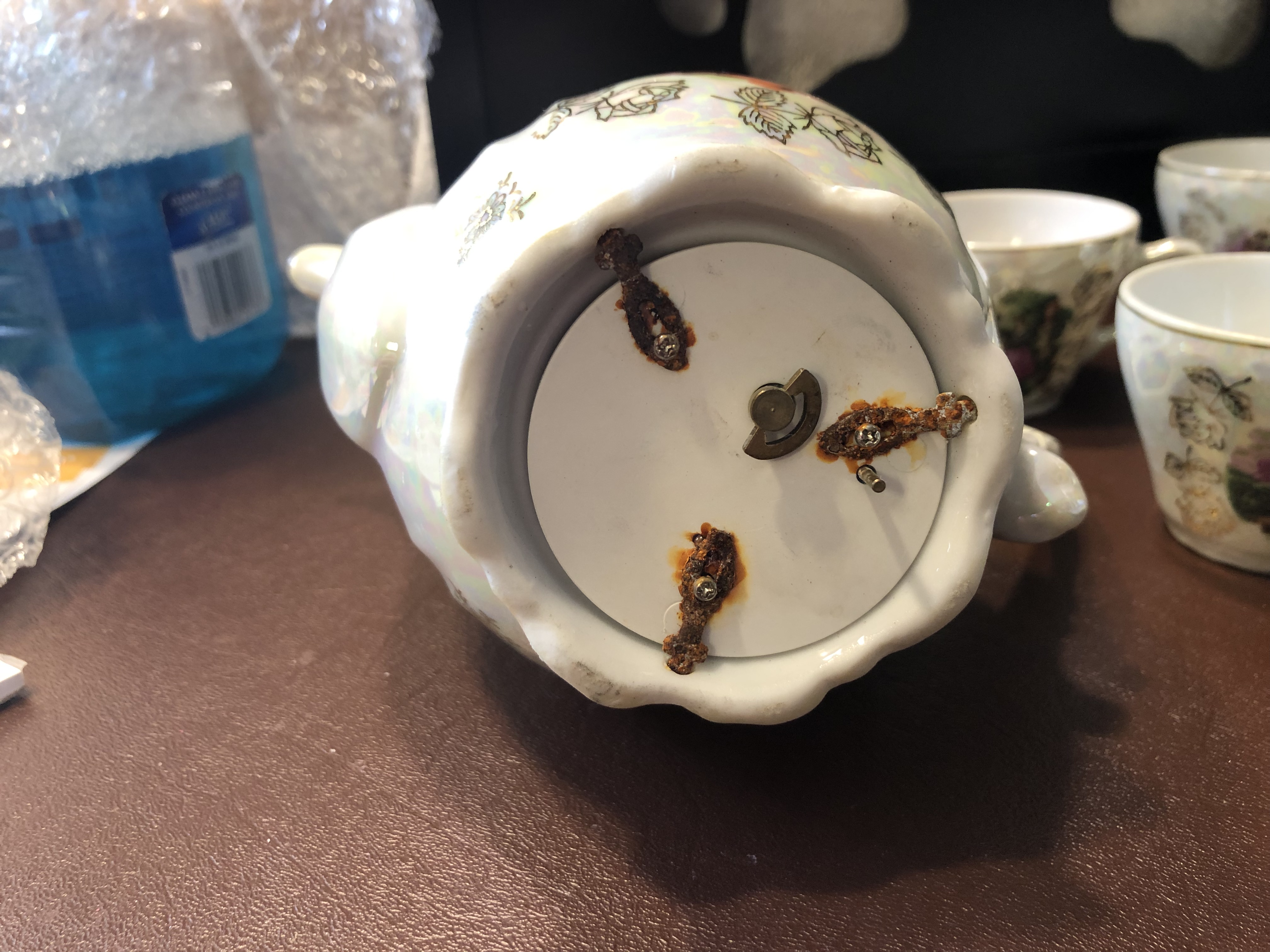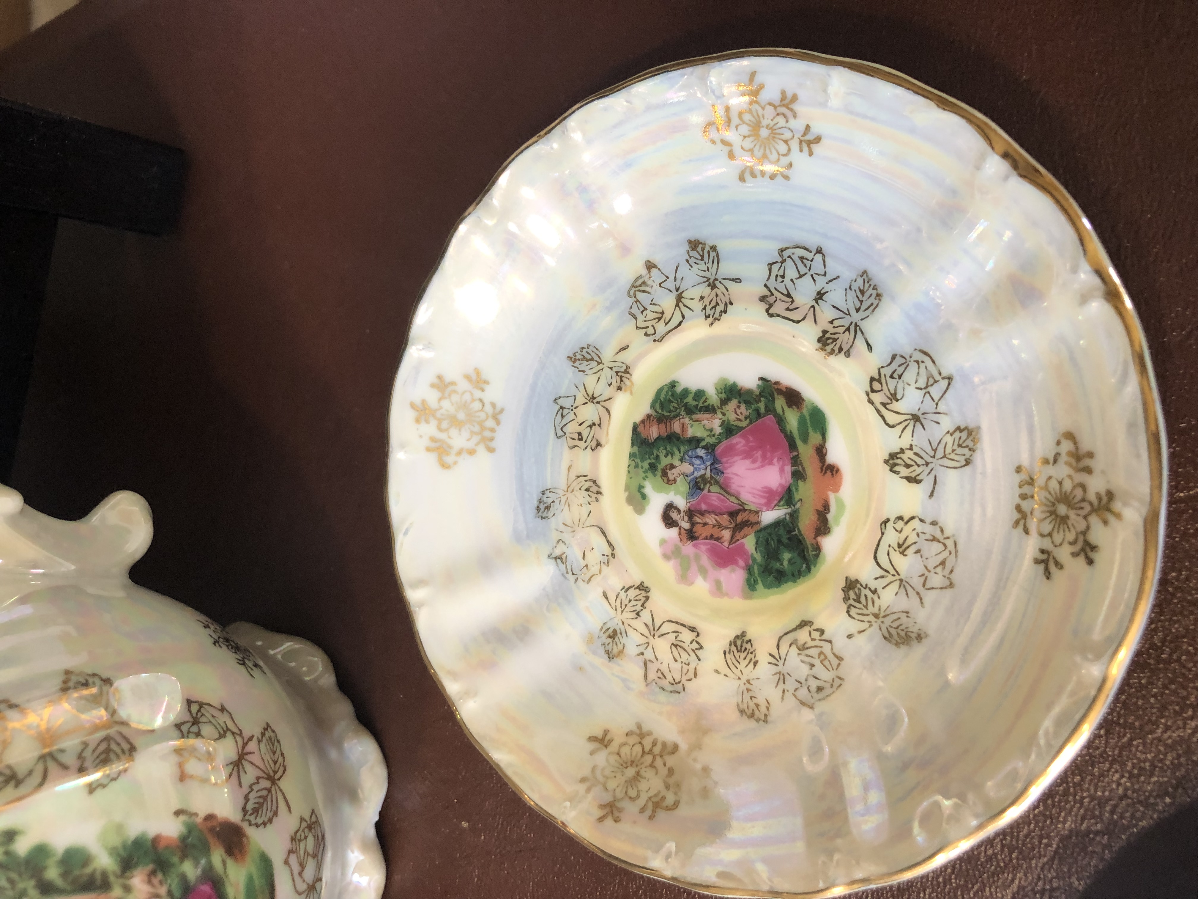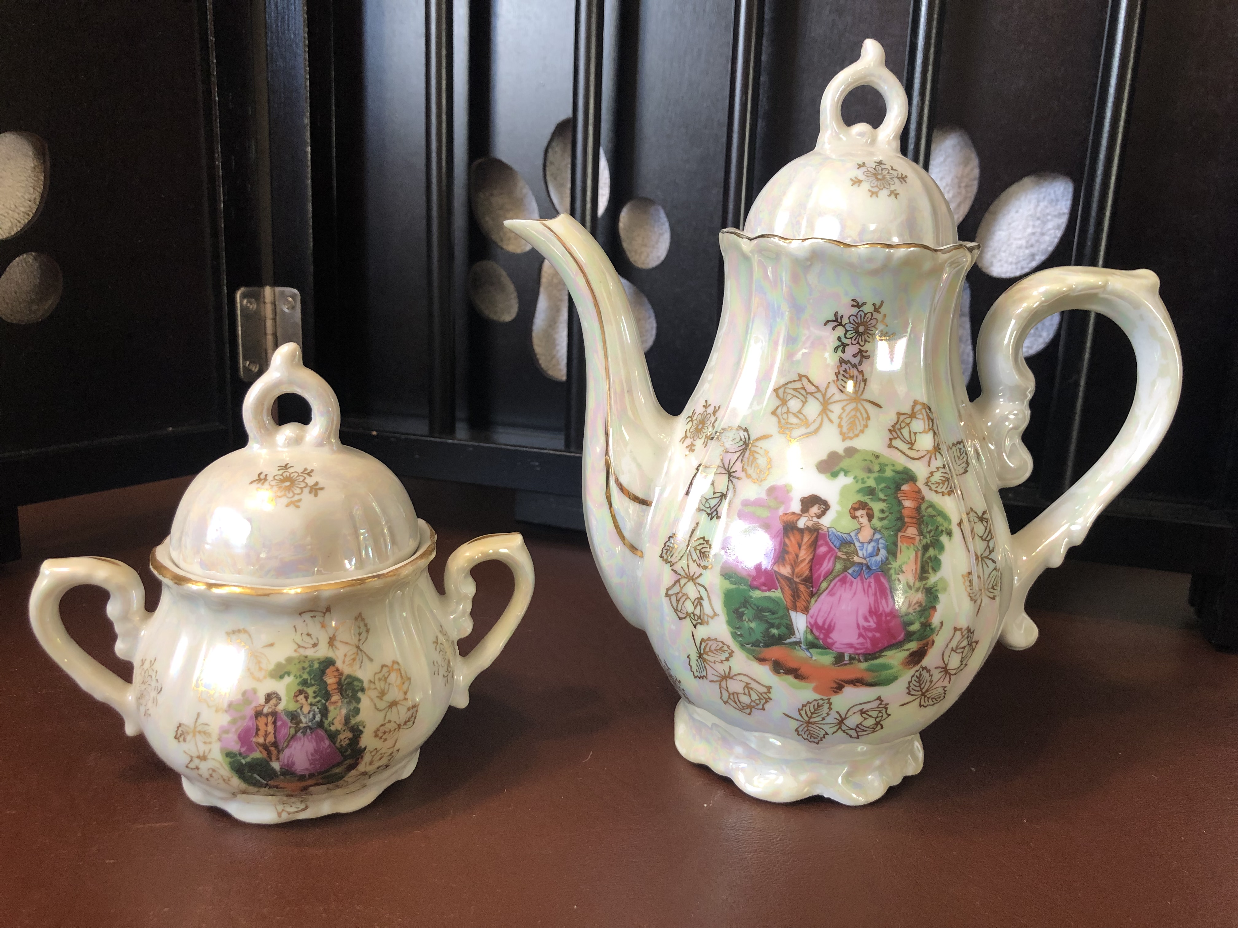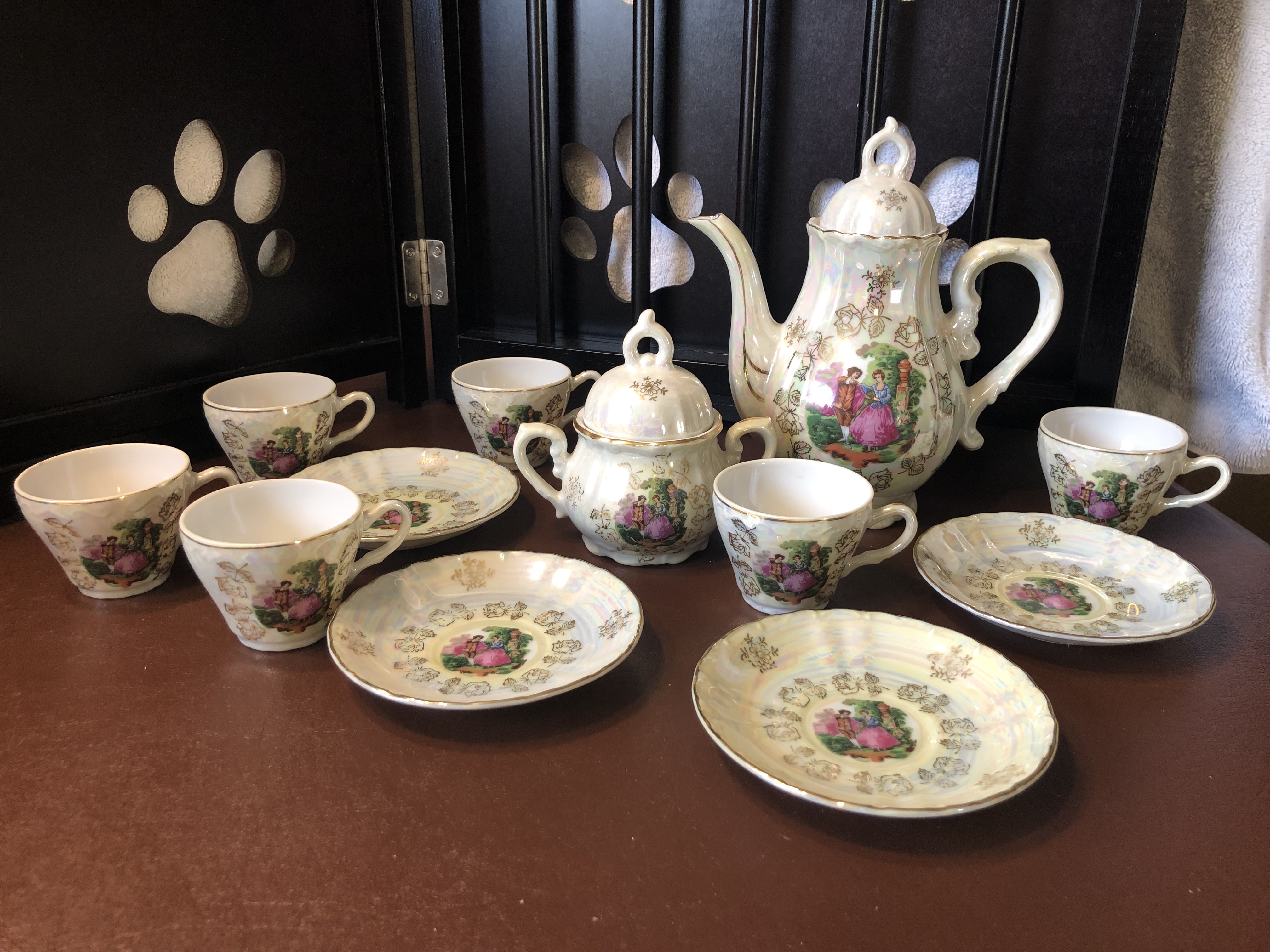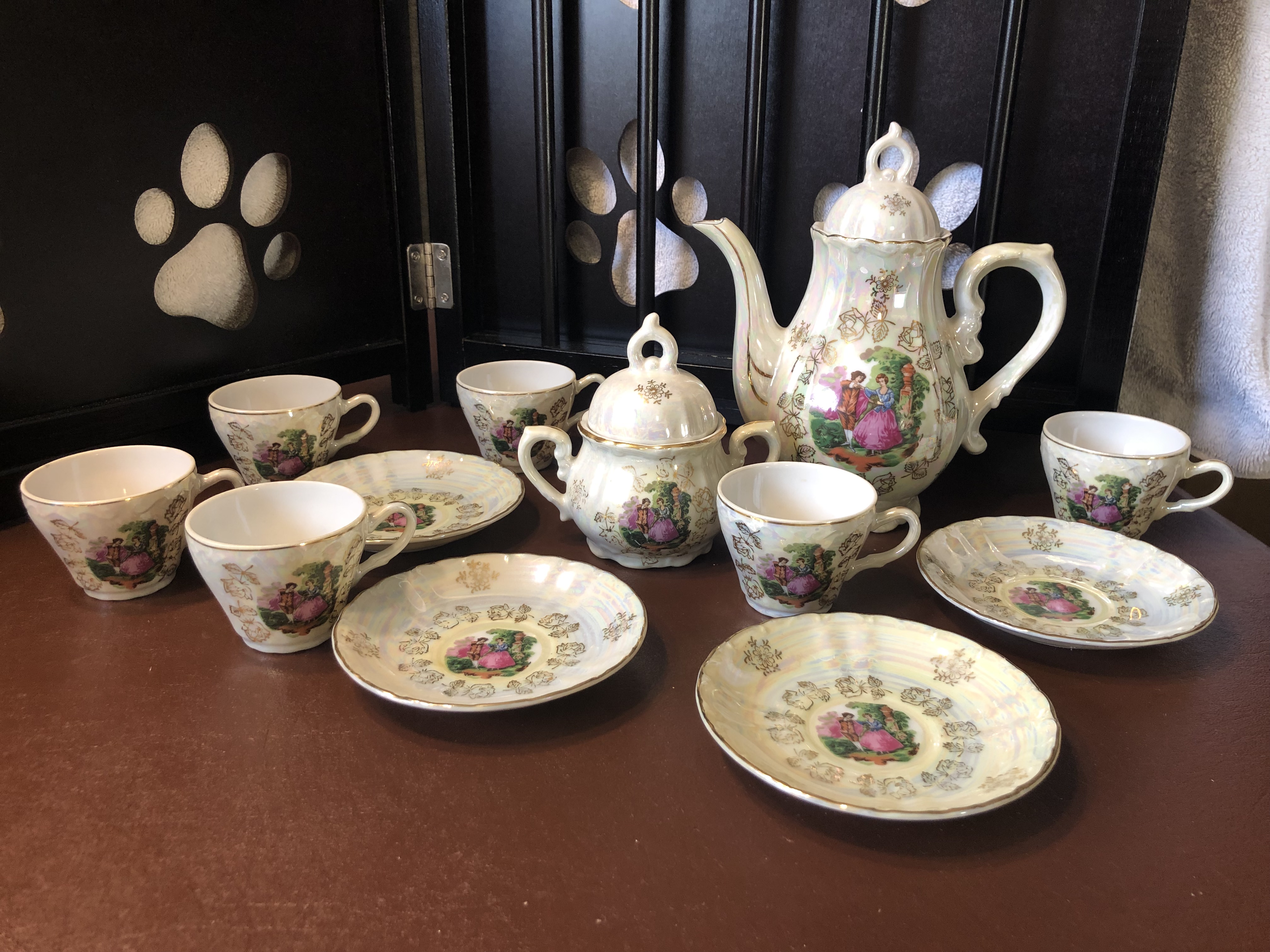 Vintage Porcelain Tea Set made in Japan. Has an almost mother of pearl reflection, has a turn of the century photo with hand paint gold plating Roses. The Tea Pot has a music box that you wind up at the bottom and it does still work, however the (3) anchor hinges are a bit rusty, the crank and stop pin are not. It is very beautiful set. I only have the Tea Pot, Sugar Bowel, 6 tea cups and 4 saucer plates.