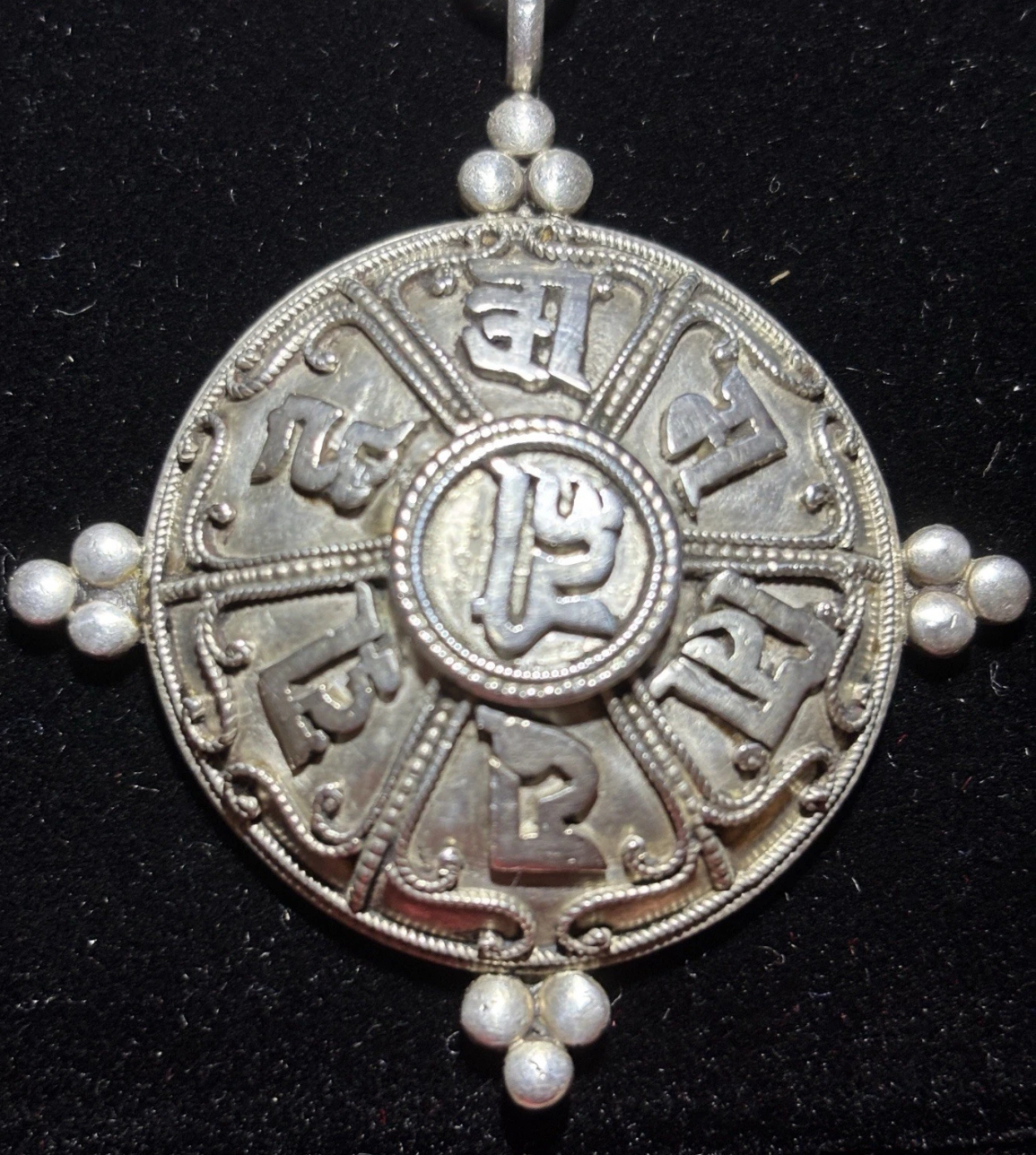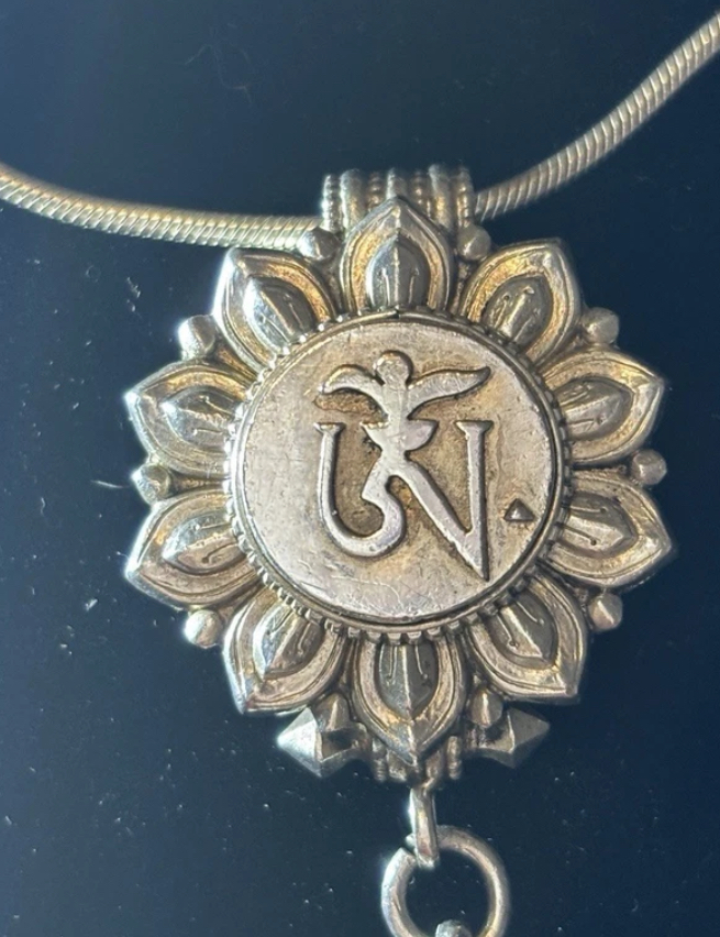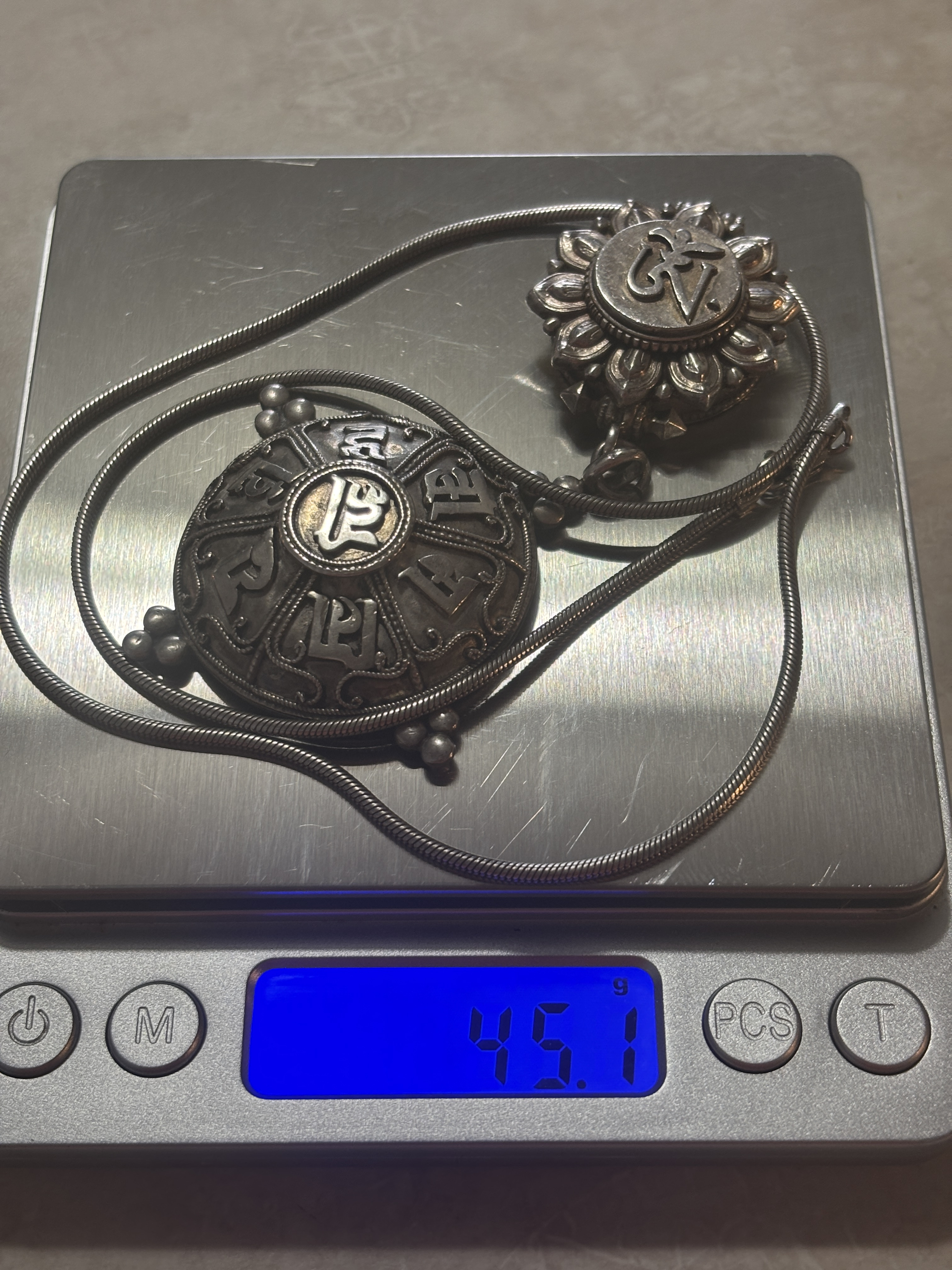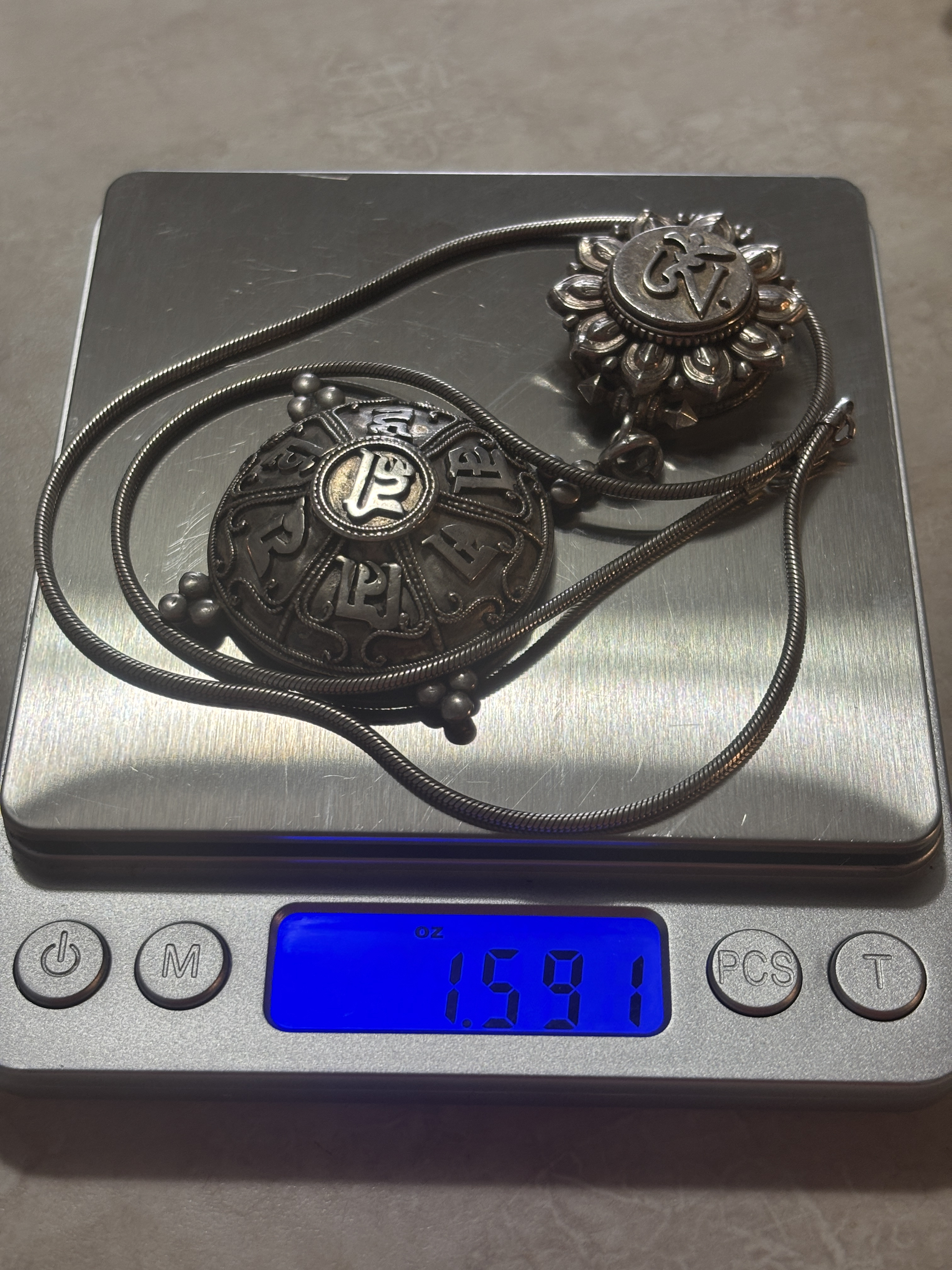 Description Sterling silver prayer box charm necklace with the top charm being solid sterling and the bottom piece hollow with a removable center for prayers or mantras to be inserted. It’s on a solid Sterling snake chain marked 925 as well and the charms measure 4” in length. I want to know age, origin, religion, artist, etc as google has shared a little but not enough. I cannot find any like it anywhere I’ve looked.