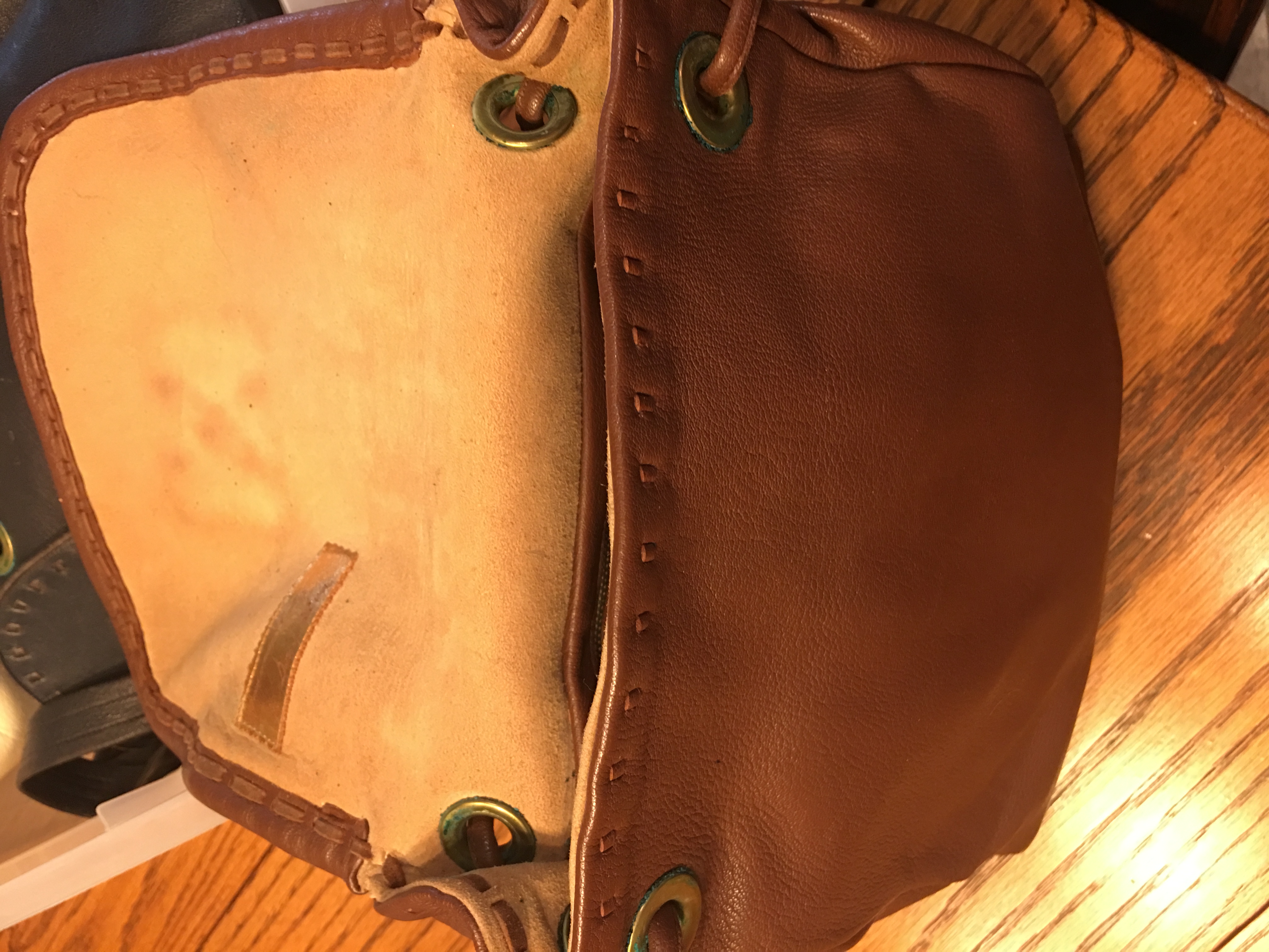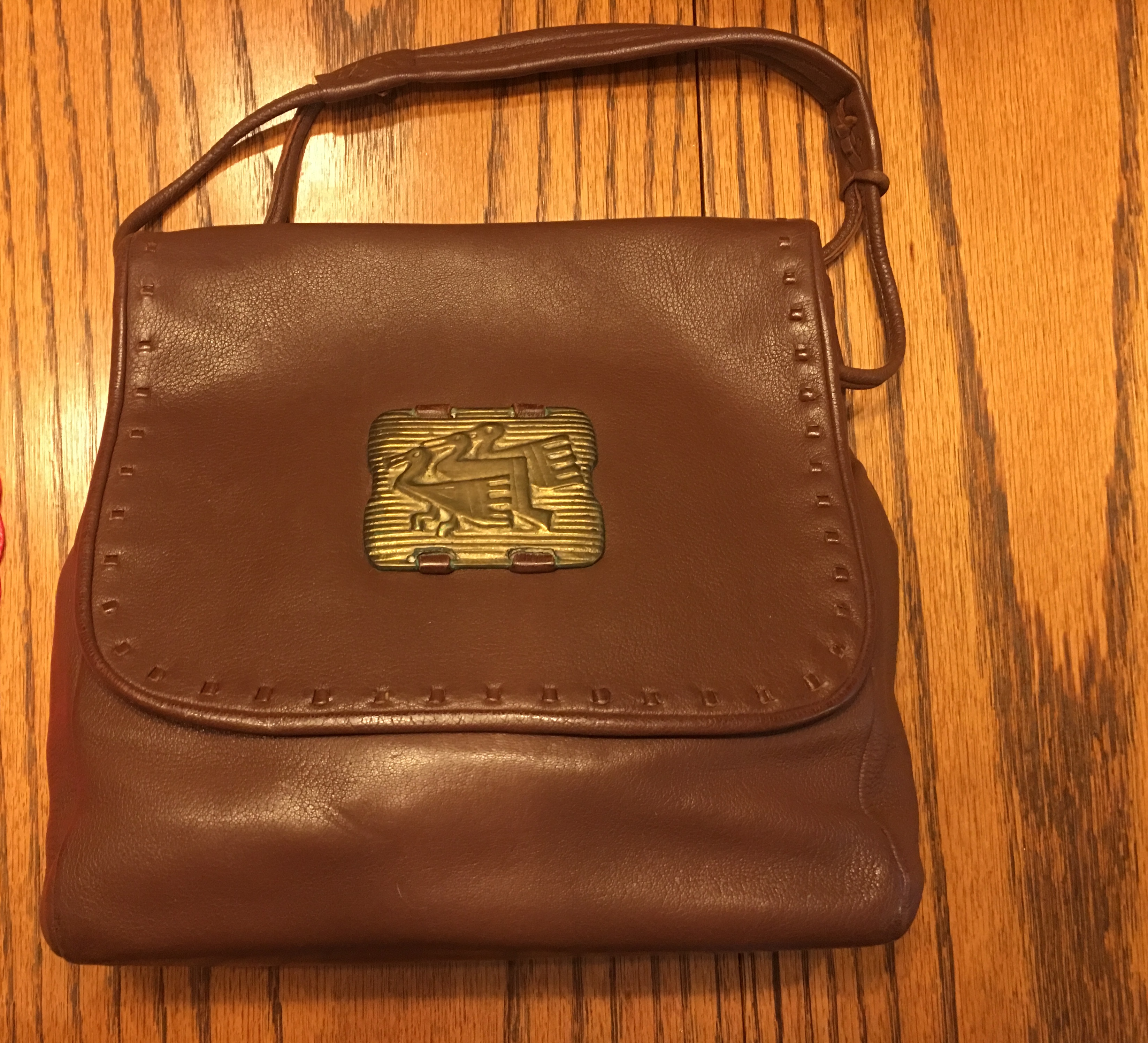Lloyd Kiva purse. 1950’s. Leather. Dark brown. Short straps. Pelican emblems on the front. Fabulous condition!