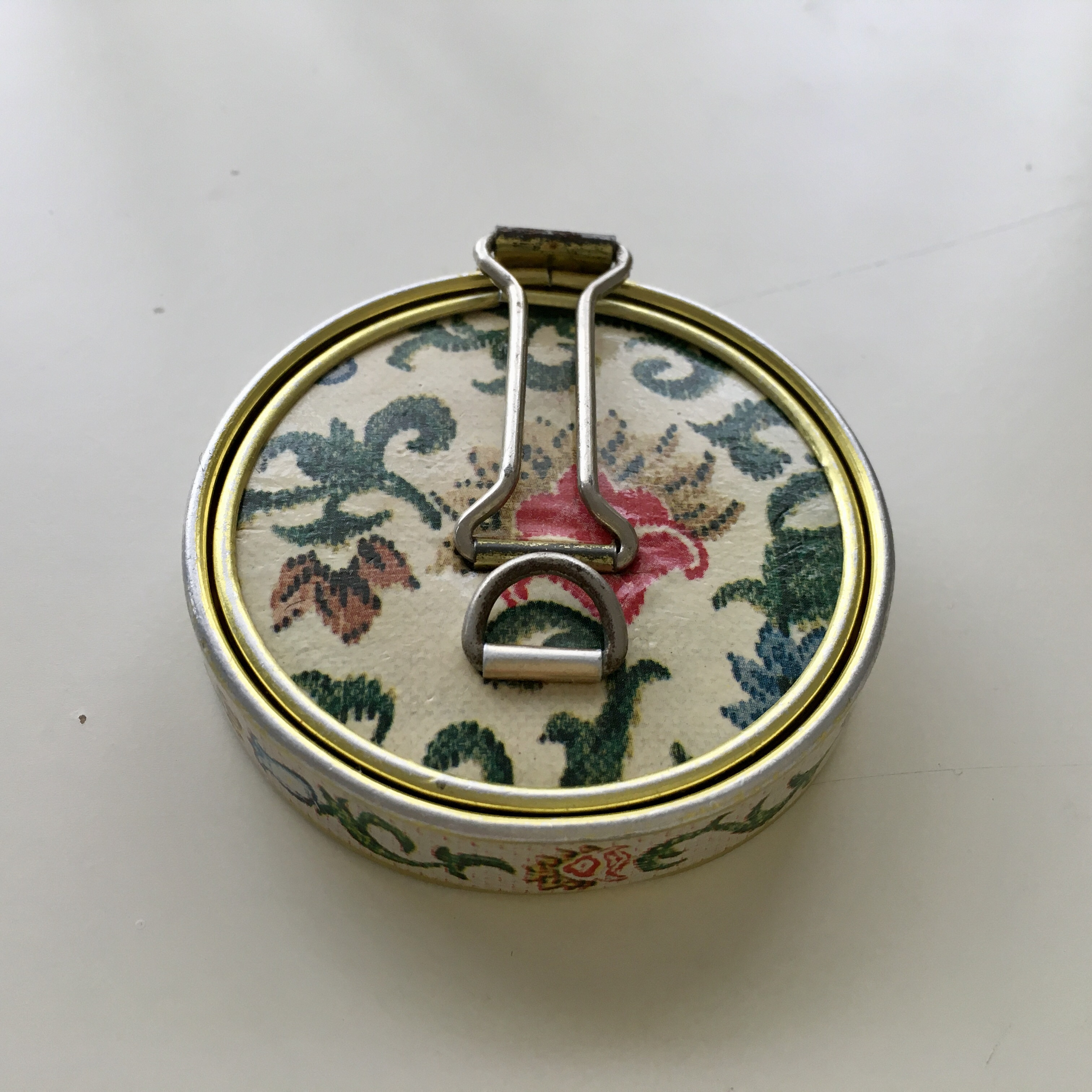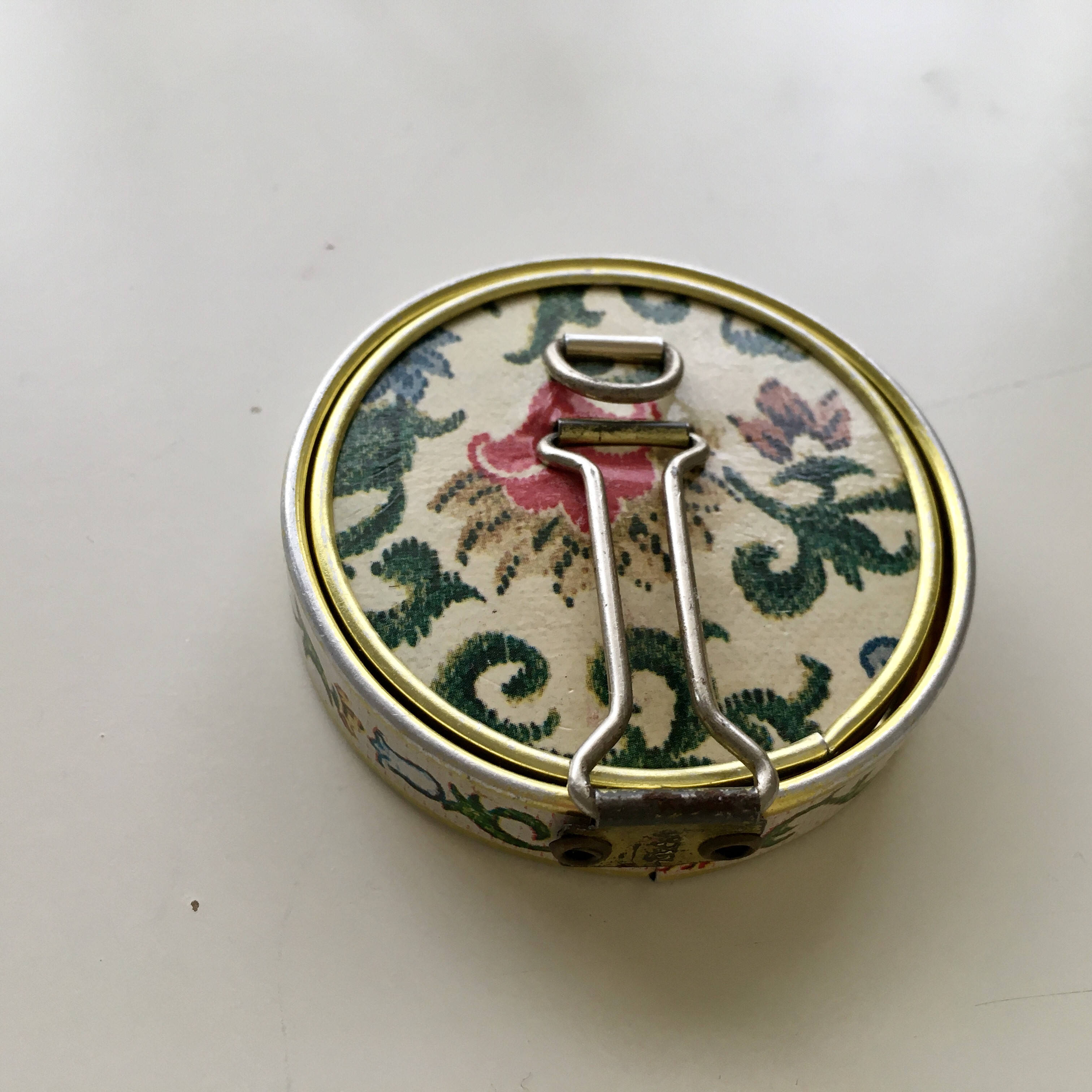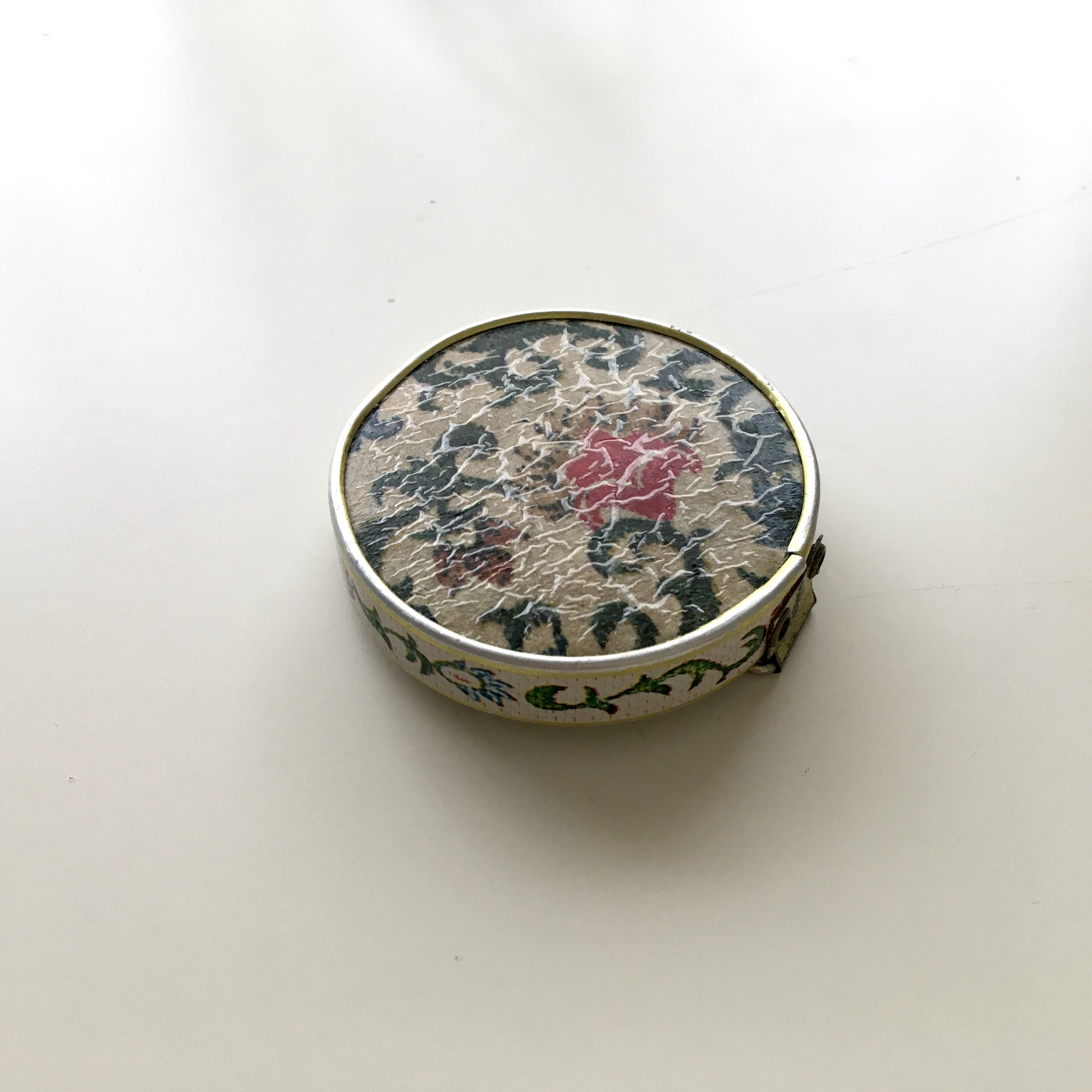 This compact mirror was made in postwar Japan, likely for export or as a tourist souvenir during the 1950s–60s, a time when Japan was known for high-quality, handcrafted novelty and beauty items. These mirrors often featured enameled, cloisonné, or leather-covered designs with floral or scenic motifs and were sold in upscale European and American boutiques or gifted during travel.