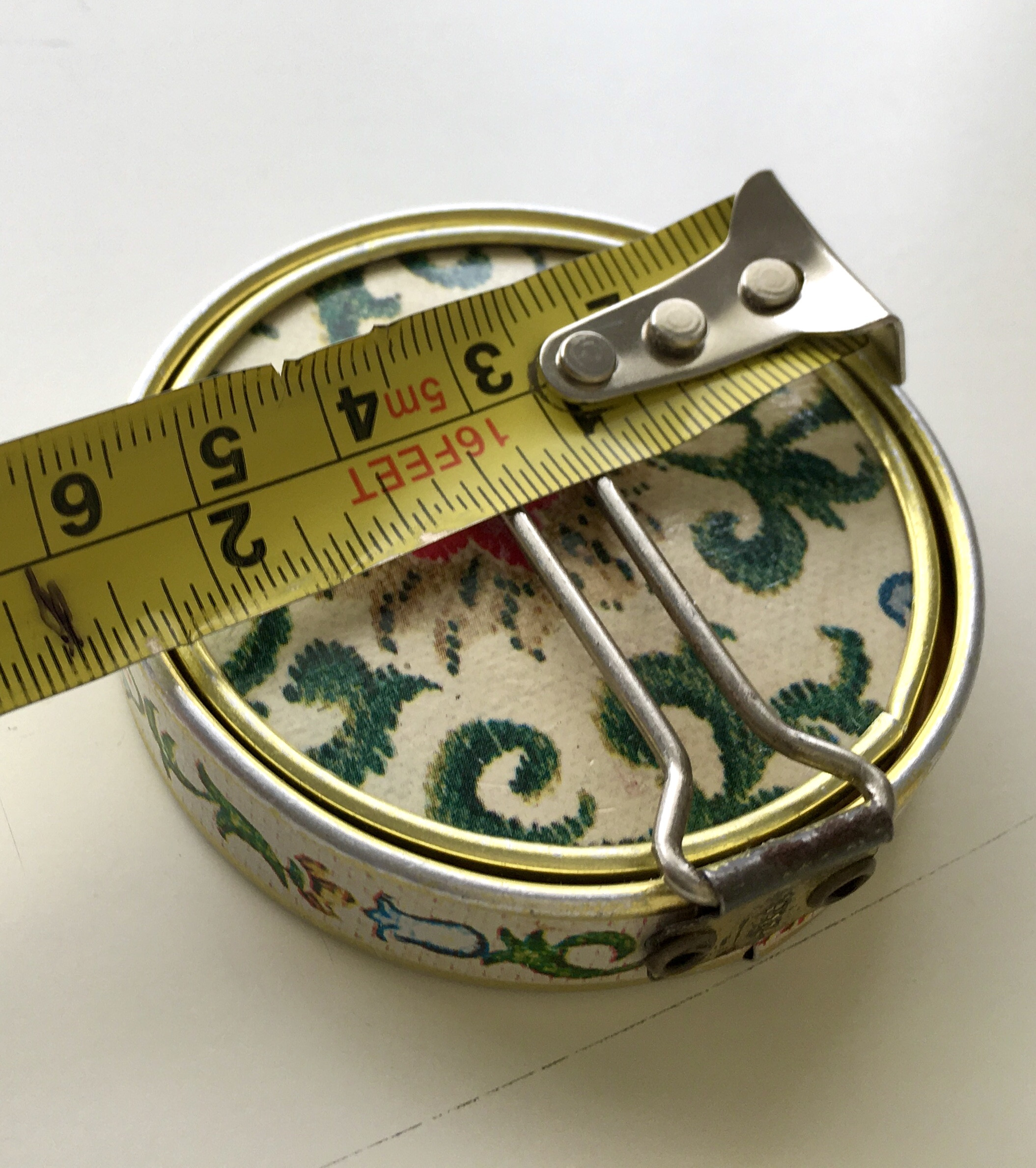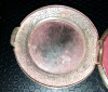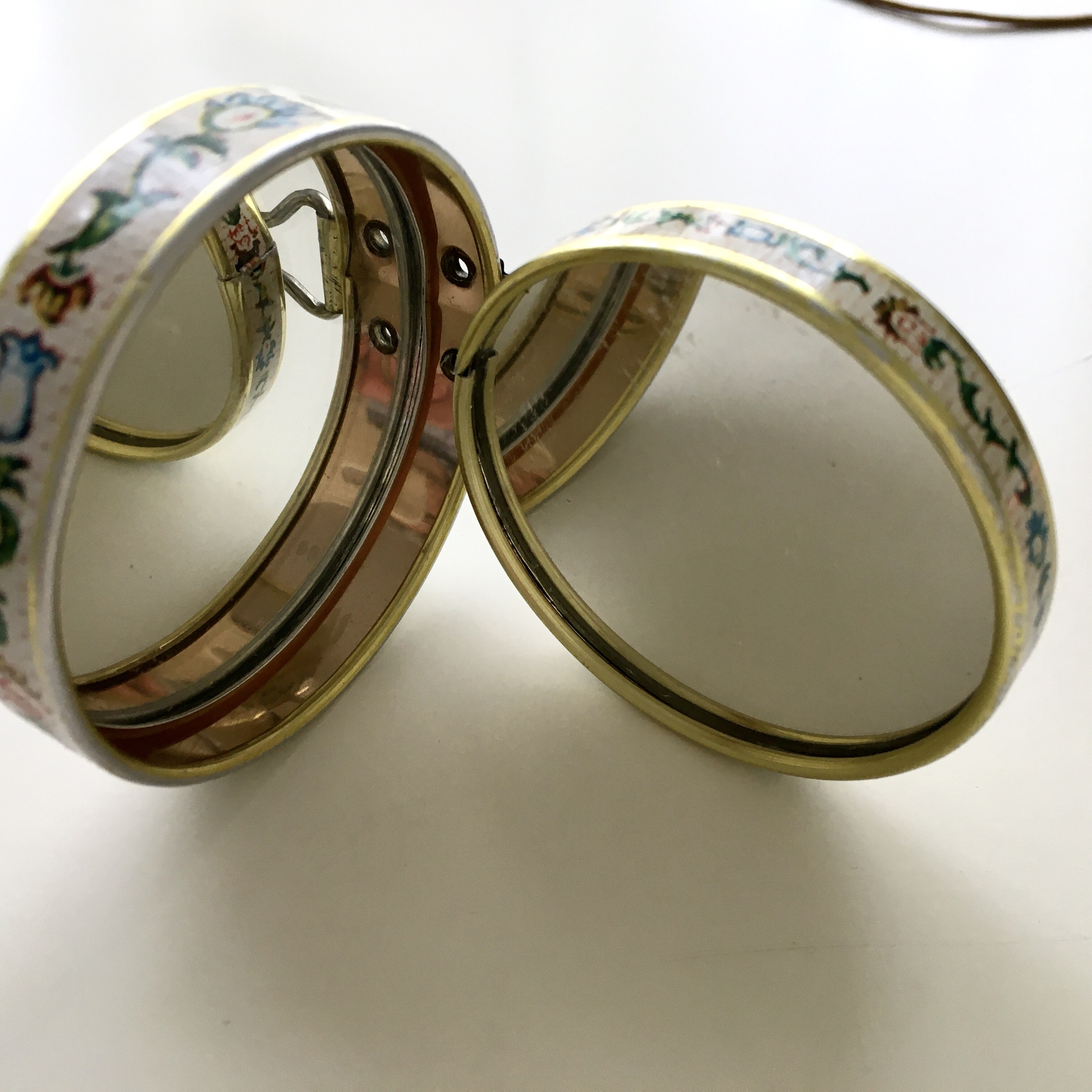 compact mirror purchased in the 1960s in Europe as souvenir. it has a leather cover painted floral . Brass ring and copper . Marked Japan on the side . It has a hook on one side to hang the mirror and it twists and can be set on a table .it’s been kept in mint condition . Just wear and tear a little on the back metal part . I believe it’s handmade , materials used genuine leather, brass, copper and gold fills