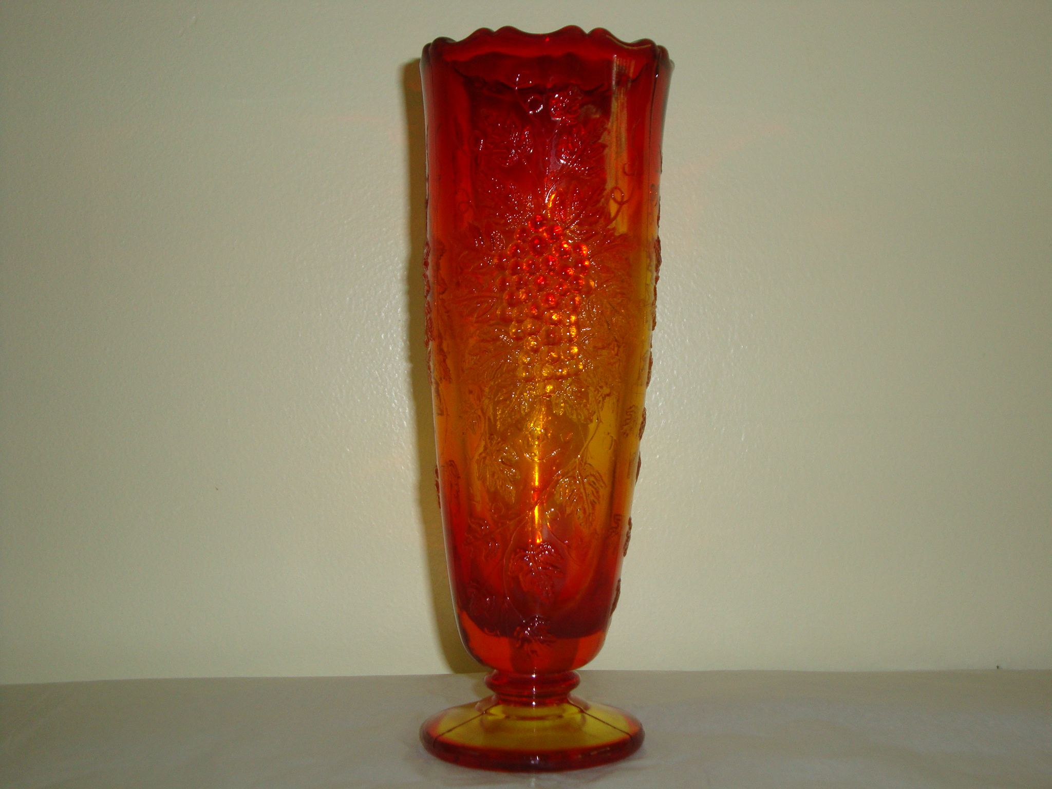 Vintage red and yellow glass vase stands 9" tall.  Has embossed grape clusters and grape leaves and ruffled top.  Has 2 side seams and 3 seams on bottom pedestal.  Does not have any label or marking.