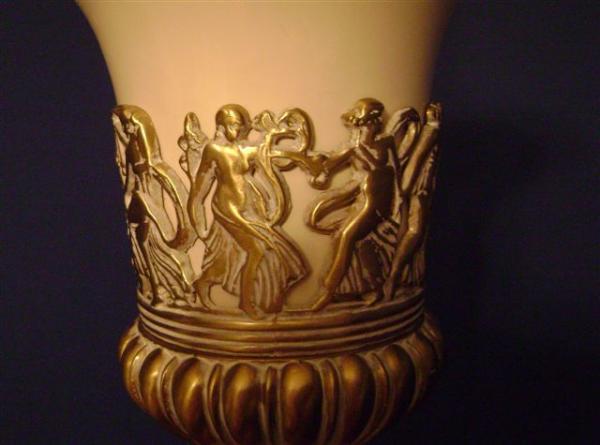 There are two parts of the lamp body: the top part is 11" x 9", with 9 dancing figures on it. The lower part is 7" x 7" x 9". The background of lamp body is painted in ivory.