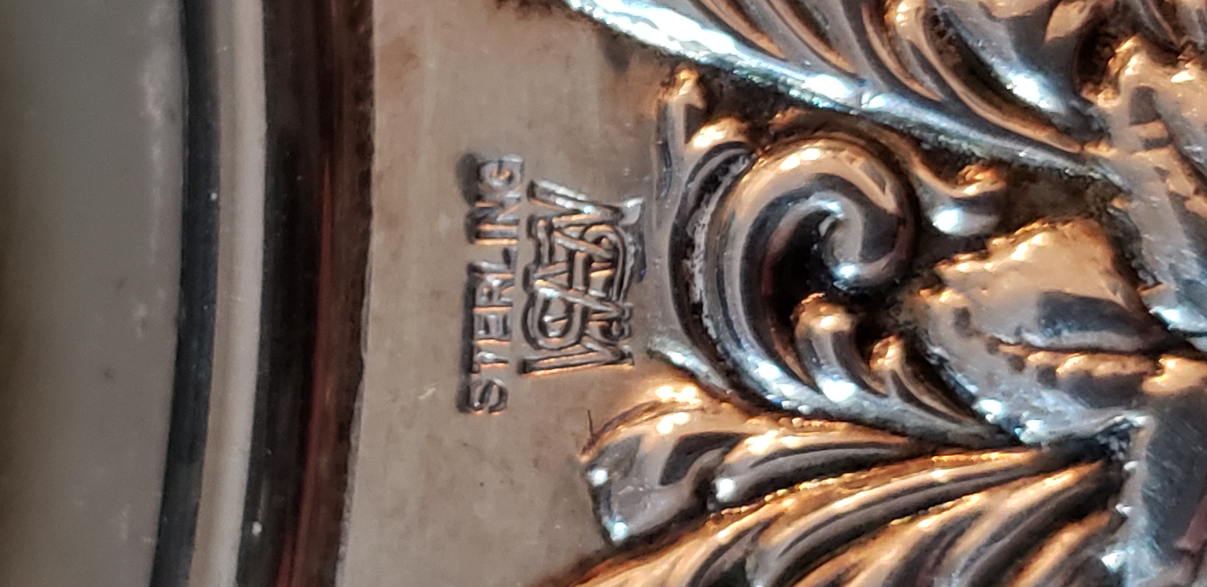 This is a vintage repousse sterling silver hand mirror. I'm trying to figure out the maker. I believe the makers mark is under the word sterling, as you can see in one of the photos. However, I can't figure out the makers mark. If anyone can assist me with the maker, age and value. I'd appreciate it. Thank you!