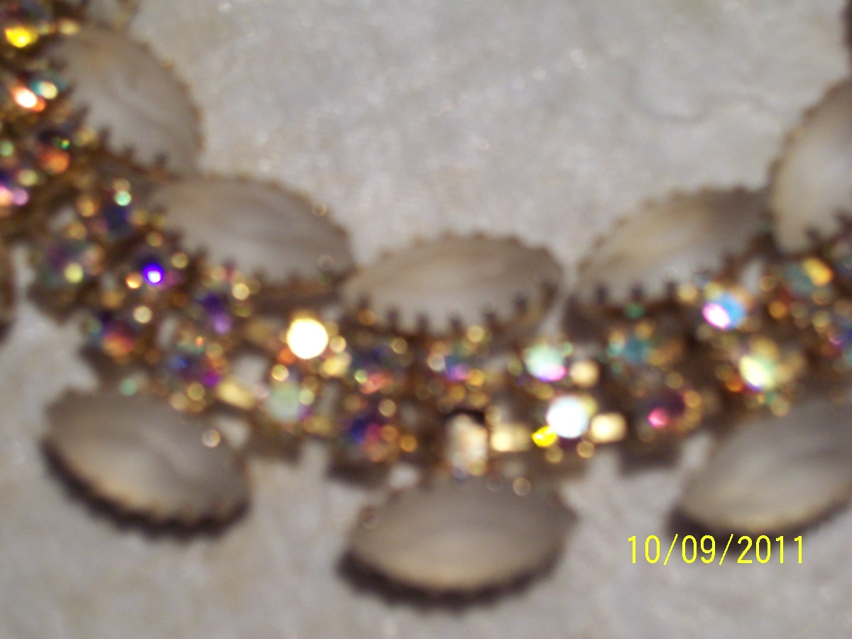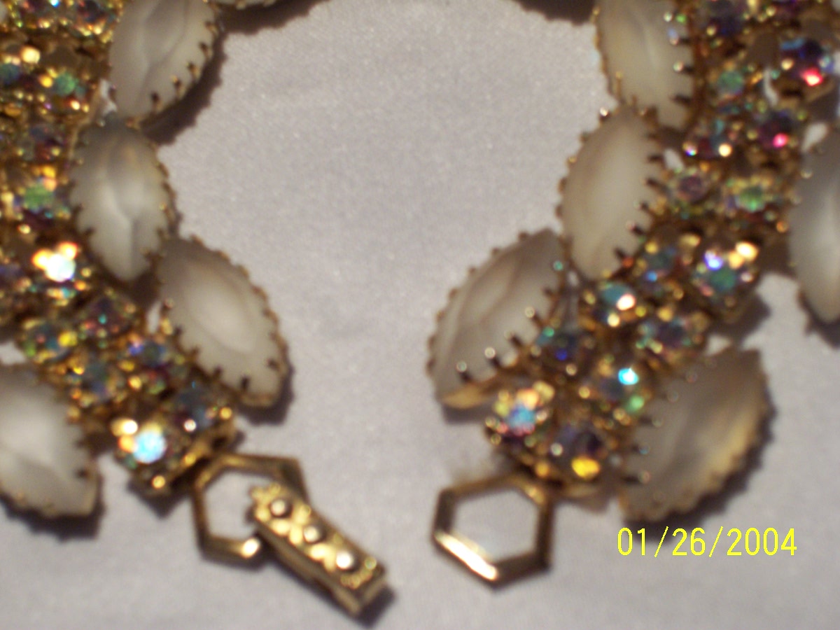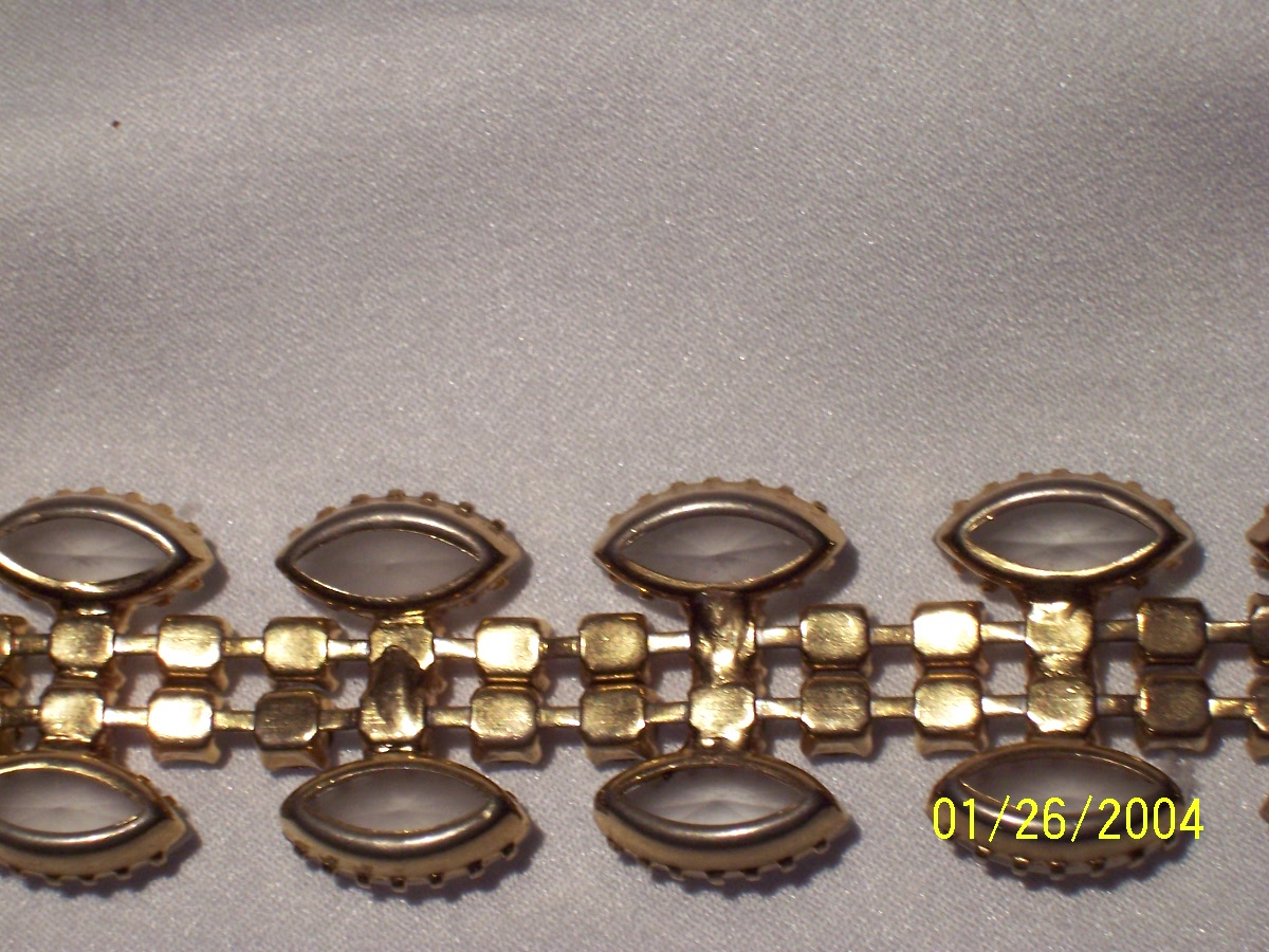 The bracelet has 2 rows of 25 rhinestones, in aurora borealis finish, on the inside and a row of 9 frosted glass marquis-shaped stones on each (out)side with a fold-over clasp. The marquis stones are open-backed dog-tooth settings (with 14 prongs), while the back of the rhinestones are solid. The gold (?)has some uneveness where the outside and inside rows are held together. The research shows that this is called a 'figure 8'..kind of an extra blob of metal.