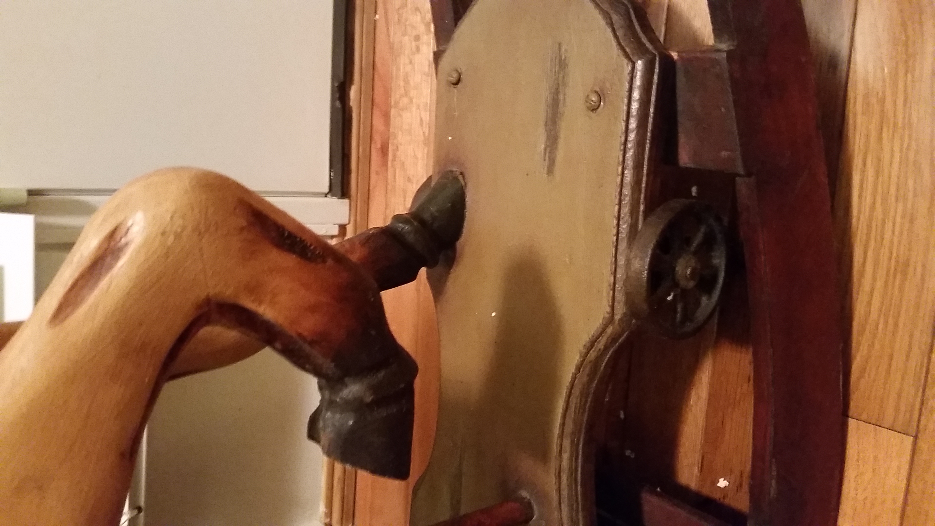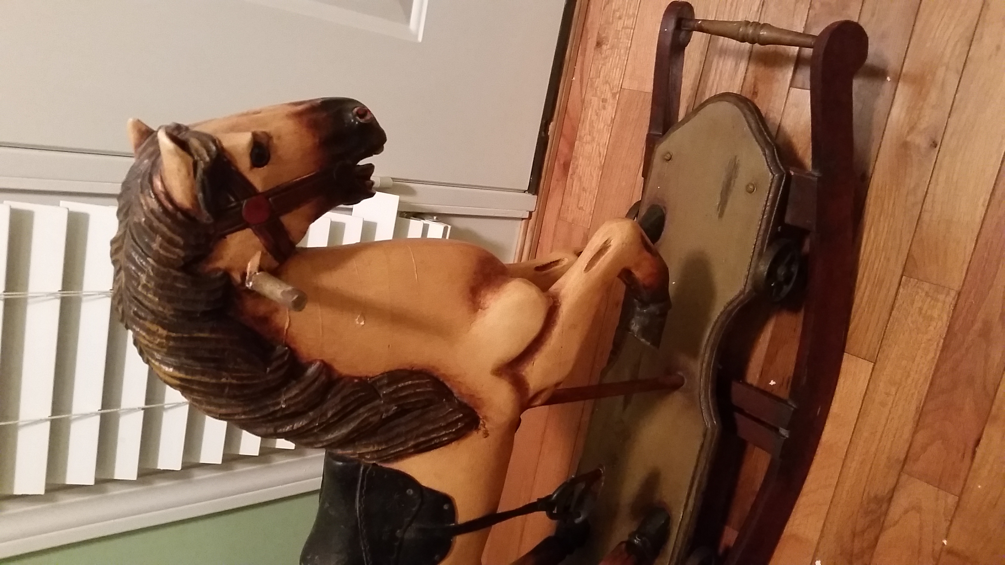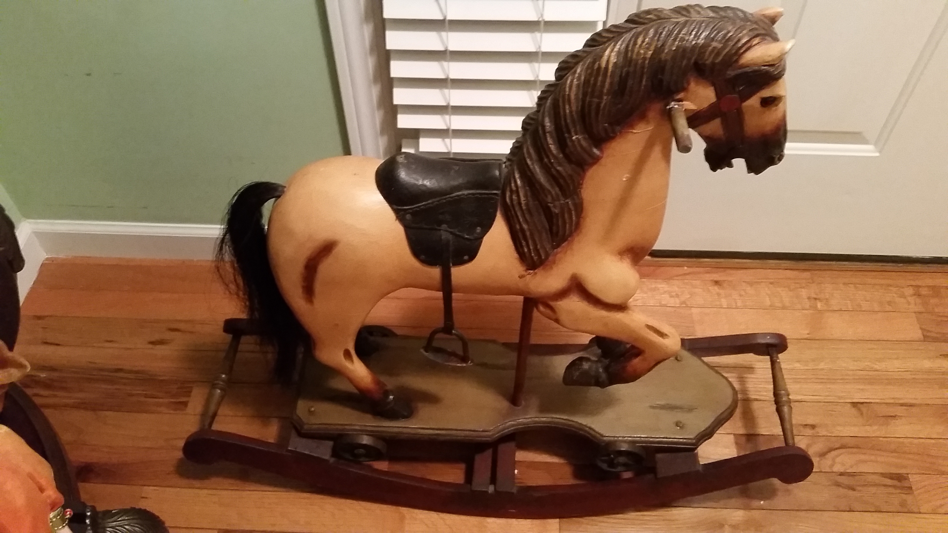 Bought this from a couple and paid 100.00. Said shes owned atleast 20 yrs but thinks it could be between 20-30 yrs old, but she wasnt too sure. It seems to be made of carved wood, metal wheels and stirrups, horse hair and leather saddle.Im not sure if this is a sears robuck reproduction from possibly 1987 or an antique. It does seem to be in really condition for its age of atleast almost 30 yrs, if thats the case. Im wanting to know if this is a replica or not. How old os it? How much would somthing like this would be worth?
