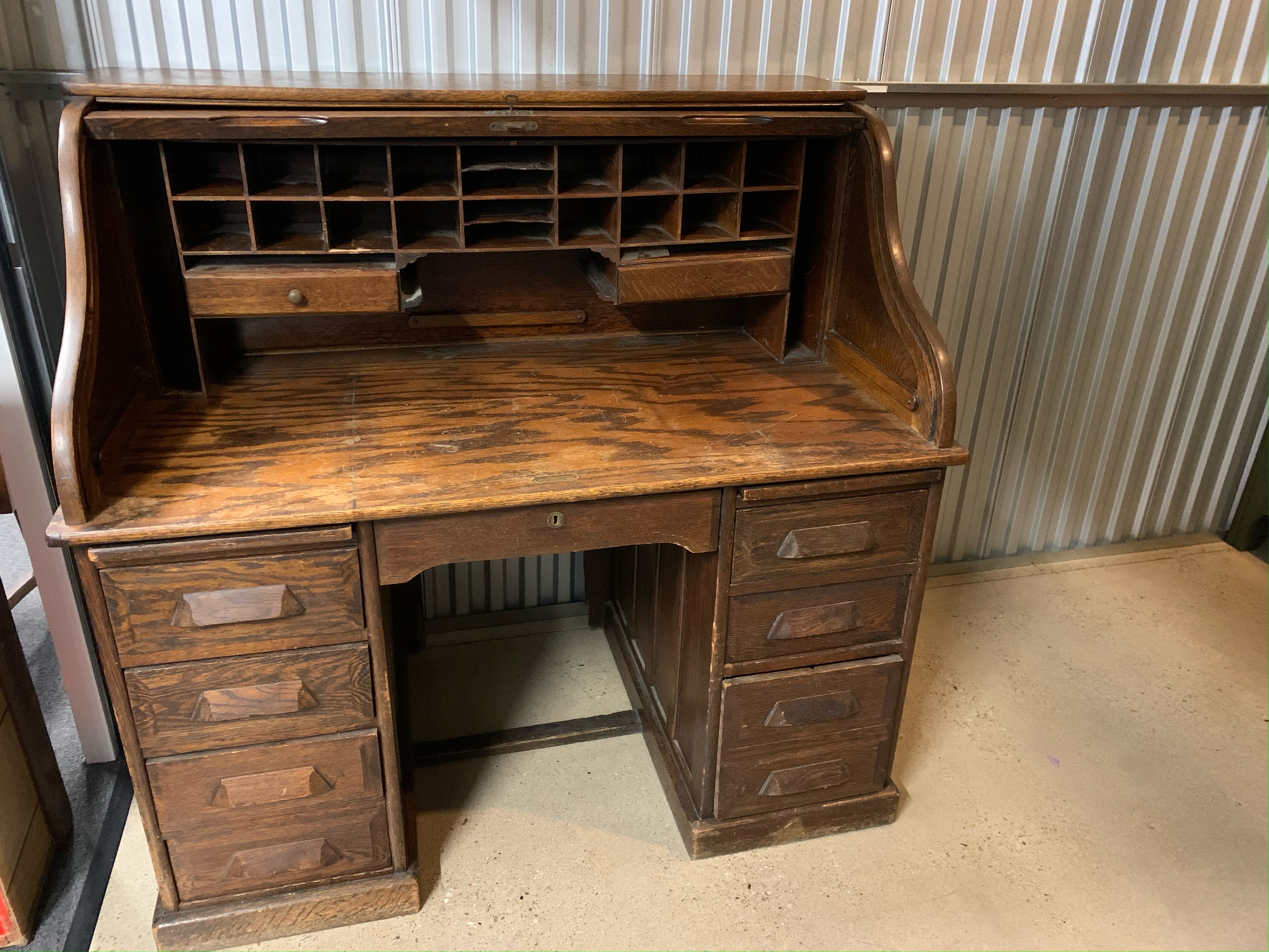 Solid wood roll top desk. My father purchased it from someone else back in the 1960's we think.