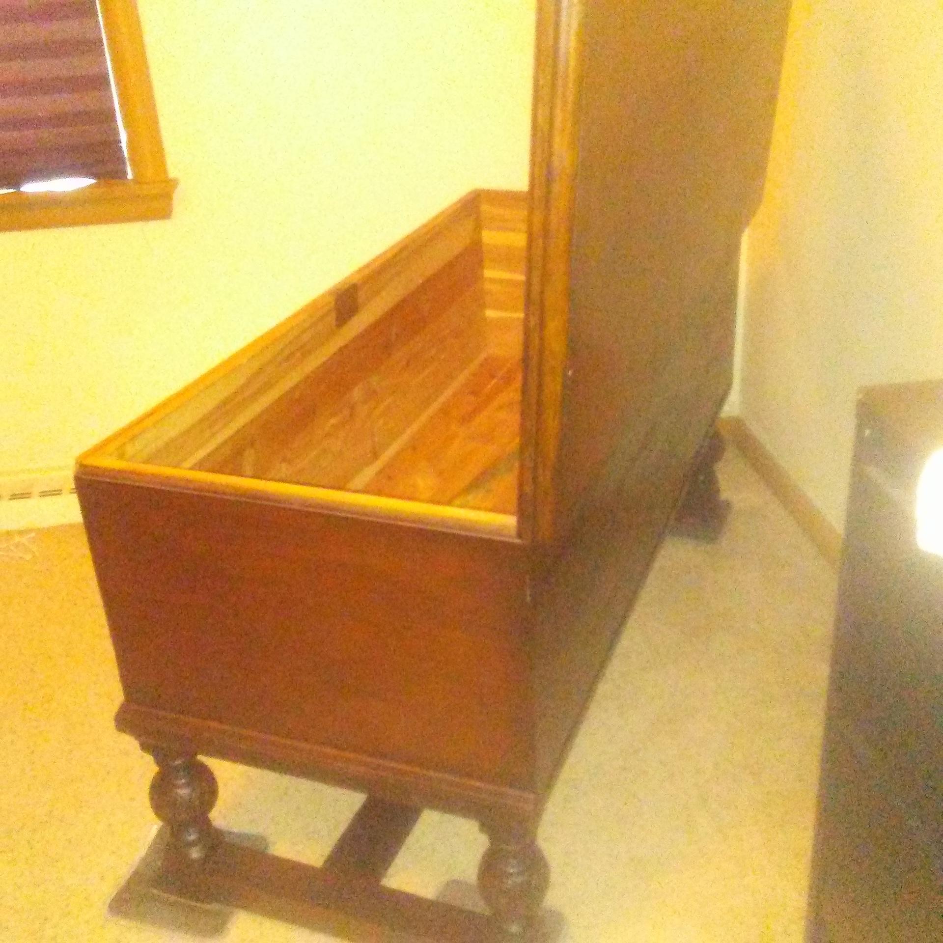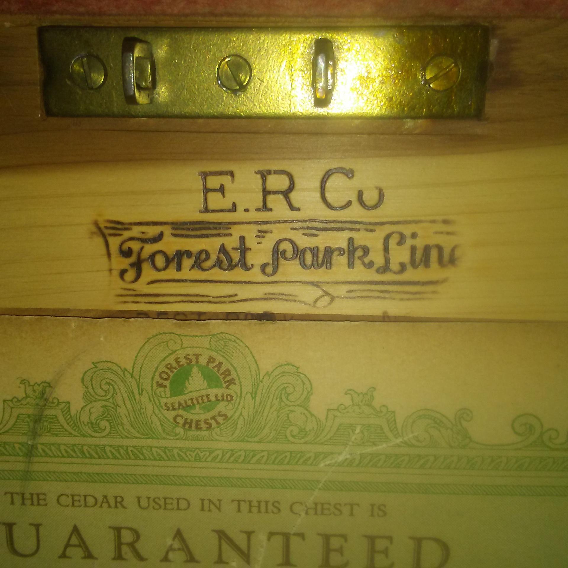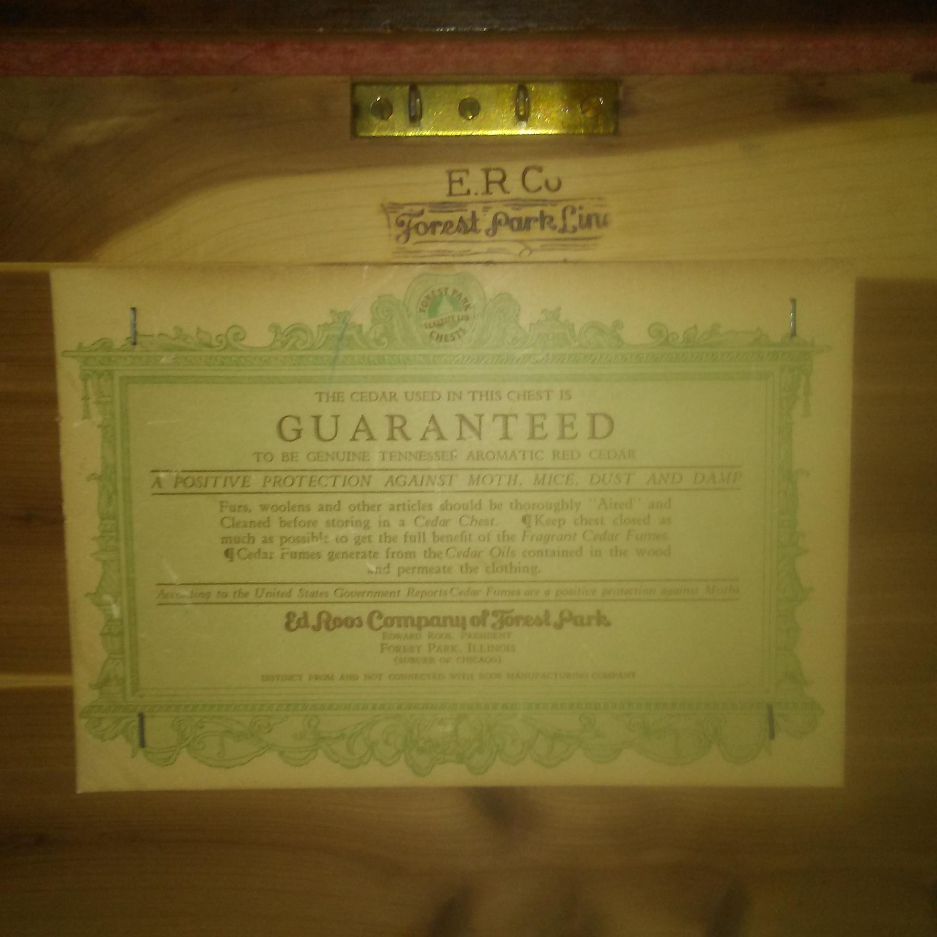 Ed Roos Company of Forrest Park, IL (not connected with Roos Manufacturing). Cedar chest, fully lined with cedar (in perfect condition), carvings on legs and ornate carving on front. The number 4246 is stamped on the bottom. Used, it has several scratches due to moving and some of the finishing had worn off. The veneer however is intact. There is one lower side molding off but I have the piece. The "Guarantee Certificate" is fully intact on the inside of the cover. All hardware is original.