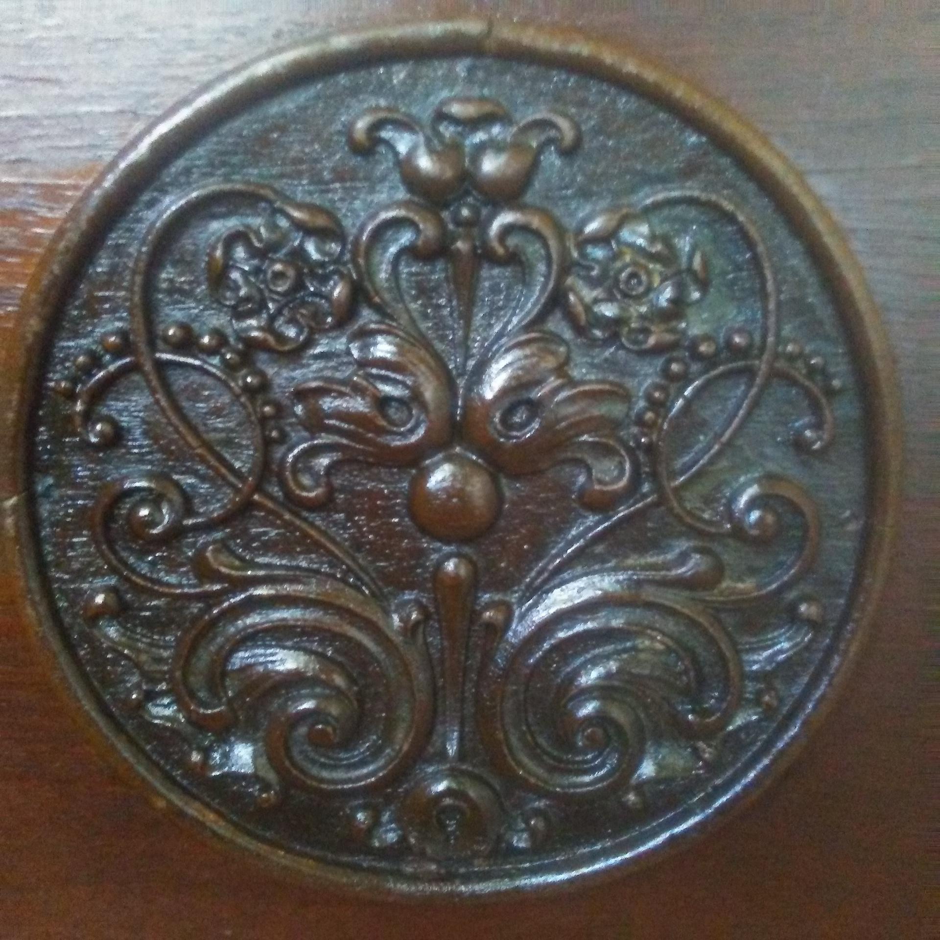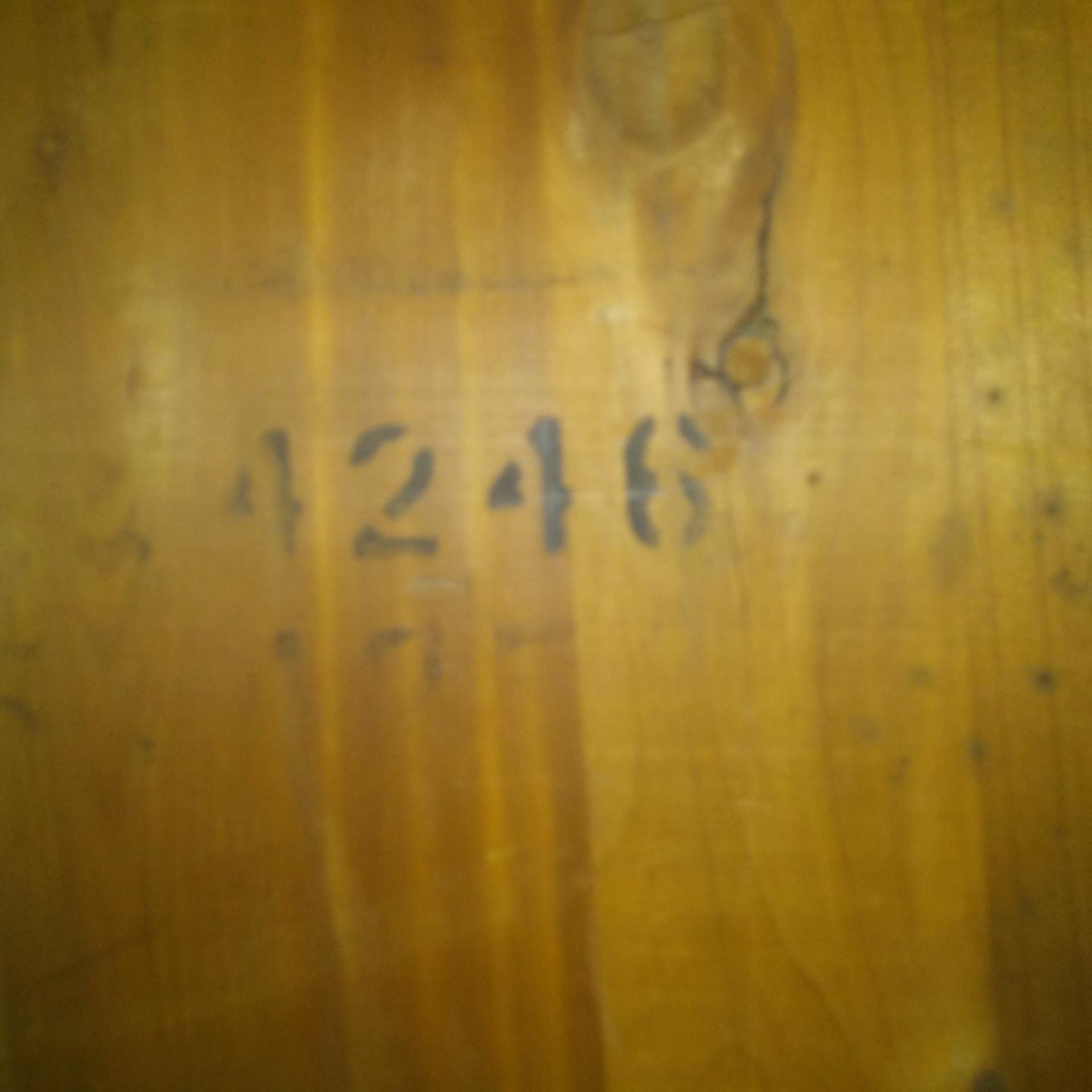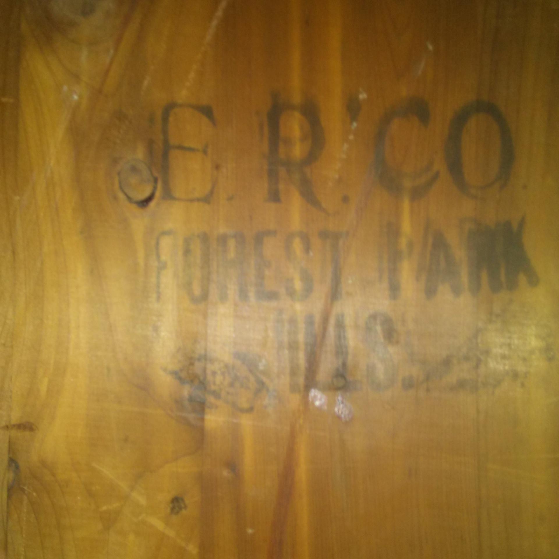 Ed Roos Company of Forrest Park, IL (not connected with Roos Manufacturing). Cedar chest, fully lined with cedar (in perfect condition), carvings on legs and ornate carving on front. The number 4246 is stamped on the bottom. Used, it has several scratches due to moving and some of the finishing had worn off. The veneer however is intact. There is one lower side molding off but I have the piece. The "Guarantee Certificate" is fully intact on the inside of the cover. All hardware is original.