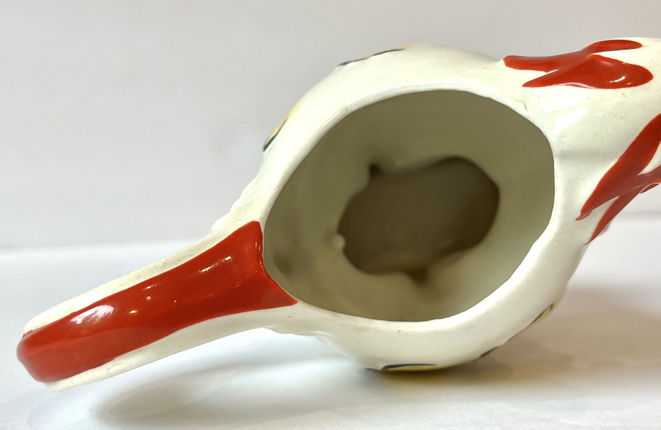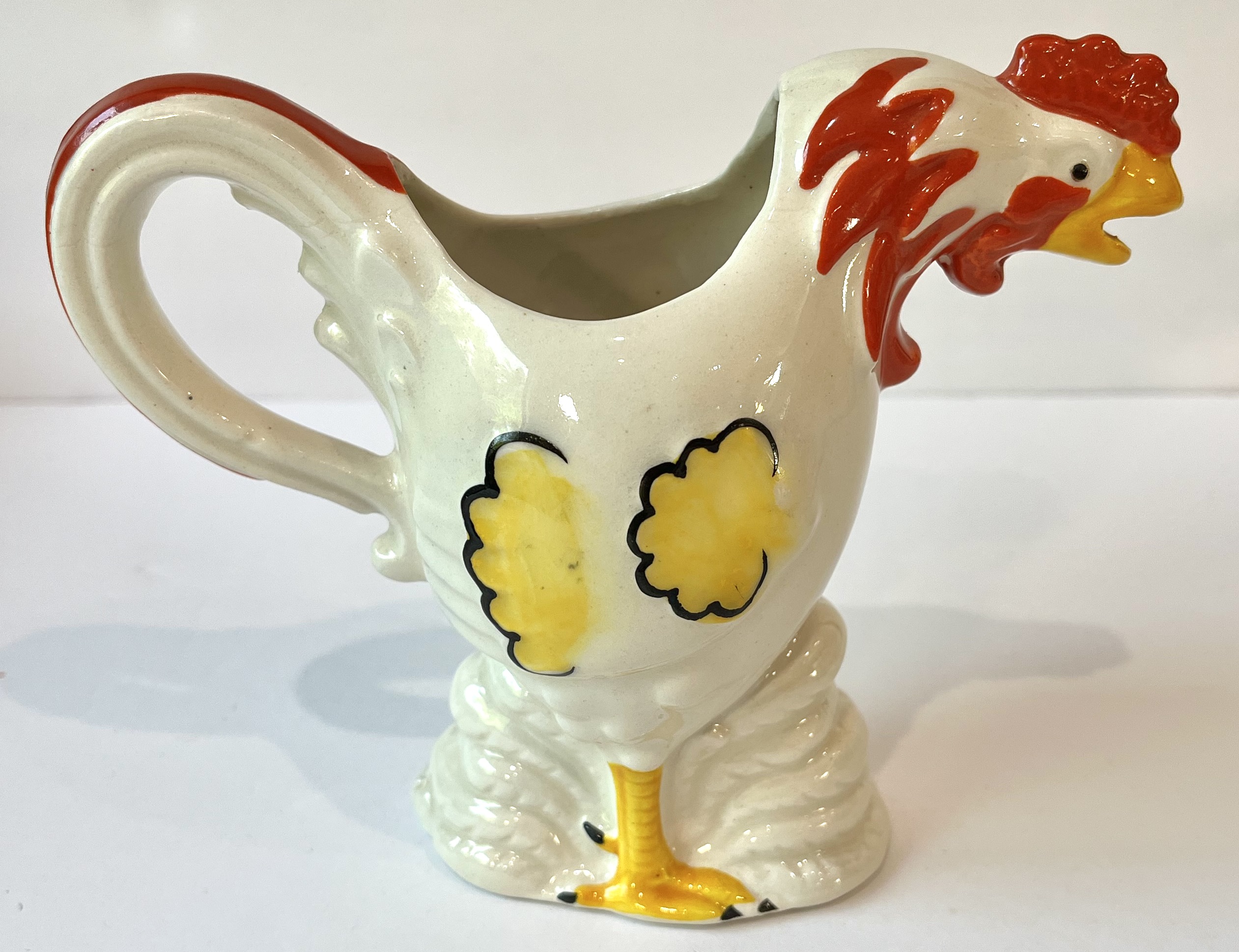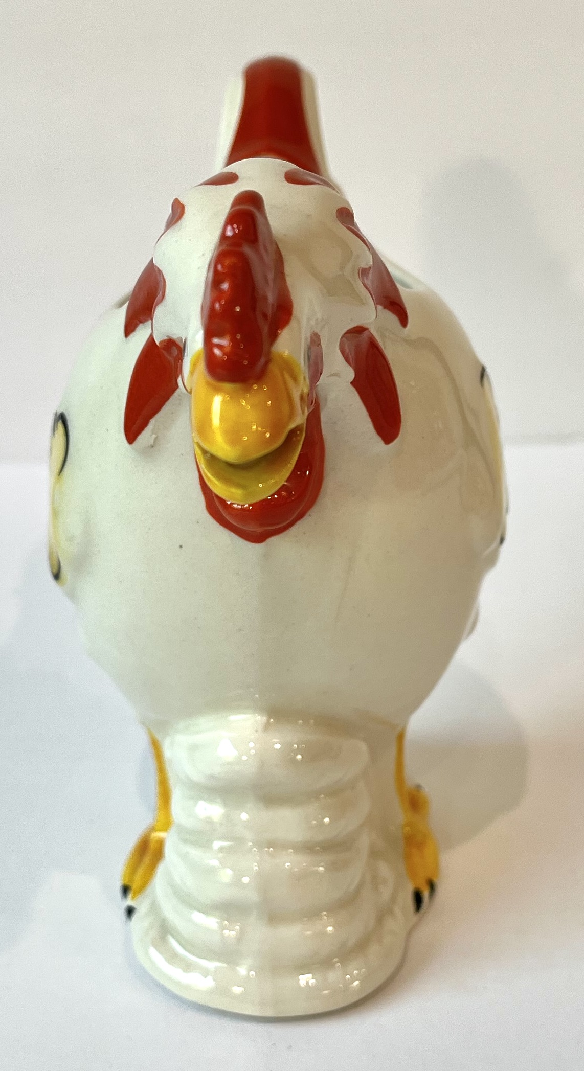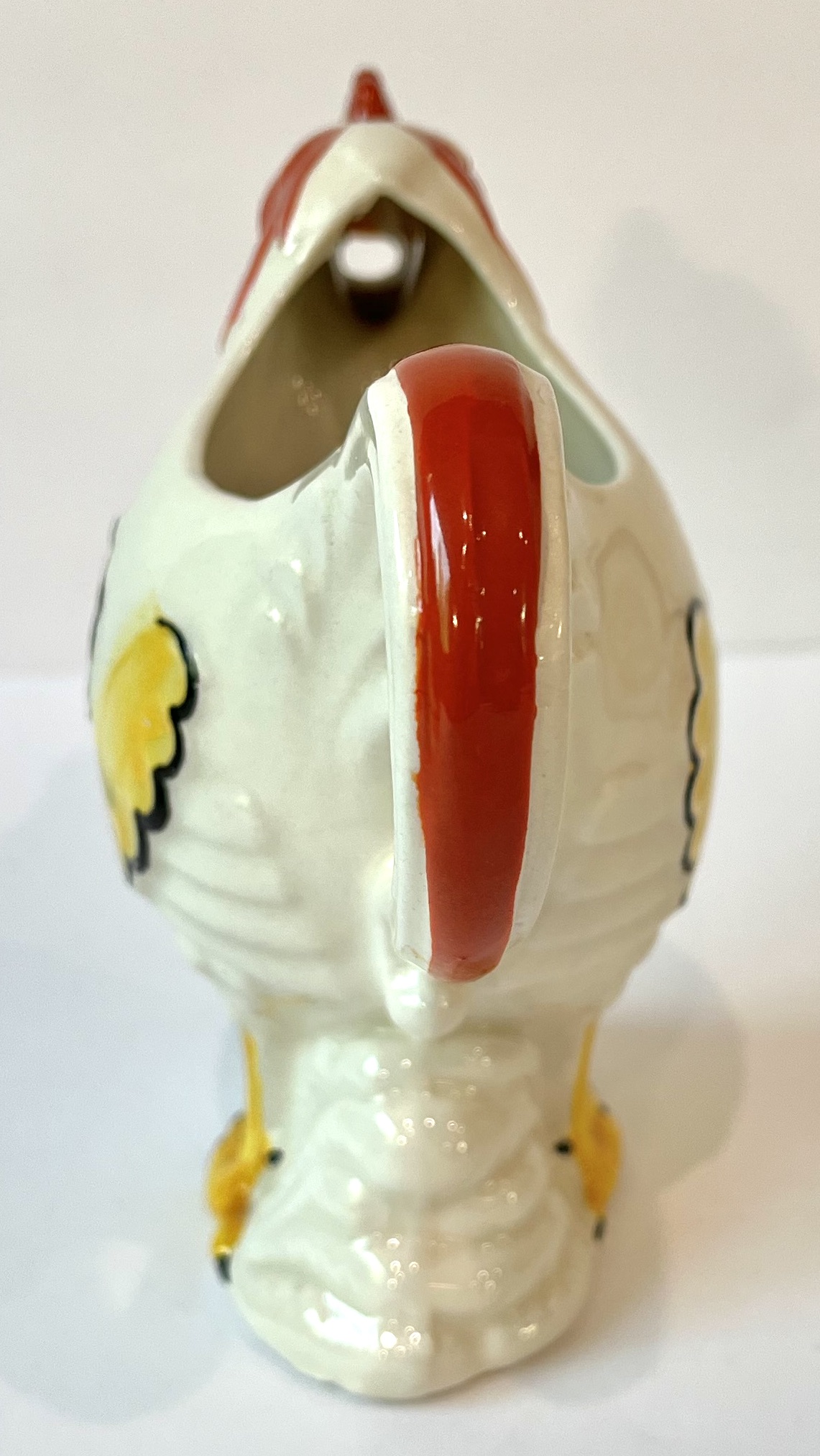 This charming vintage pitcher is designed in the shape of a rooster, showcasing vibrant colors with a glossy finish. The rooster's head is adorned with a bright red comb, while its body features white porcelain with yellow accents on its wings and feet. The handle is elegantly shaped, resembling the rooster's neck, adding to its whimsical appeal.