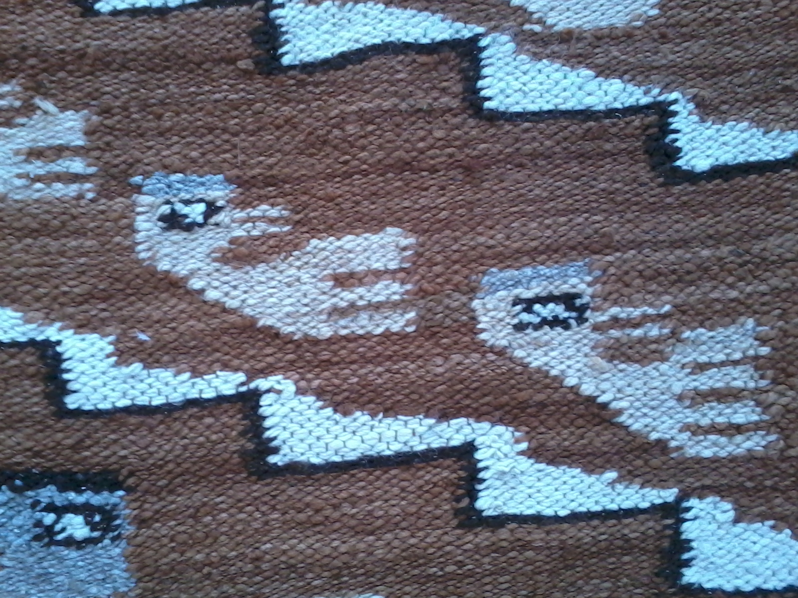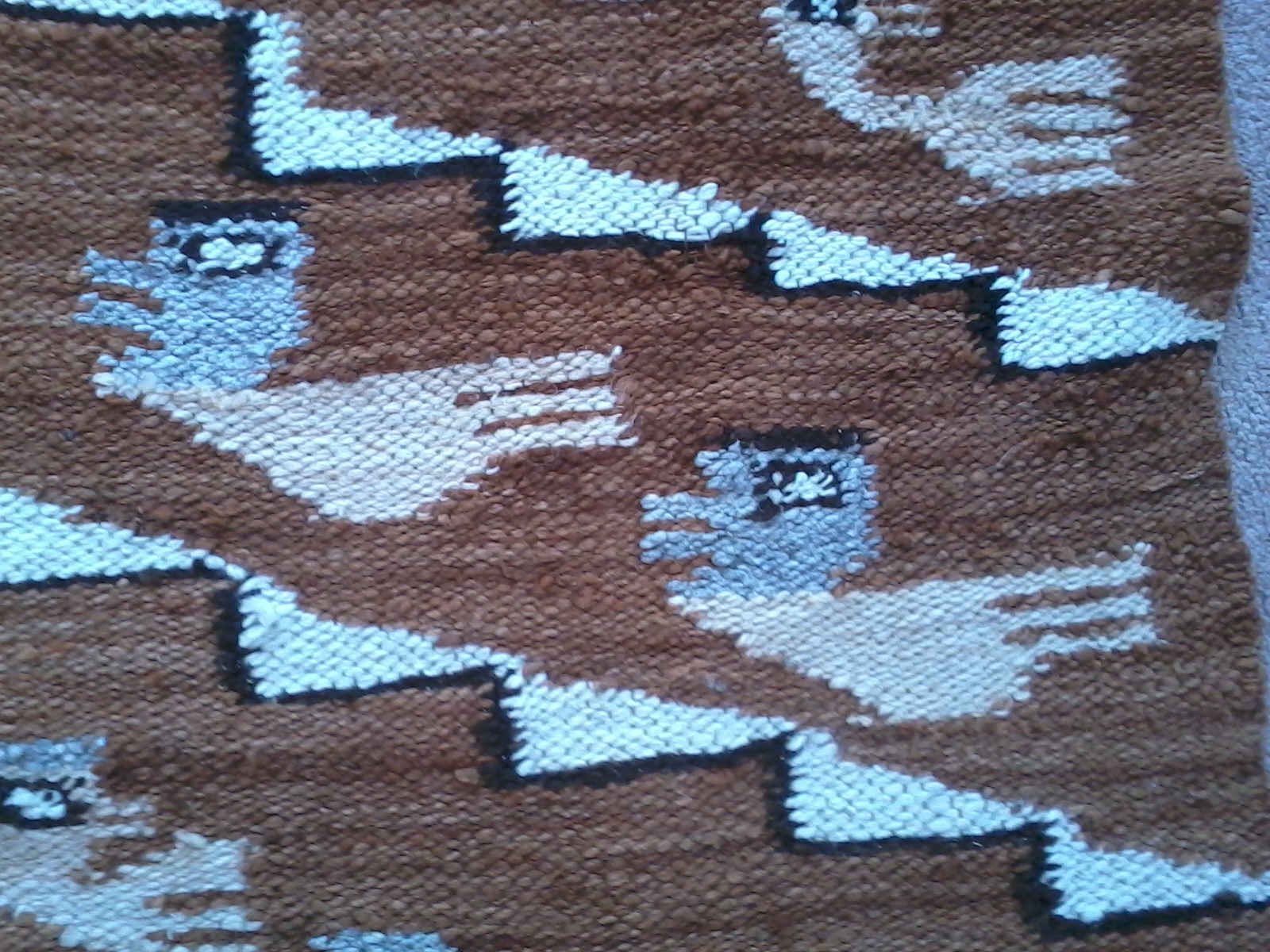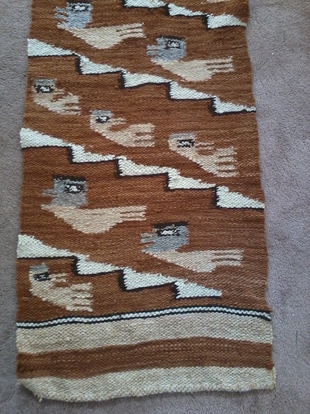 Great-aunt recently passed and I now have these two area rugs/ wall hangings, but am not entirely sure what I have. She traveled the world, collected pieces from all over. The Peruvian rug with the browns, gray and white is a wool (95%) blend 64"x21". The rug in a bird motif doesn't have any tags or markings, is 56"x22". Please help me further identify the symbols/ meanings of the Peruvian rug and any information on the bird motif rug and their values. Have searched extensively online for comparable rugs, and only found a rug in a bird motif that was somewhat similar to the one I have, but there wasn't information I could use. Many thanks.