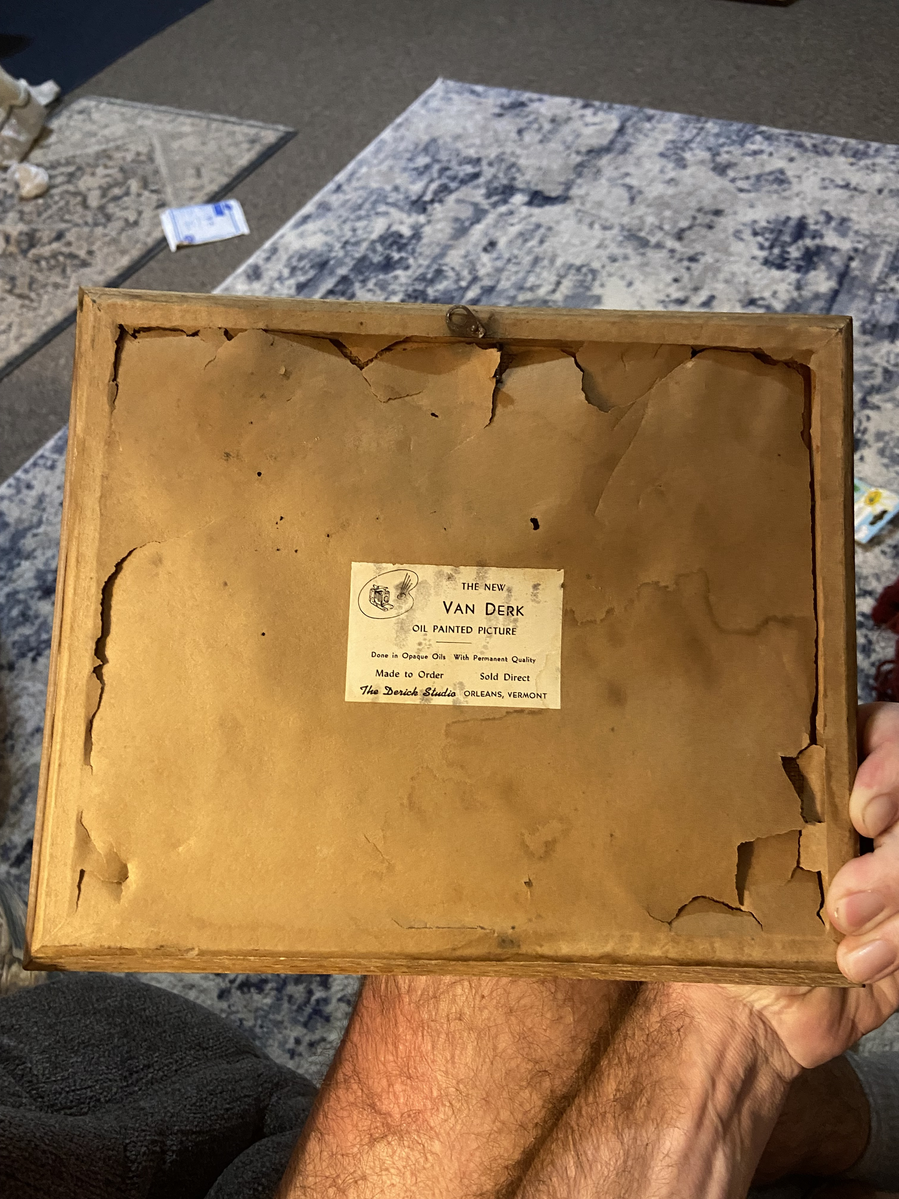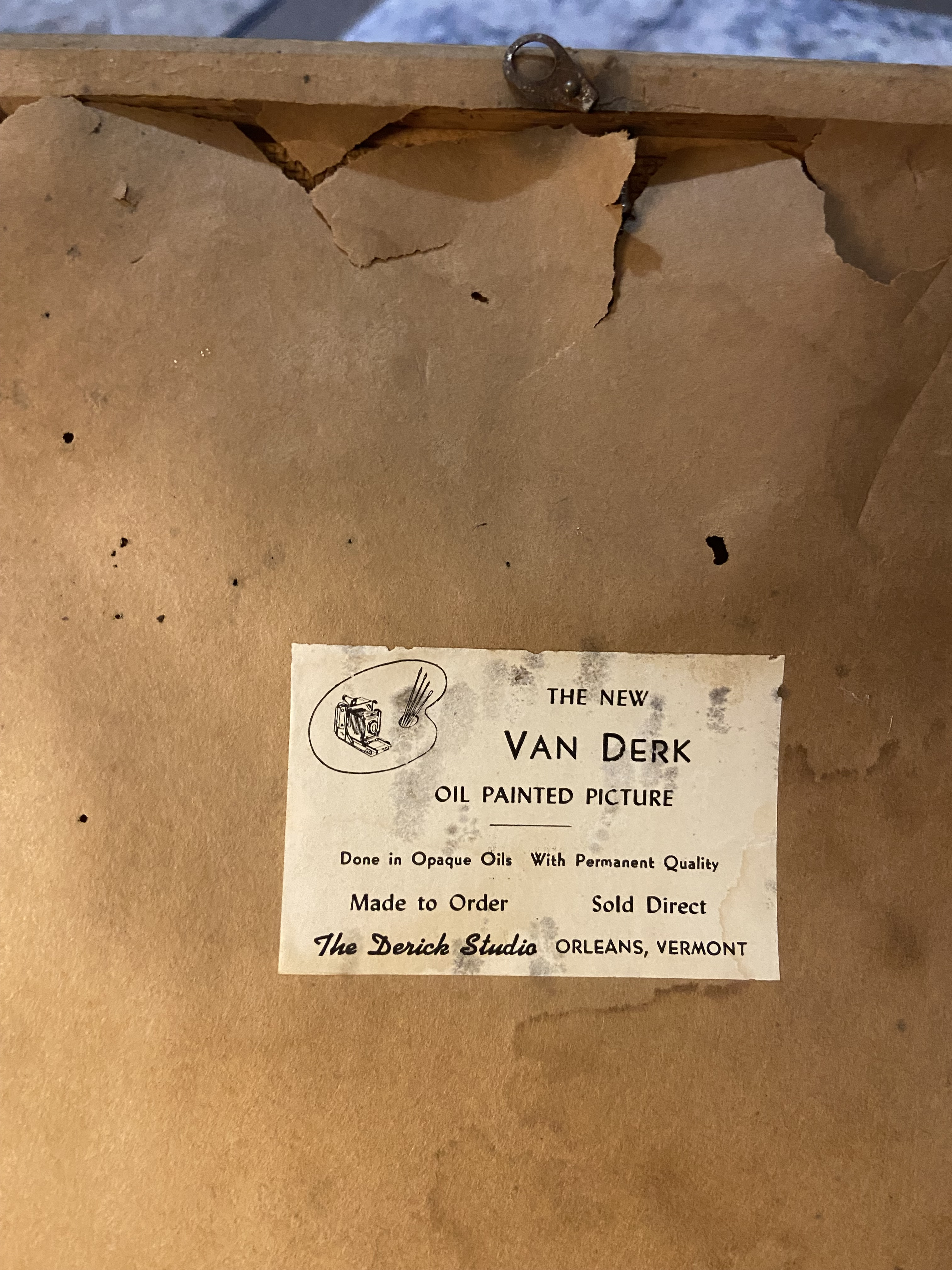 The painting is attributed to "Van Derk," likely a pseudonym or studio name. The label on the back indicates it was sold by The Derick Studio in Orleans, Vermont. This studio was known for producing oil paintings, often made to order, during the mid-20th century.