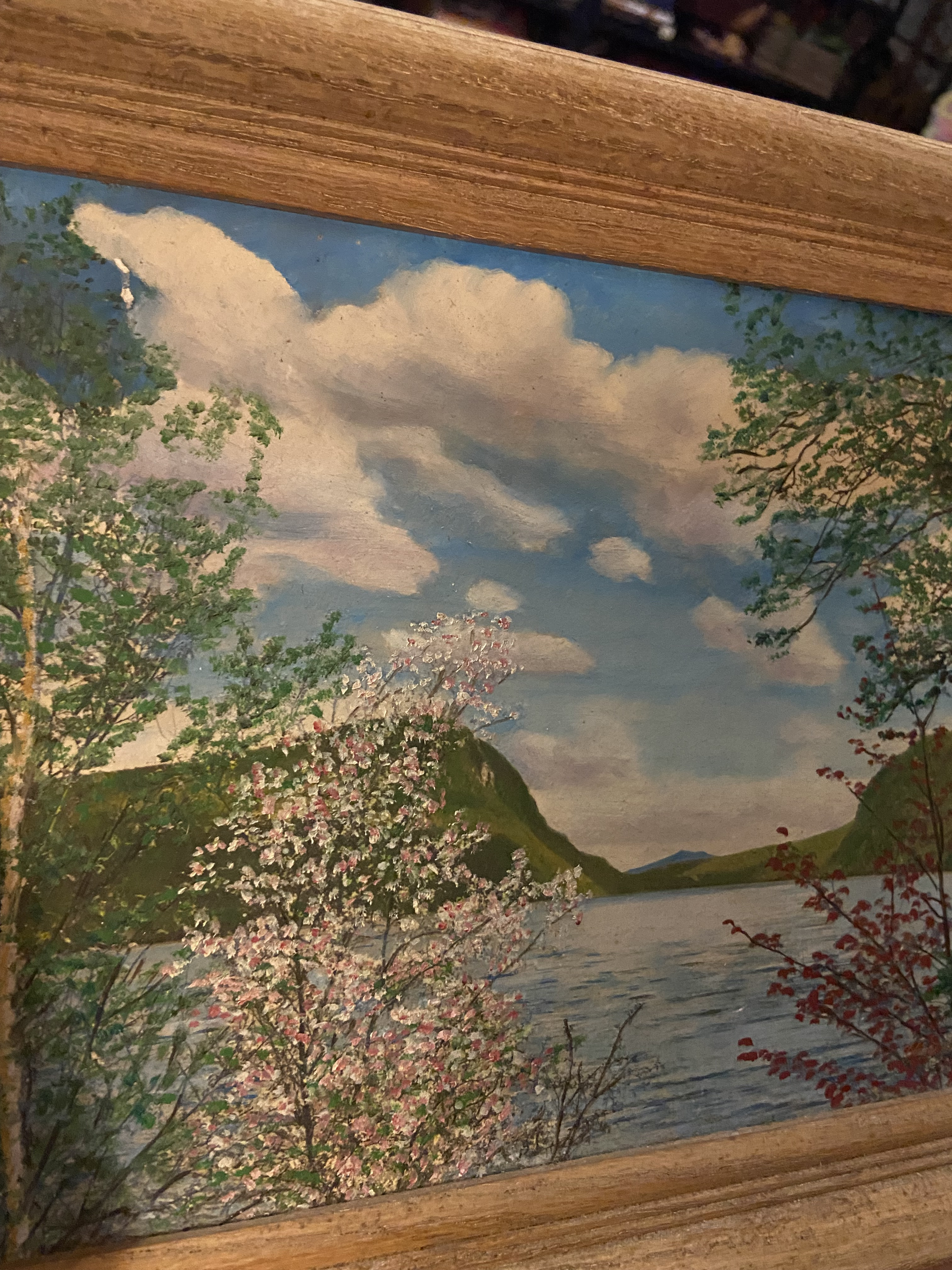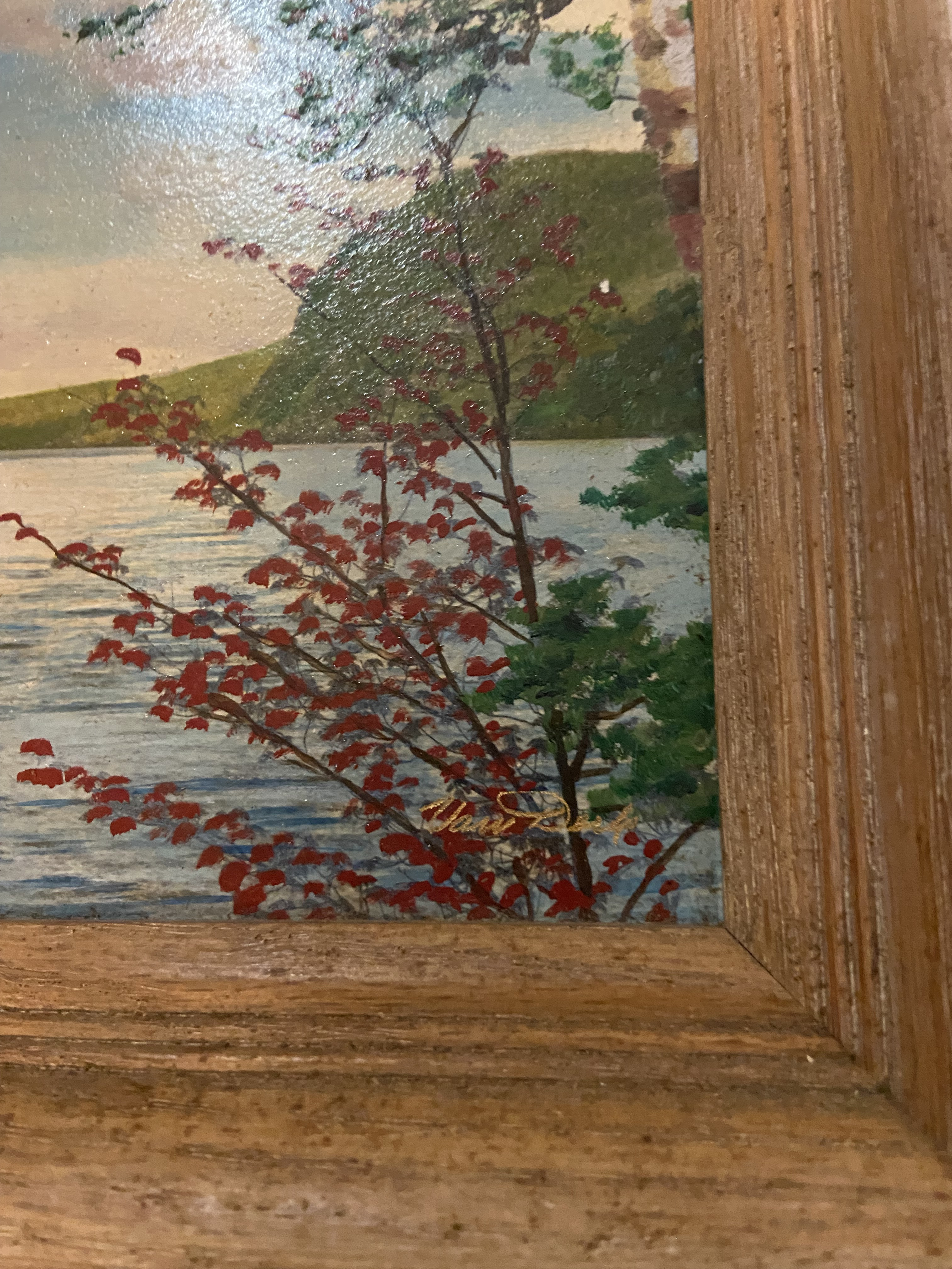 Physical Description: This vintage oil painting depicts a serene landscape featuring trees, water, grassy mountains, a blue sky, and white clouds. The painting is framed in a simple wooden frame. The signature appears to read "Van Derk" in the lower right corner. The painting is done in opaque oils, suggesting a quality finish.