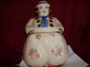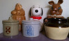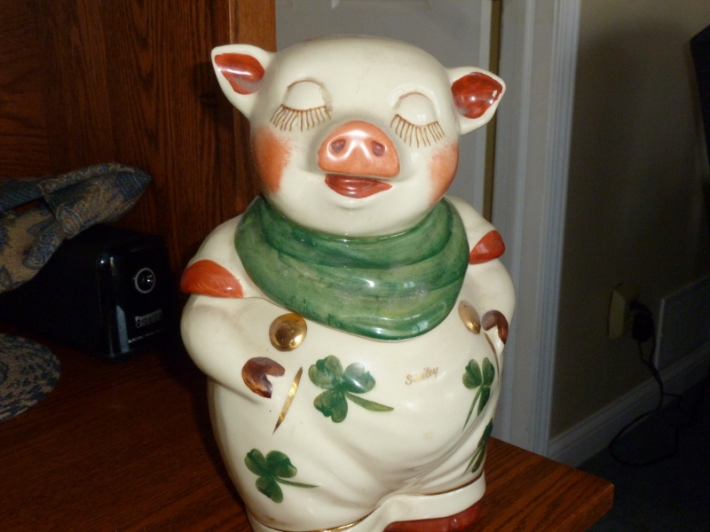Shawnee "Smiley" Cookie Jar, Green clovers and golf flake embellishments. One small chip on an ear.