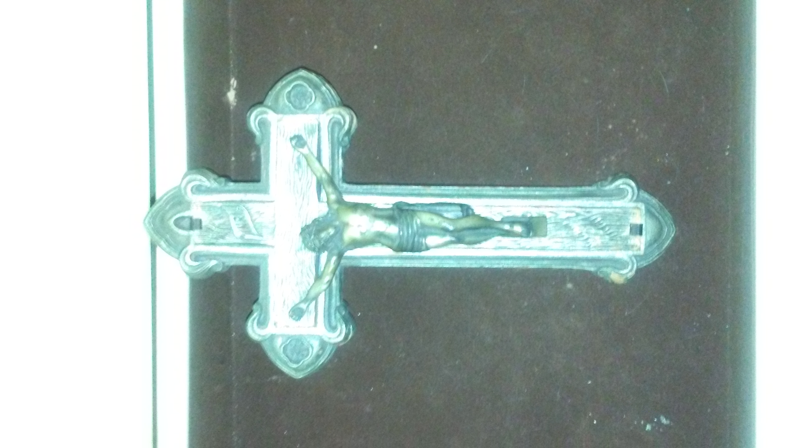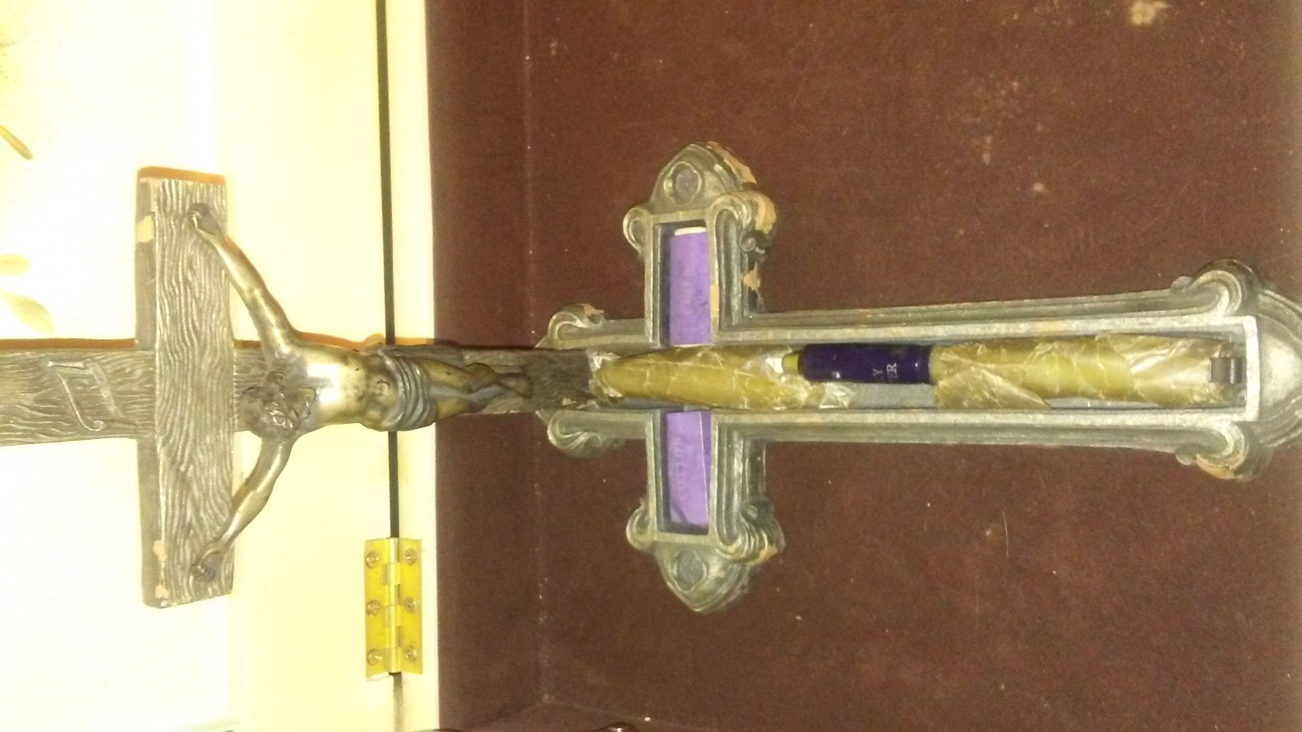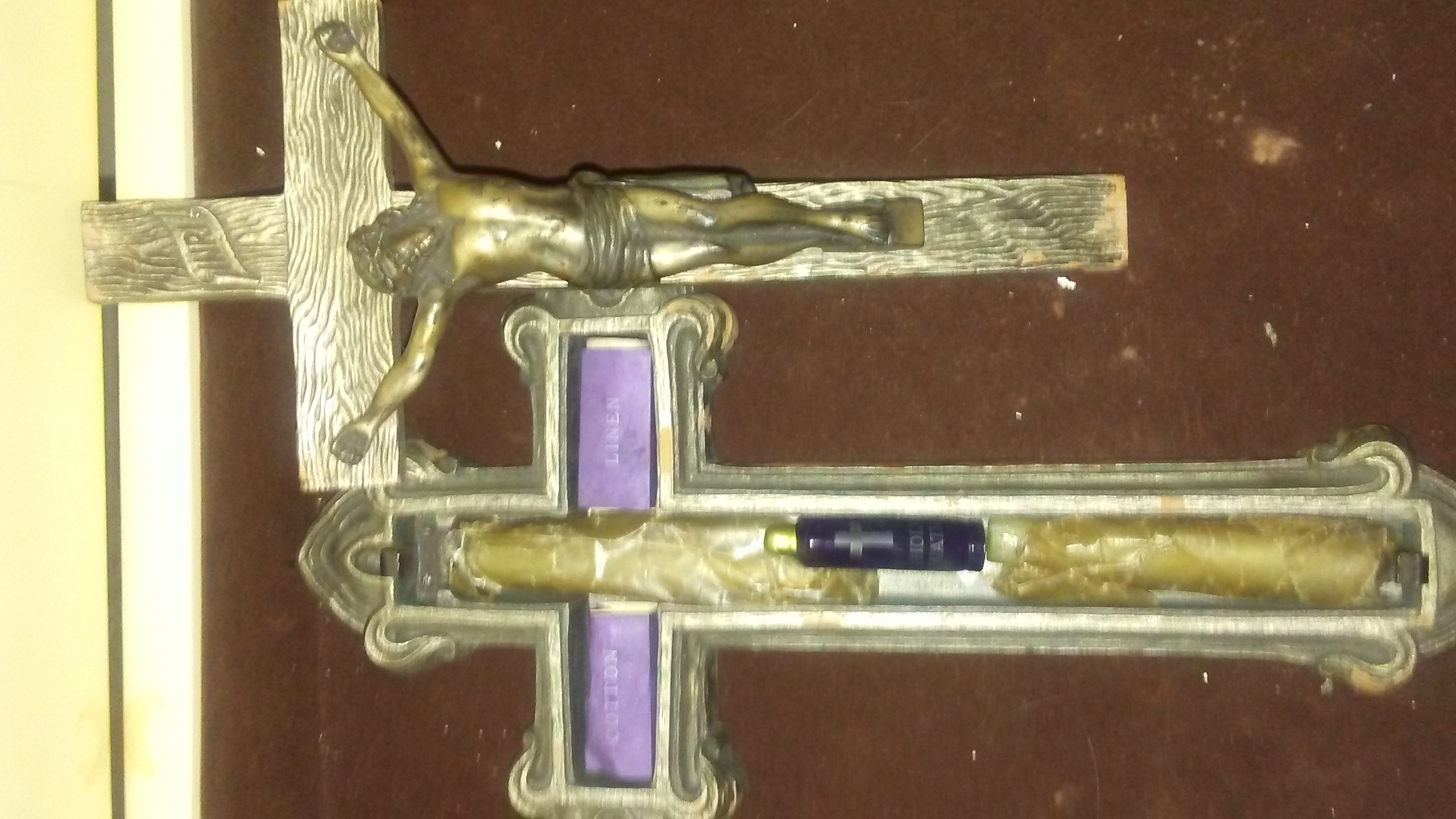 Vintage sick call crucifix with cotton, linen 2 candles and holy water bottle.