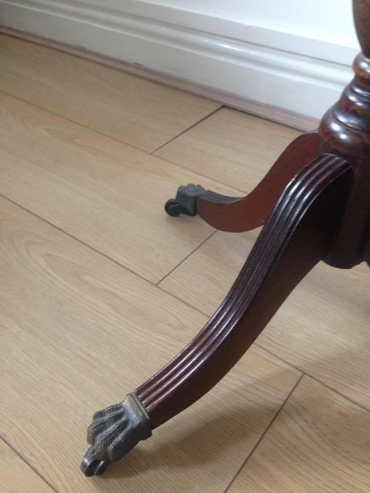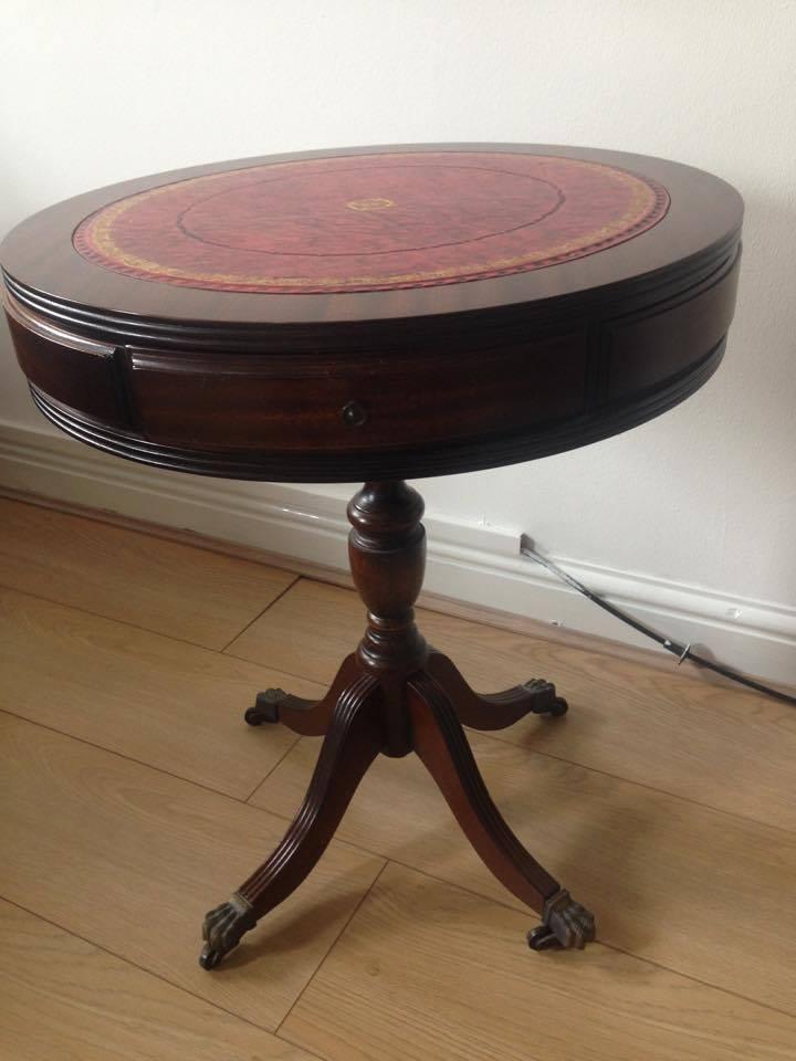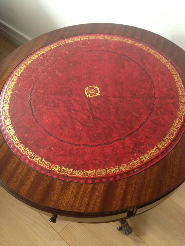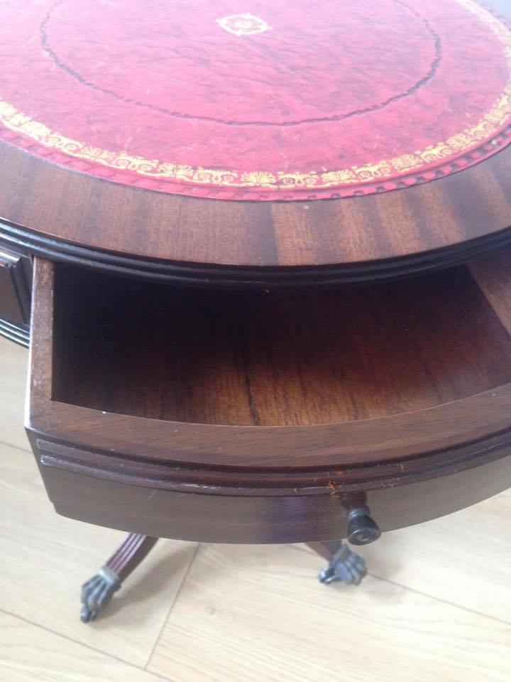 SIde round table/drum table with 2 small drawers, 4 cast iron claw like leggs. The top appears to be leather. No markings/labels. The bottom of the drawers have 19A and 19 in a black marker (maybe it was refurbished)?. Got it for free from a relative.